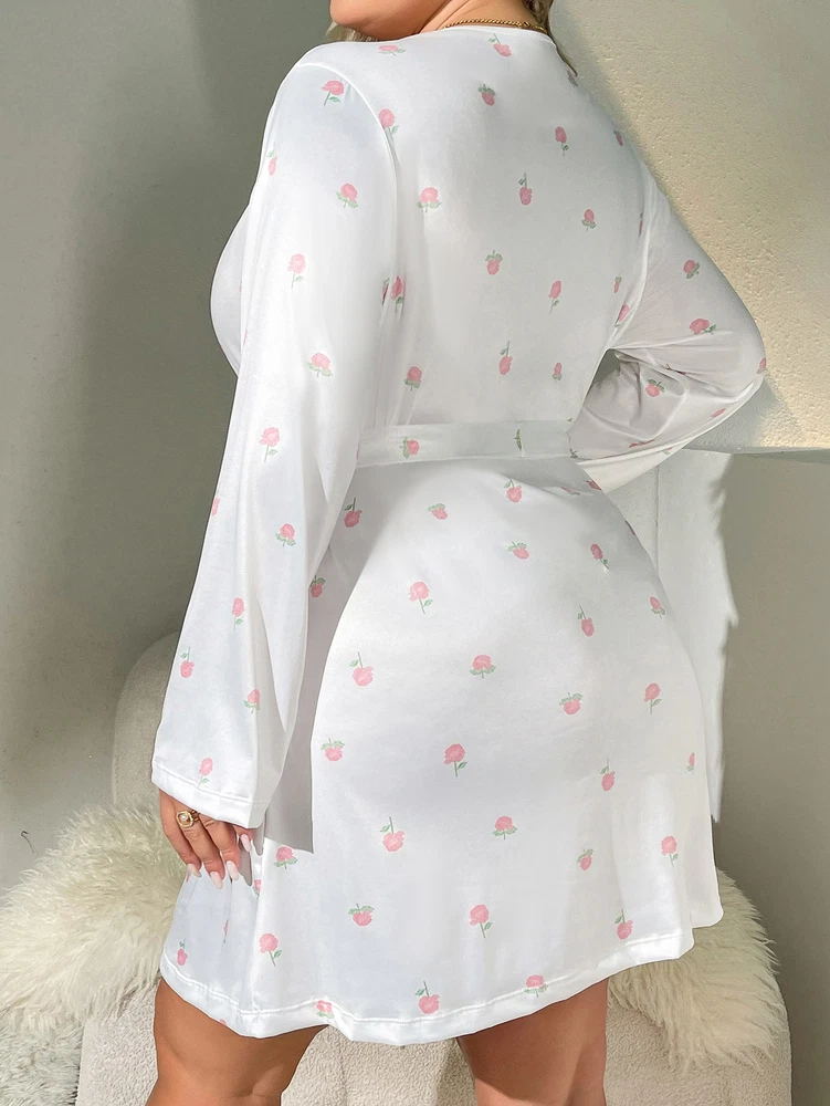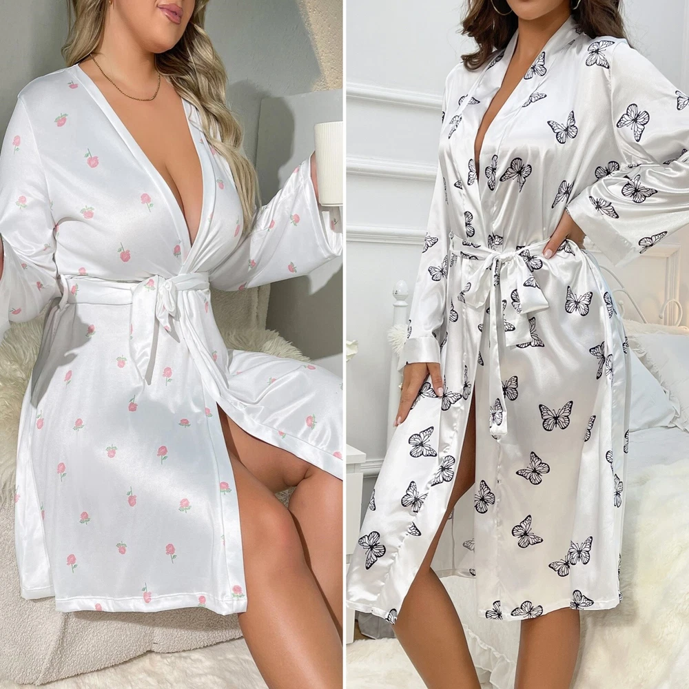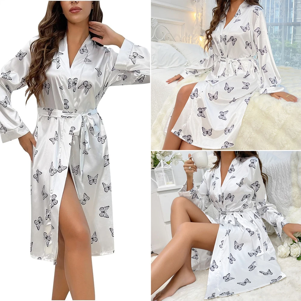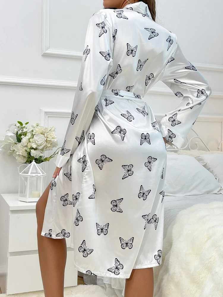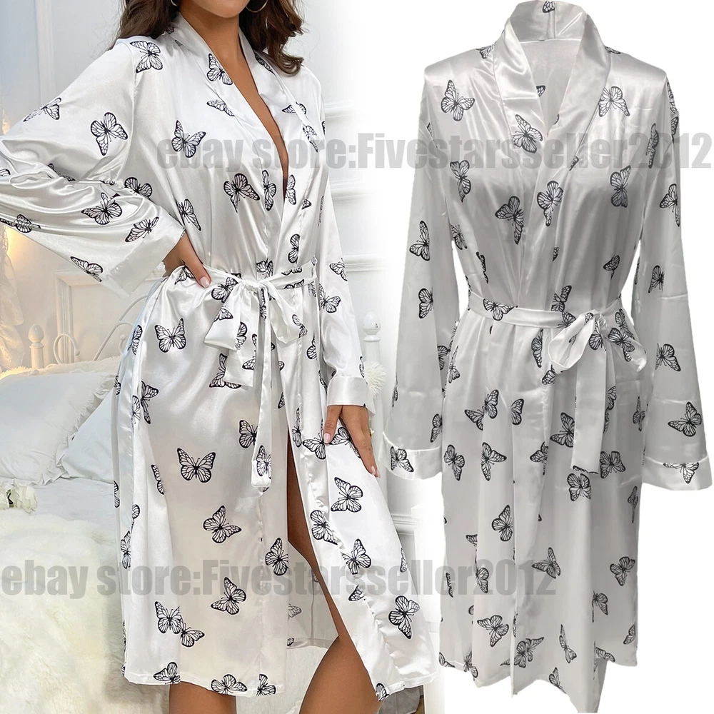 About this item: Butterfly print, full length sleeve, knee length, belted, open front Soft fabric has some stretch Model Measurements: height: 68.9inch; bust: 35.4inch; waist: 24.8inch; hips: 36.6inch. Wear: S Suitable for weddings, spa party, gifts, sleep, pajama party, loungewear, nightwear Please refer to size guide carefully before purchasing at below description