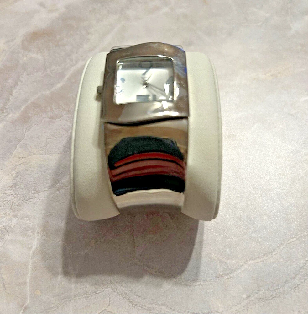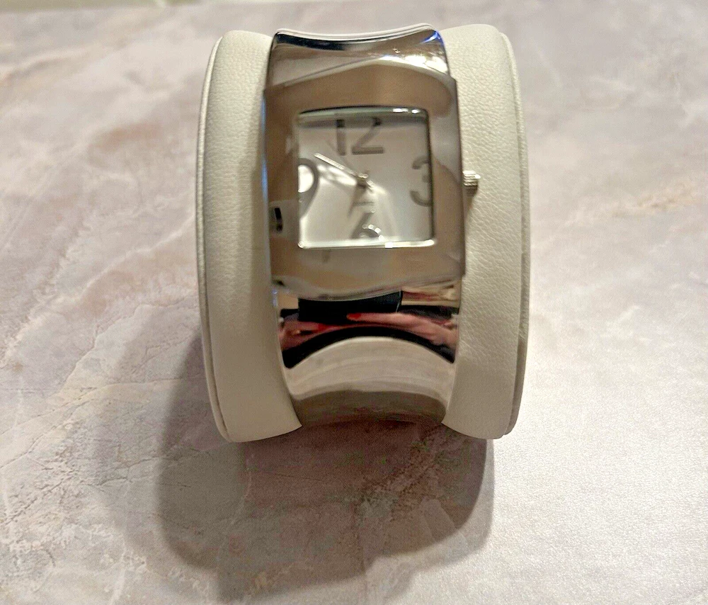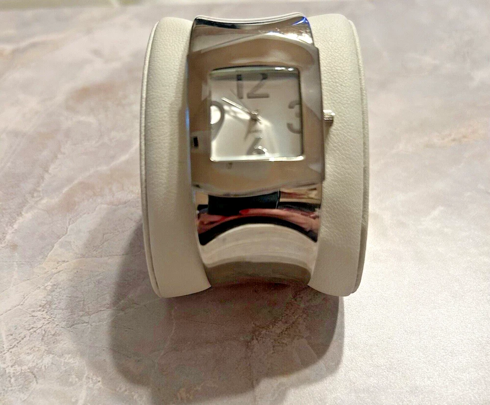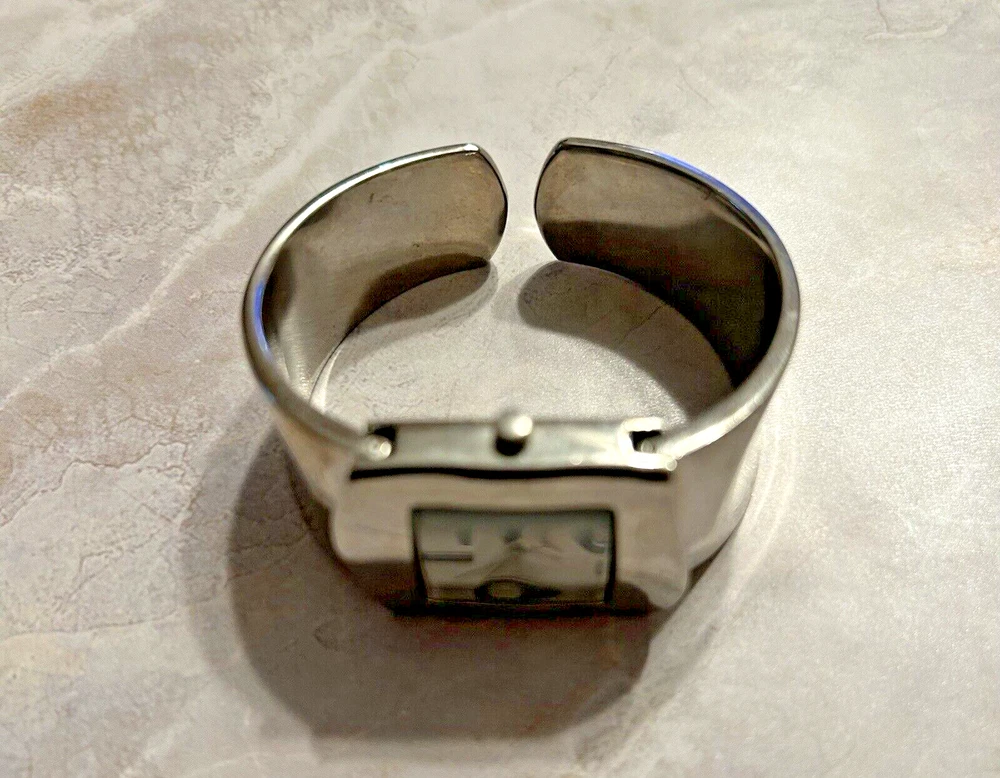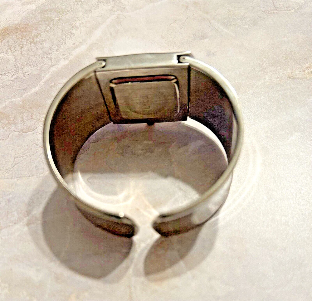 This beautiful women's wristwatch is a vintage piece from Japan with a silver quartz movement. It features a hinge closure and a wavy silver band/strap that complements the silver case color. The watch is analog and does not come with original box/packaging or papers. Perfect for accessories collectors and vintage watch enthusiasts, this piece is a great addition to any jewelry collection. Its classic design and vintage charm make it a versatile accessory that can be worn with any outfit. Get your hands on this unique silver cuff watch bracelet now! Works great just needs new battery.