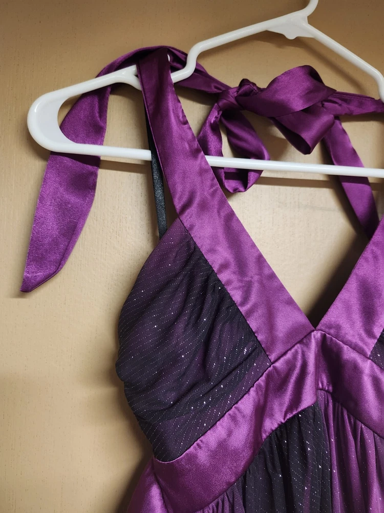 Women's size small, Byer California brand, purple and black colored, glittery, sparkly, halter neckline wrap dress prom dress. 100% polyester material.