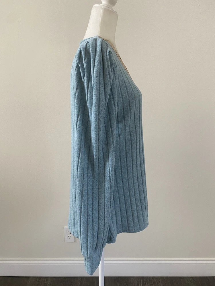 Elevate your wardrobe with this stunning sky blue and beige lace V-neck sweater. The tight-knit polyester knit fabric offers comfort and stretch, making it perfect for any occasion, whether it's a party, a casual outing, or a business meeting. The long sleeves and breathable material make it suitable for all seasons, while the regular fit and flattering neckline ensure you look your best. This lightweight sweater is machine washable and features a solid pattern that is perfect for pairing with your favorite jeans or dress pants. It's a versatile piece that is perfect for any fashion-forward woman. Don't miss out on this amazing addition to your wardrobe! Pit to Pit: 19.5”; Length: 26”. Condition of the item is Pre-Owned in great shape! Shipped asap by USPS ground advantage mail.