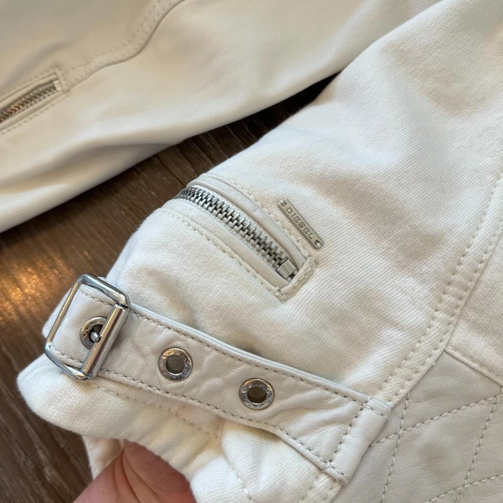 💌 Vintage Diesel leather jacket in a classic biker style 💌 Soft white leather with silver-tone zipper detailing💌 Quilted stitching on shoulders and upper sleeves💌 Asymmetrical front zip closure with snap collar💌 Two zippered chest pockets and adjustable waist tabs-✨In perfect condition✨ ✨Fall jacket; winter jacket✨✨Made with sheepskin leather✨ - Elevate your style with this stunning white leather jacket from Diesel. Crafted from high-quality sheepskin leather, this short-length biker jacket features long sleeves and a full zip closure. The jacket is accented with button, quilted, buckle, zipper, and logo details, making it a unique addition to your wardrobe. Ideal for travel, party, or casual occasions, this jacket is a must-have for any fashion-forward woman. The jacket is dry clean only and is available in size S. It is perfect for fall and winter seasons and is made in India. Add this vintage piece to your collection and make a statement wherever you go.