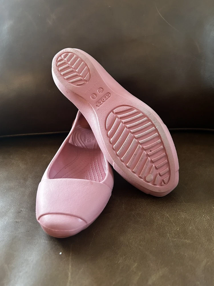These are women's size 6 Crocs flats in a slip-on loafer style. The shoes feature a round toe shape, flat heel under 1 inch, and a comfortable cushioned design with Crocs' iconic comfort. They are a versatile choice suitable for travel, activewear, casual outings, and workwear. The pink color with a red manufacturer accent adds a touch of style to the classic Crocs design, making them a limited edition item perfect for walking or driving activities in any season.