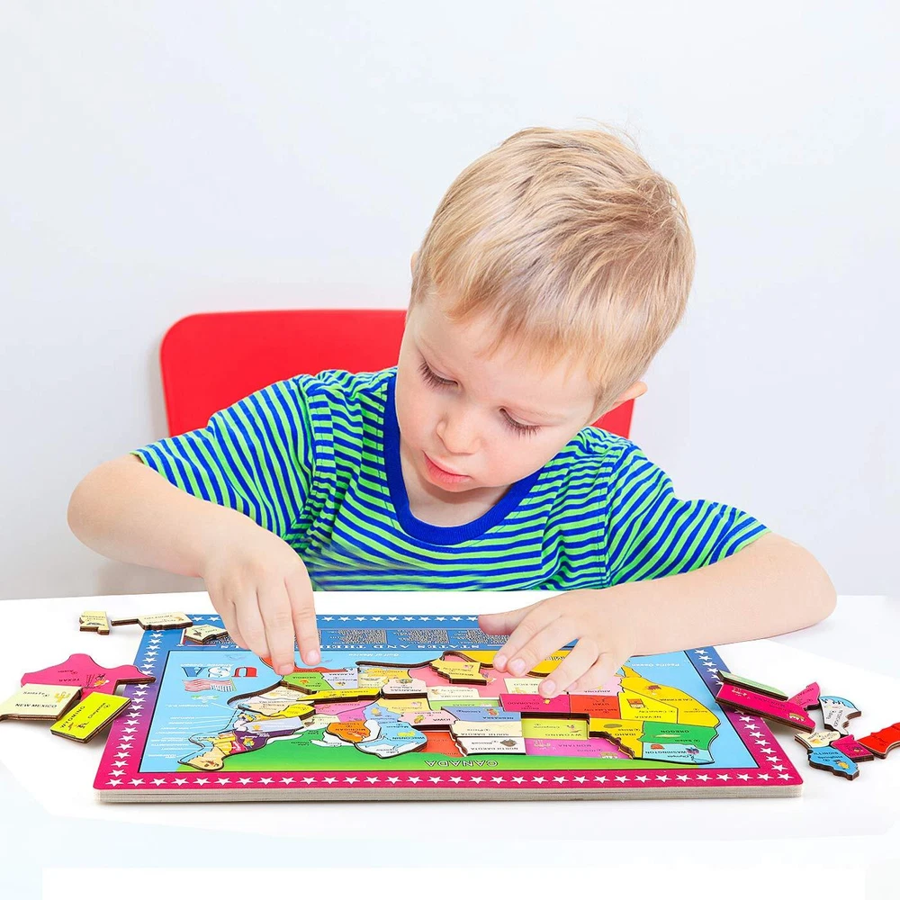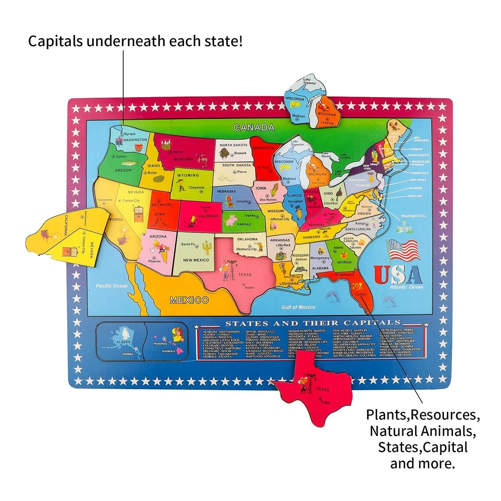 The Wondertoys USA Map Puzzles ideal for teaching children to explore the geography of the United States, educational Map Learn about all 50 states, capital cities, general knowledge. Specification: Material: Plywood with Non-toxic Size: About 11.8X15.75 inches Weight: About 630g Type: USA map puzzle Gender: Suitable for 3 year plus WHY CHOOSE US? WE CAN TELL YOU. The important things are said three times, thick thick thick pieces, sturdy Wooden. The map puzzle pieces are easy for small hands to handle, perfect for any little puzzler. Colorful painting includes exciting and educational information about the geography and fun facts of the United States. Good educational puzzle, inventive crafts, pretend play, and games, inspire creativity and imagination in children throughout the world. With everything we create, we hope to encourage: Free play Creativity Imagination Learning Discovery 46 Pieces USA Map Puzzle: United states puzzle made of sturdy wood, smooth wood pieces fit nicely, raised pieces for easy lifting, handwriting lined text under pieces. Printing is clear. Edges are cut well. Size about 15.75 x 11.81 x 0.39 inches. Encourages Curiosity: Where do you like to travel? Pick the wondertoys united states puzzle up, and find your favorite place to travel. Each state also has a little cartoon of what it's known for, like Old Faithful between Wyoming and Montana, your children will be interested in who lives where.Encourage inquisitive children to explore the geography, and more stories waiting for them to explore and discovery Educational Stem Toy: This united states puzzle is perfect for classroom learning or home play time! Use this beautiful usa geography puzzle to help them establish faster and more interactive teaching in geography course. Its more accurate depiction of the states with capitals,facilitating easier learning for students! Perfect Christmas Gift: US map puzzle have 50 beautiful illustrated, improve geographical knowledge, encourages problem solving, interaction and creative storytelling. Stimulates a child’s brain, enhances critical thinking, and promotes independence! A great gift for birthday party, Halloween, Thanksgiving Day, Christmas and New year Your Children's Safety is Our Number 1 Priority: The usa map puzzle are tested for safety by a third-party service. Approved ASTM&CPSIA test. Lead-free and BPA-free. This us map puzzle is Intended for children age 3 and up. We also offer you 100% Risk-Free Satisfaction Guarantee to let you buy with confidence. Any unsatisfied purchasing experience regarding any problem, feel free to contact us by email