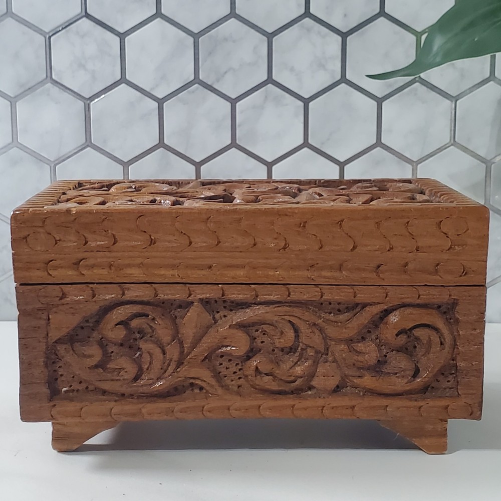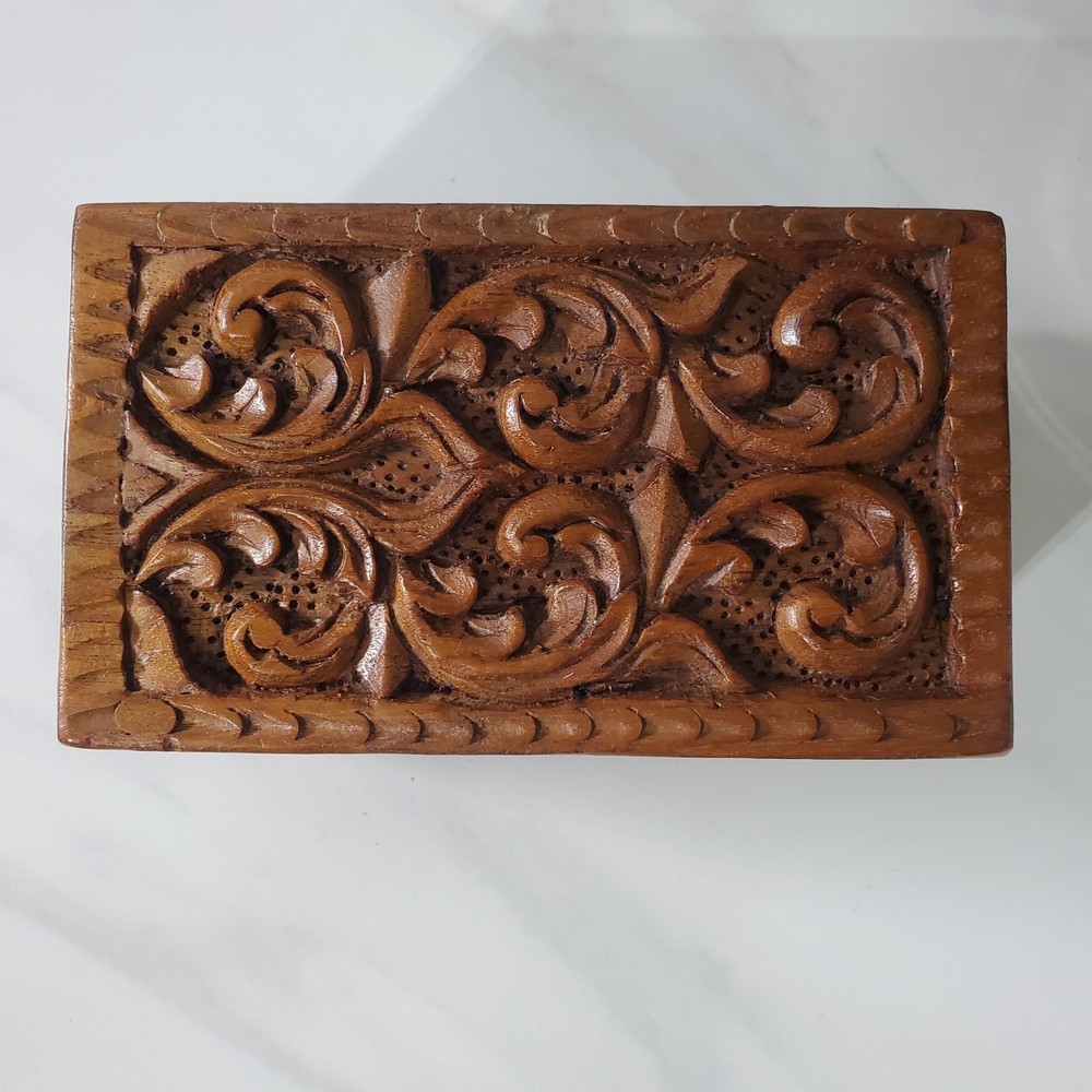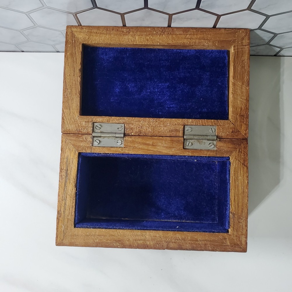 Vintage Hand Carved Ornate Wooden Blue Velvet Lined Jewelry Keepsake Box In good condition There is a name written on the bottom of the box Please view all photos for condition and measurements Thank you for viewing our products. PRODUCT SOLD AS IS. Please Message With Questions Prior To Purchase. If you have an issue with any of our items please reach out to us prior to contacting eBay. Thanks! Please note: We do sell new and used items. Our used items are pre-owned / pre-loved & may show signs of wear. Please view all photos for details, size, & imperfections as they are a form of the descriptions in addition to what is stated in the description section. We will do my best to inspect each item to find the best quality items possible. We do not include/replace batteries in any of our items unless they have been supplied by the manufacture and are in new unused condition. If an item is sent to you NEW / SEALED and you open it or remove the tags, it is NO LONGER ELIGIBLE FOR RETURN. Opened items / Removed tags - Means the item is NO LONGER in its original state and can no longer be sold as NEW. -Thank you for your understanding We are often asked about shipping cost. We are excited about your purchase and take pride in your package arriving to you undamaged. We wrap and cushion all necessary items prior to shipping which adds weight to your package. Unfortunately, this is not optional. Thank you for your understanding. We do not accept returns or issue refunds however in the event we do accept your return or issue a refund we do not reimburse your original shipping fee. Due to how eBay handles international shipping we do not accept any international returns. Thanks again!