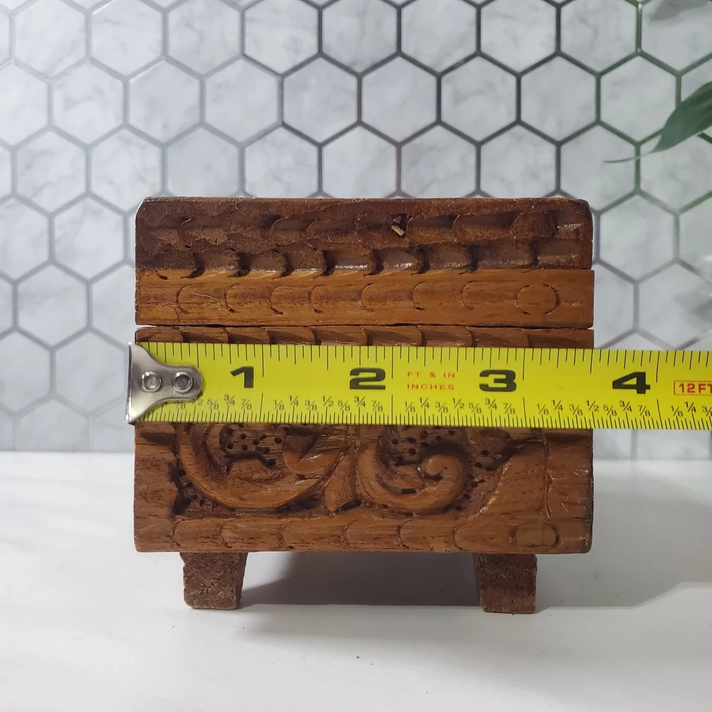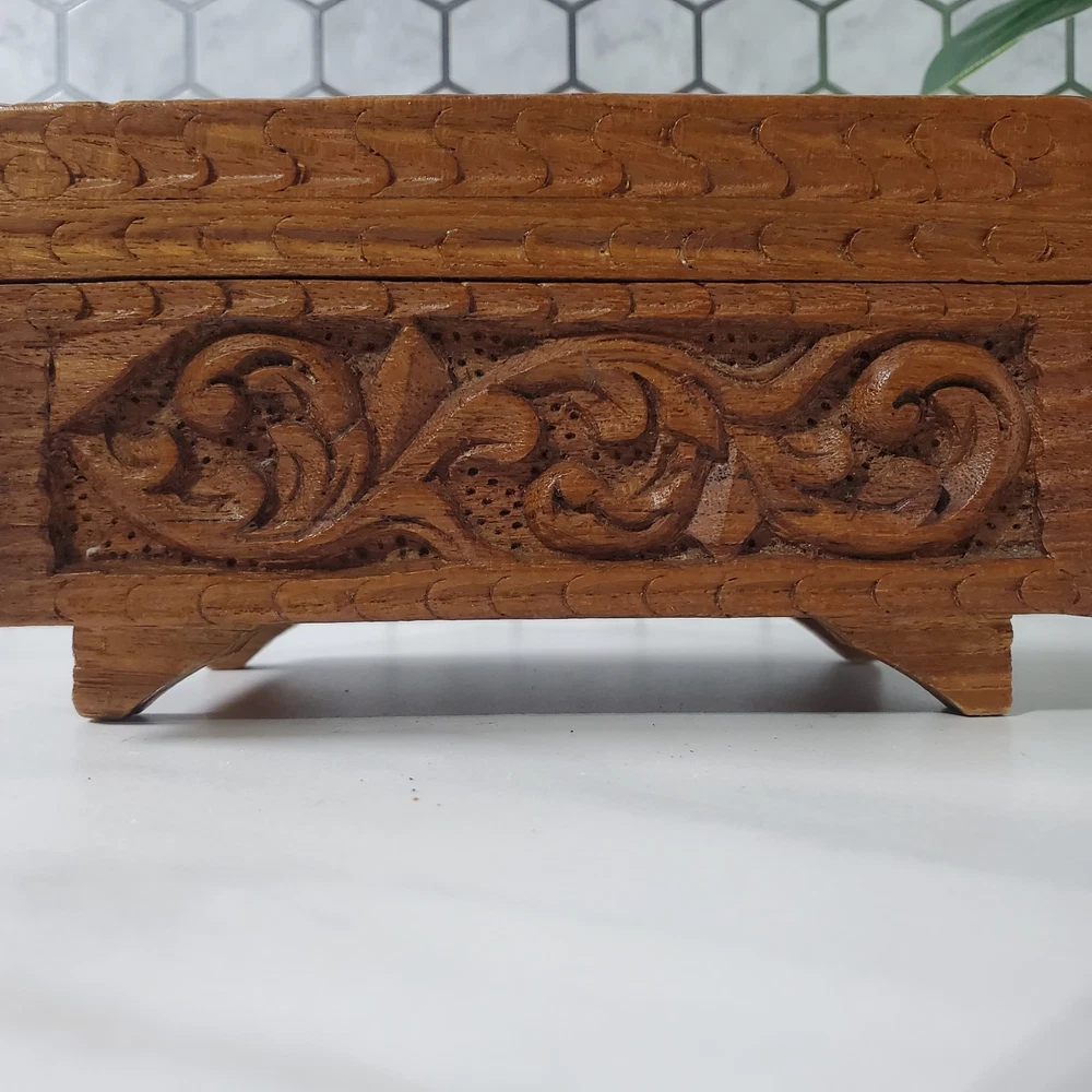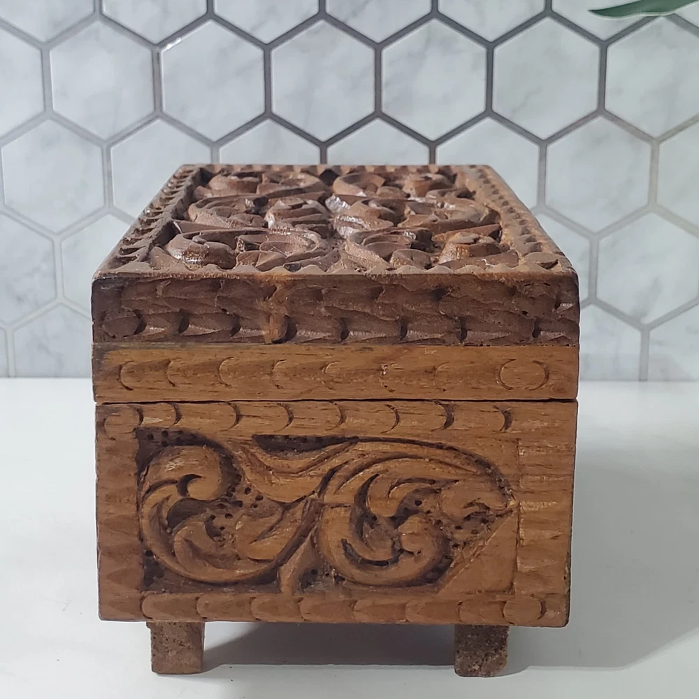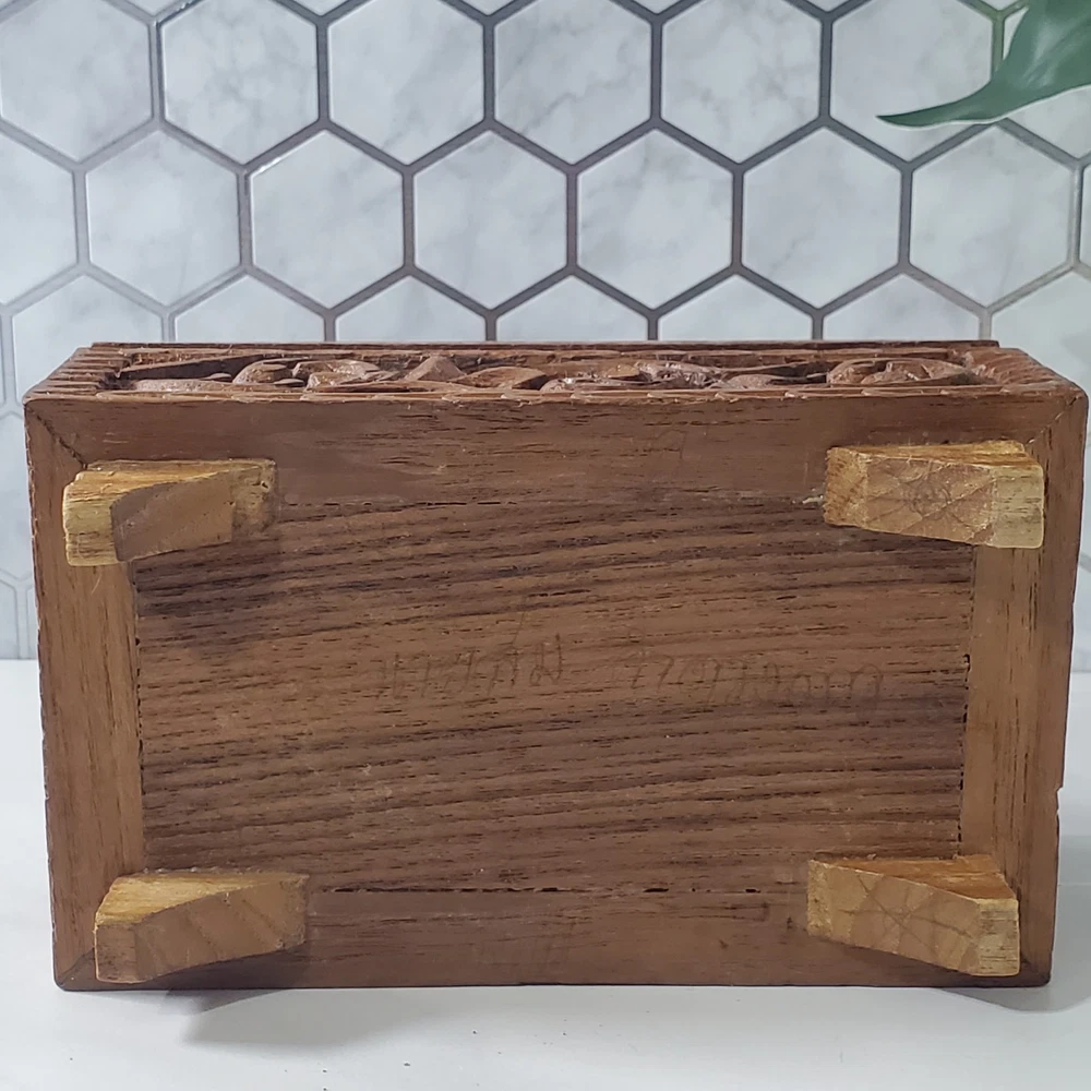 Vintage Hand Carved Ornate Wooden Blue Velvet Lined Jewelry Keepsake Box In good condition There is a name written on the bottom of the box Please view all photos for condition and measurements Thank you for viewing our products. PRODUCT SOLD AS IS. Please Message With Questions Prior To Purchase. If you have an issue with any of our items please reach out to us prior to contacting eBay. Thanks! Please note: We do sell new and used items. Our used items are pre-owned / pre-loved & may show signs of wear. Please view all photos for details, size, & imperfections as they are a form of the descriptions in addition to what is stated in the description section. We will do my best to inspect each item to find the best quality items possible. We do not include/replace batteries in any of our items unless they have been supplied by the manufacture and are in new unused condition. If an item is sent to you NEW / SEALED and you open it or remove the tags, it is NO LONGER ELIGIBLE FOR RETURN. Opened items / Removed tags - Means the item is NO LONGER in its original state and can no longer be sold as NEW. -Thank you for your understanding We are often asked about shipping cost. We are excited about your purchase and take pride in your package arriving to you undamaged. We wrap and cushion all necessary items prior to shipping which adds weight to your package. Unfortunately, this is not optional. Thank you for your understanding. We do not accept returns or issue refunds however in the event we do accept your return or issue a refund we do not reimburse your original shipping fee. Due to how eBay handles international shipping we do not accept any international returns. Thanks again!