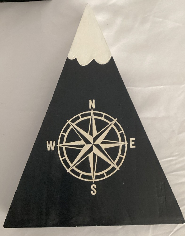 The Wood Mountain Decor Black/Gray walk by face / Compass sign is a handmade piece perfect for the farmhouse or wilderness-themed living space. Featuring a wood grain pattern with a triangle shape and blue color, this small decorative piece is great for teens and adults looking to add a touch of nature-inspired design to any room in their home. The free-standing sign is hand-painted with a decorative finish, making it a unique and eye-catching addition to your home décor.