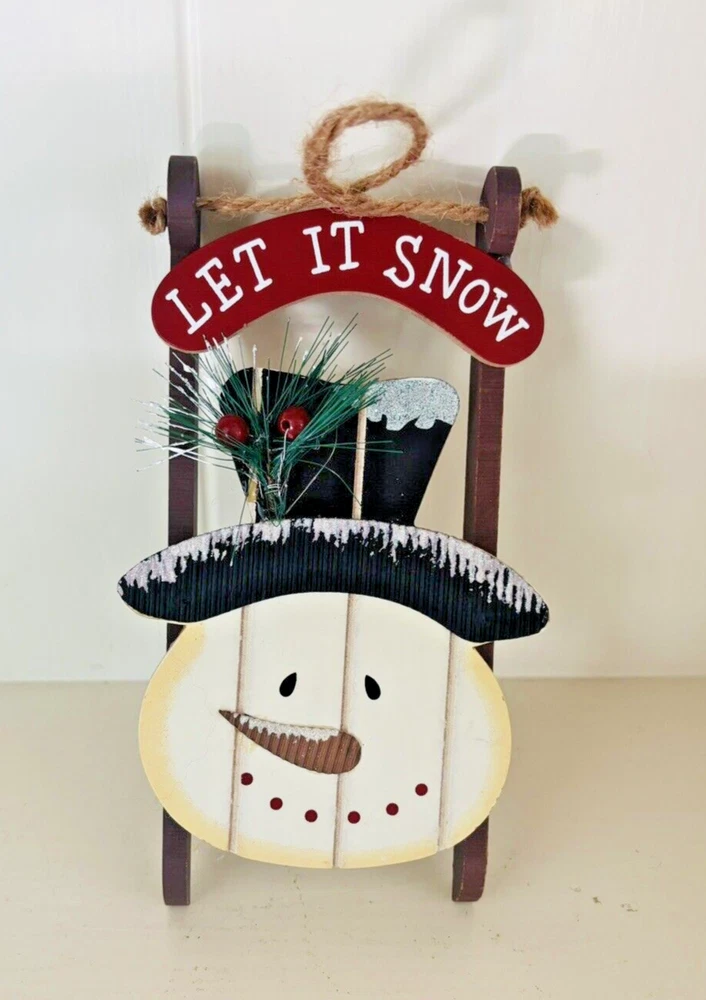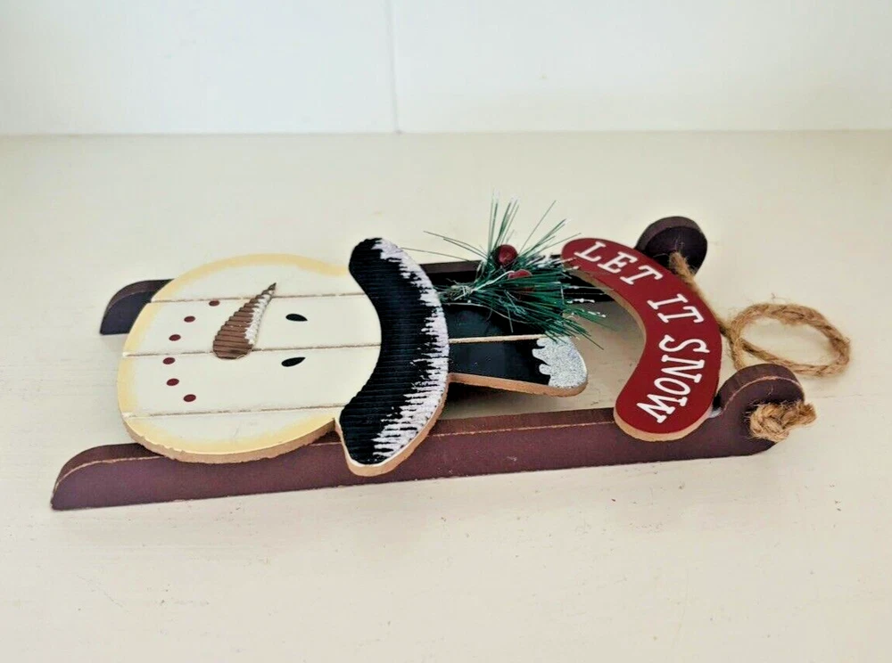 This adorable rustic wood snowman/sled ornament measures approximately 7" x 3-3/4" x 5/8" and is in terrific used condition. It is adorned with glitter and a little spray of bottle brush needles and holly beads. A darling piece of holiday decor ready for display. Feel free to reach out with any questions. I take great care when packaging and ship within one day of purchase. Thank you so much for stopping by! **Please understand this is a vintage and/or used item that may show wear due to age and use. This could include fading, scuffs, scratches, cracks, chips, crazing, marks, nicks, paint/detail loss, etc. Please review all photos before purchasing. All items are sold AS IS.**
