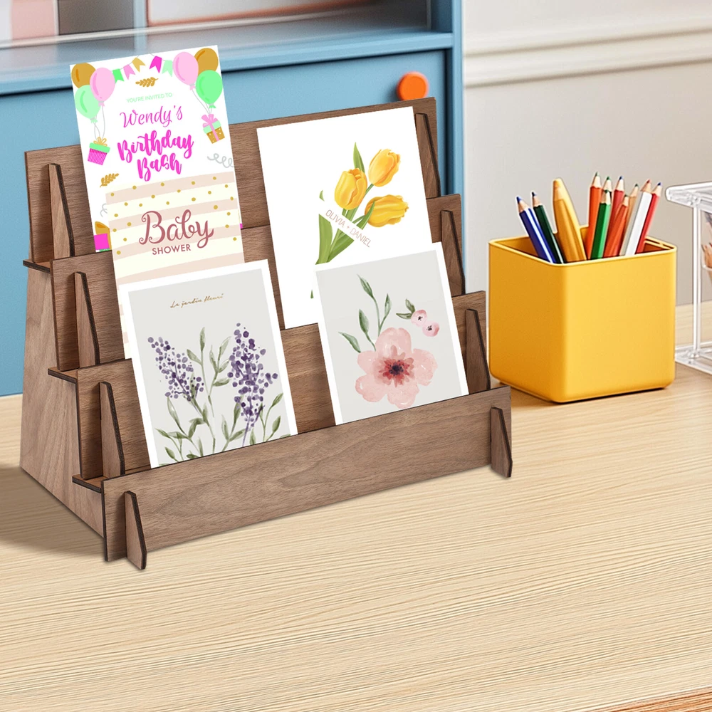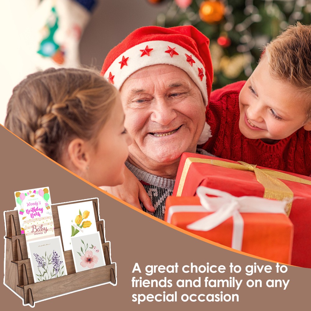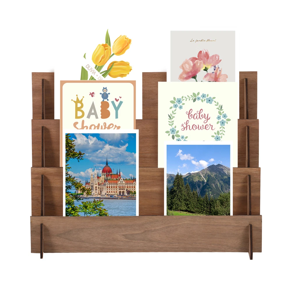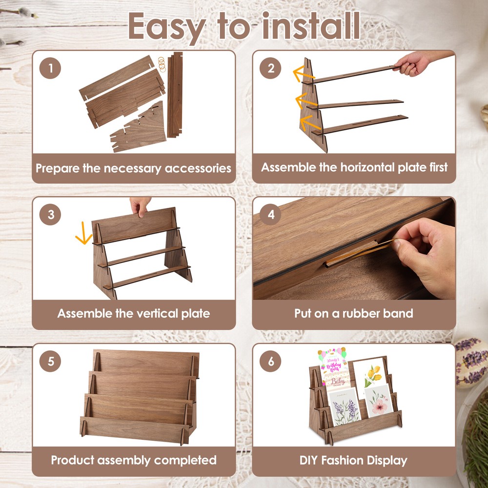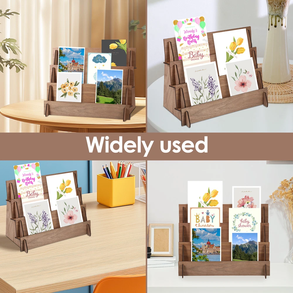 Parts List: 1 × Display Stand Highlight description: Strong and Sturdy: Our tiered display stand is made of premium bamboo and acrylic, which has high strength and stability. It can withstand a certain weight of greeting cards and postcards and will not be easily deformed or damaged during long-term use Easy to Install: This greeting card display stand is easy to assemble, the assembly process is easy to understand and can be completed in just a few minutes; in addition, the greeting card display stand is portable, you can move it flexibly to meet your different needs and occasions Suitable Size: Measuring about 40×19.5×28cm, the 4-tier design of the wooden display rack provides plenty of space for displaying your greeting cards; its suitable size ensures that each card is easy to see while not taking up too much space on the counter or table What You Get: Our package includes 1 greeting card display stand, use our greeting card display stand to make your room neat and clean, suitable for storing books, documents, literature, postcards, greeting cards and so on, it is a multi-purpose display stand Suitable for Many Occasions: Not only can it be used for weddings and birthdays, it can also be used to display holiday cards during the festive season, or as a daily greeting card and postcard collection rack. It can also be used to display event notices, blessing cards in schools, offices and other places Detailed description: Description: In the form of shelving, the vertical space is fully utilized and the desktop or floor space is greatly saved. It does not take up too much floor space, making the room look cleaner and more orderly Key Feature: The four-story structure provides ample space for storage, which makes it easier to find specific greeting cards or postcards and to manage the collection Specification: Texture: Wood Size: 40 × 19.5 × 28cm Note: 1. There may be slight differences between the picture and the actual color of the commodity. We will try our best to show you the exact color. 2. Please allow slight dimension difference due to manual measurement.