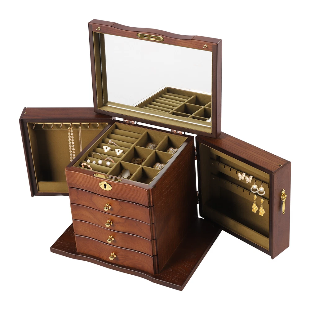 Wooden 5 - Layer Large 4 Drawers Jewelry Box Fit Wowen With Mirror Organizer Box Description This Wooden Jewellery Box is a perfect choice for your life. Multi-functional design will satisfy your different needs of storage. What's included? 1 x Wooden Jewellery Box Weights & Dimensions Weight:2.7kg Size: 27x19.2x24.3cm / 10.62x7.55x9.56inch Feature: [Elegant and Durable] Made of durable and high-quality solid wood and MDF with veneer and painting, which makes you enjoy all the functions of storage box. Because many compartments and functional parts are folded and stored together, a lot of space is saved. [Velvet Interior] The drawers and compartments are lined with soft velvet material, which can ensure that your jewelry is not affected by scratches or dents, so that you can safely store your jewelry. [Large Capacity Jewelry Box] This box includes a built-in mirror, 4 pull out drawers, 2 side compartments, and a top drawer. Contains earring hangers, ring rollsMetal jewelry hook for storing some other Jewelry. Enough space to satisfy your collection of various jewelry. [Safe Lock] The lid is designed to lock all drawers and cabinets firmly to protect your rings, earrings, necklaces, bracelets, watches and other jewelry accessories. [Meaningful Gift] Beautiful appearance and practical function, safety lock with key adds elegance and security. Ideal gift for Valentine's day, Mother's day, Thanksgiving, Christmas, birthdays and weddings. (Note: watches and jewelry are not included.) Specifications: Colors: Brown Layer: 5 layers+2 swing-out cabinets Types: with mirror Material: MDF+Wooden Lock: Key lock The first drawer : 6 slots + 1 ring slot The second drawer: 6 slots /Each size:4.6*4.6cm/1.81*1.81inch The third drawer: 4 slots /Each size: 7.1*7.1cm/2.79*2.79inch The fourth drawer: 3 slots /Each size: 4.6*14.3cm/1.81*5.62inch The fifth drawer: 1 slot/Size: 14.3*14.3cm/5.62*5.62inch Payment Delivery details Terms of sales About us Contact us Payment We accept ebay payment 。 Fees such as import duties, taxes are not included in the item price or shipping costs. These charges are the buyer's responsibility. Delivery details Shipping: 2-9 working days to: USA Terms of sales We maintain high standards of excellence and strive for hundred percent customer satisfaction. Feedback is very important to us. We hope that you contact us immediately before you give neutral or negative feedback, so that we can address your concerns. It is impossible to address issues if we do not know about them! About us Your satis faction is our ultimate goal. We work hard to earn your trust and future business. Our certified technicians have tested each item before shipping. The unit comes with 1 year limited warranty on all manufacturing defects. a) If you receive a defective item, you may return it or ask for a discount. Please contact us within 14 days after you receive the package. b) What you returned must be intact and in its original packaging as re? u. Customer is responsible for shipping costs of the returned item. c) We will cover the cost of shipping back t with the shipping rate indicated in the registration page. We will send you a new unit or refund the full payment you paid. Thank you. Contact us Business Hour Business Hour: Monday To Friday: 8:30 AM to 5:00 PM (Beijing China time) Due to time zones, our reply to your questions may not be immediately. But within above working time, we will reply your email within 24 hours. If it's non-workdays, please kindly be patient and wait till Monday. Please contact us with ebay message. Please feel free to contact us if you have any questions. Monday To Friday: 8:30 AM to 5:00 PM (Beijing China time) Due to time zones, our reply to your questions may not be immediately. But within above working time, we will reply your email within 24 hours. If it's non-workdays, please kindly be patient and wait till Monday. Please contact us with ebay message. Please feel free to contact us if you have any questions.