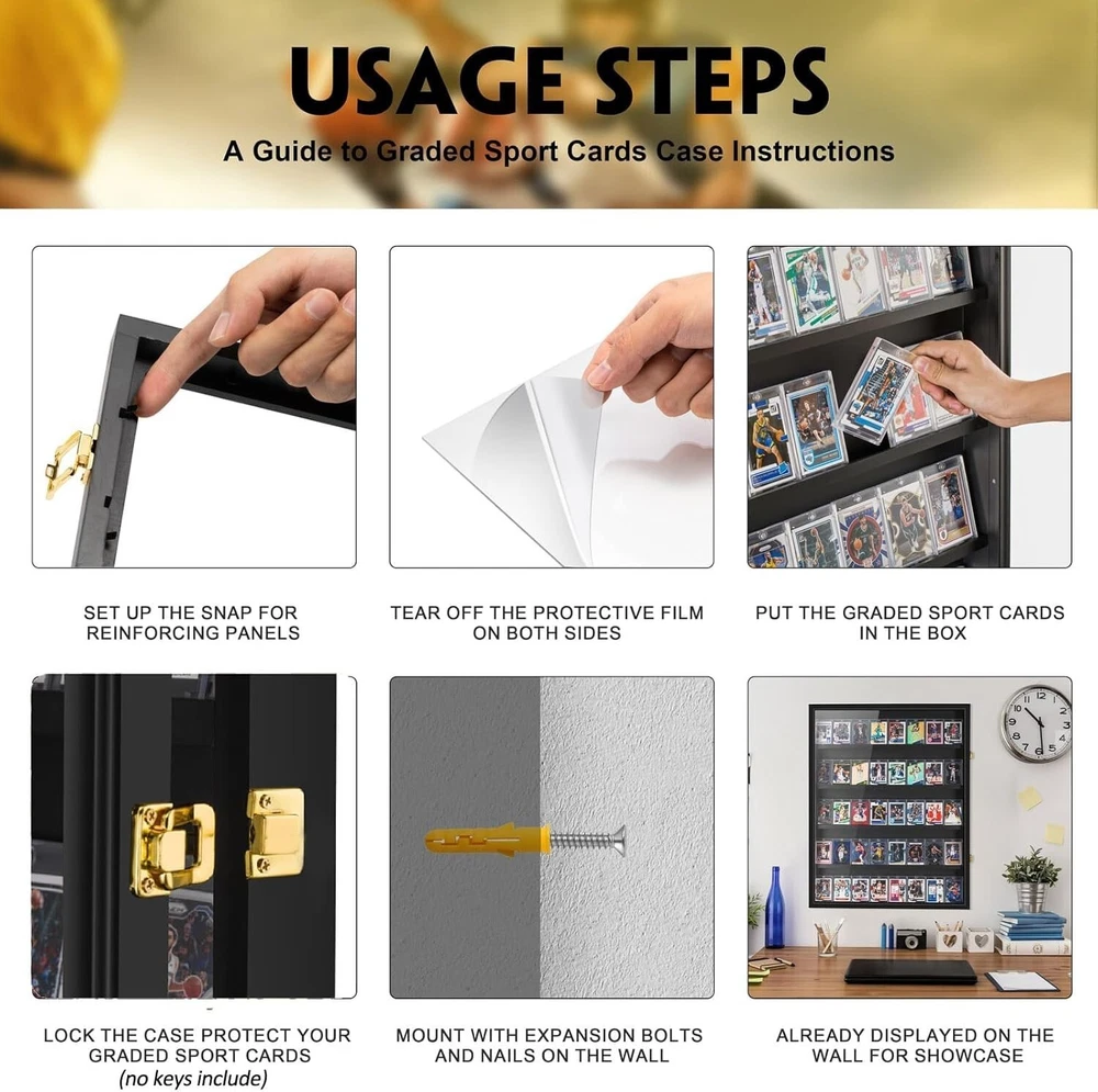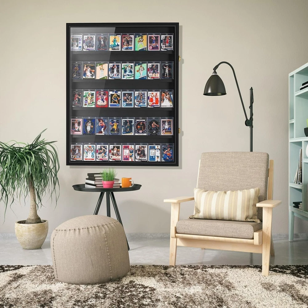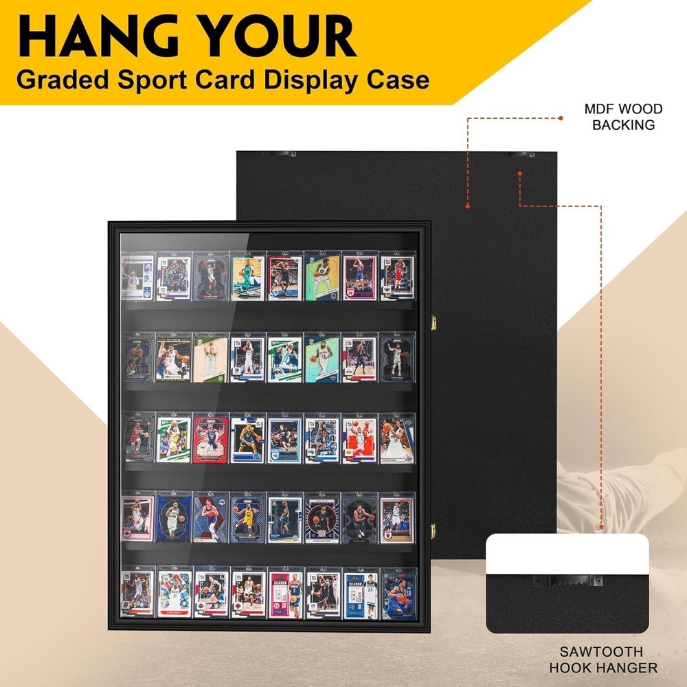 Baseball Graded Sport Card Display Case Large 40 Cards Display Case Wooden Wall Cabinet for Basketball Football Hockey Trading Cards Display Collectibles Souvenirs Wood 【ELEGANT DISPLAY FOR SPORTS CARD】- This sport cards display case is designed to showcase 40 normal sport cards or 35 graded cards in a sleek and sophisticated way. The case is made of high-quality wood with a smooth wood finish, and features clear acrylic panels for easy viewing and protection against dust and damage. (Note: sport cards not included) 【GREAT FOR SPORTS CARD COLLECTORS】- Whether you're a collection enthusiasts of football, baseball, basketball, hockey or trading cards, this display case is the perfect way to show case your collection of sport cards. The case is designed to fit most standard size of trading cards case, and we designed baffles to go on the front of the shelves to prevent cards droping. 【EASY TO ASSEMBLE AND HANGING】- The baseball cards display case comes with all the necessary hardware for easy assembly and hanging. The clear acrylic panels with 92% transparency, 98% UV protection, prevent your cards from oxidising or fading, our accessories include mounting screws, drywall anchors and mountain buckles for easy hanging. 【STYLISH DESIGN】- The black wooden finish and clear acrylic panels of the graded sport card case make it a stylish addition to any home or office. The elegant design is perfect for displaying your collection in a way that is both practical and attractive, and the graded sport card case is sure to impress your guests and visitors. 【GREAT GIFT IDEA】- This graded sport card display case makes a great gift for some games enthusiast. Whether it's for a birthday, anniversary, or other special occasion, this display case is sure to be a hit with anyone who loves the collection of sports cards. So why wait? Order your graded sport card display case today and start showcasing your collection!