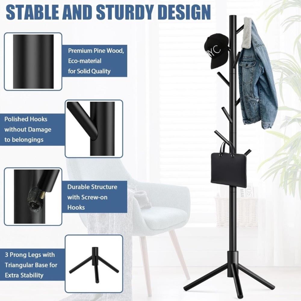 This wooden coat rack stand is perfect for keeping your coats, hats, scarves, jackets, backpacks, bags, and umbrellas organized and in one place. With its free-standing design, it can easily be placed in any room of your home and has a capacity of 8 hooks. The rack is made from beech solid wood and features a painted finish, making it a contemporary and stylish addition to your home decor. The coat rack stand is sturdy, durable, and can support a variety of items, making it a versatile addition to your home organization. It is suitable for kids, teens, adults, and babies heights because it is adjustable. The rack is 69 inches high and has a branch hook style, making it easy to hang and organize your items.
