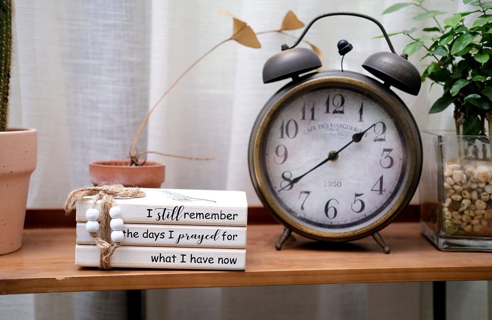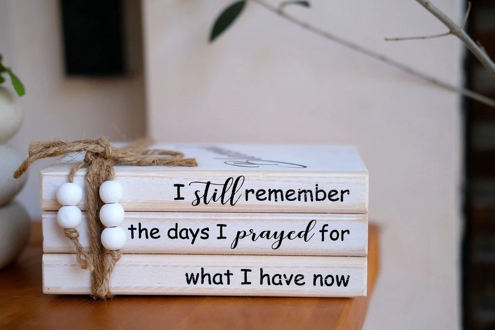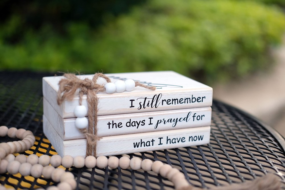 Stack of 3 Faux Books for Decoration "Blessed" printed on top book face, while books' spine has warm inspirational quote "I still remember the days I prayed for what I have now" Features ✔Silkprinting on sturdy solid wood, never to fade off ✔Unique design -- printing on both book top face and book spine ✔Exquisite beaded twine adds more elegant farmhouse touch ✔Great surprising gift to a new homeowner, friends, family members by adding a gift wrap and a personalized message! ✔Ideal for modern home decor, display project, interior design, sketch book or art journal. Specifications SIZE: 7.5L x 5Wx 3H Inches/ 19L x 13W x 7.5H CM ( including twine & beads ). WEIGHT: 1.2lbs / 0.53kg Package Included 1 x Wooden Decorative Book Stack 【HANDCRAFTED WOOD BOOK STACK】This farmhouse stacked books decor consists of 3 books made of solid cedarwood. White painted with rustic distressing finish. "Blessed" printed on top book face, while books' spine has warm inspirational quote "I still remember the days I prayed for what I have now". 3 farmhouse wood books glued together, won't move to get loose, bookstack bound with rustic twine,the hemp rope's ends are threaded with white wood beads. 【IDEAL FOR HOME DECOR】This farmhouse inspired book stack is perfect for adding a cosy feel and bringing rustic and literary charm to your home. This farmhouse decor will look beautiful on a bookshelf, coffee table, mantle, tray, night stands, fireplace, entryways etc. Also ideal for modern home decor, display project, interior design, sketch book or art journal. 【UNIQUE GIFT IDEA】The decorative white book is a unique gift to match modern farmhouse or country themed decorations. Great surprising gift to a new homeowner, friends, family members by adding a gift wrap and a personalized message! It is simple but so warm, perfect as Chanukah, Christmas, Thanksgiving, wedding, anniversaries, birthday or housewarming gift. 【MATERIAL,SIZE】Made of solid cedarwood, good quality. Size is 7.5 L x 5 Wx 3 H inches(including twine & beads). 【WARM CUSTOMER SERVICE】We focus on natural style home decoration, hope our product bring warm and comfort to you. Please ensure its size can meet your demands before ordering!