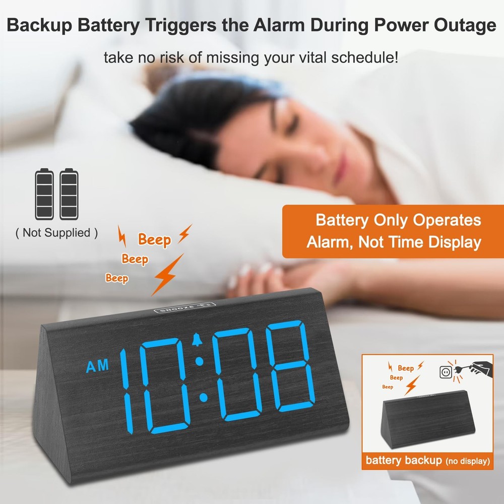 Wooden alarm clock with 1.8 in large big digits, time is easy to see without glasses, which is vision friendly for seniors and the elderly. Time display is 12HR and 24HR switchable. Modern clock simple to operate, setting the clock time only needs 2 steps, perfect for kids, youth, teen, adults and parents. A single manual DST button save your time on restting the clock for summer time and winter time, just press the DST button to have the time one hour forward or backward in one step. No resetting needed. Battery backup alarm clock for power cut, time will not display but the alarm will goes off on the set time with just battery power. 5 level dimmable alarm clock plus an OFF option so you can adjust the brightness per your need so it won't disturb your sleep. Alarm clock with USB Charger allows you to charge your ceelphone or iPad without looking for other outlet or adapter, a perfect bedside clocks bedroom. Alarm clock plug in wall for normal time display and the charging function, the adater is supplied so you don't have to look for the power adapter, which is 5V/1A. Bedroom alarm clock with 5 level adjustable alarm volume, no worring of the alarm sound too weak or too loud, you control the alarm volume at will. Digital bedroom clock with 9 minutes snooze and 2 minutes alarm, a dedicated touch snooze button on the top is easy to reach without opening your eyes, getting extra 9 minutes sleep is like a breeze. The alarm will last for 2 minutes if you don't snooze it or turn it off. Minimalist and stylish wood alarm clock for bedroom, living romm and office decoration, aesthetically beautiful and functionally easy alarm clock is also a decent gifts for yourself, your loved one and friends on Christmas, New Year, Fathers' Day, Mothers' Day, Thanksgiving Day. For students, this night stand clock is the best clock for their back to school day! Basic Wooden Alarm Clock with Easy to See Big Numbers: the 1.8 inches large numbers on this 6.6 inches compact alarm clock are super easy to read from across the room, no complex setting, easy to program, which is an ideal desk clock for kids, seniors, the elderlys and adults. 5 Level Dimmable Brightness Dimmer: the display brightness of this digital clock is 5 level adjustable plus an OFF option, which is vision friendly, no glaring light at night yet still bright enough by day. Time format is standard time and military time (12/24HR) switchable. Battery Only Operates Alarm for Power Failure: the battery function for this bedroom alarm clock will trigger the alarm during power outage, take no risk of missing your vital schedule. The display won't light up with battery power only. Requires 2 AAA Alkaline batteries (not included). Adjustable Alarm Volume with Snooze Button on the Top: the alarm volume is 5 level customizable from very low for light sleepers to extra loud for heavy sleepers adults. Alarm lasts for 2 minutes and a dedicated Snooze button on the top helps you get extra 9 mintues sleep easily. Plug in Alarm Clock with USB Charger: the bedside clock runs on electricity for normal time display and the AC adapter is supplied. A handy USB Charging Port helps you charge your smart devices and other gadgets without looking for your adapter and other outlet. Bedroom Accessories Wood Décoration: the concise and clean LED digits on the sleek wooden face make up this minimalist wooden digital clocks for living room décor which is also perfect for your TV stand and cable box while serves as a decent and beautiful gifts for your loved one. Simple Alarm Clock with Manual DST: the table clock comes with a manual DST button that would save your time when spring or fall time arrives, no setting hassle, just press the DST button, DST shows up on the display, time goes on hour forward, DST off, time goes one hour back. IMPORTANT: please note that the electric alarm clock is NOT battery powered and requires adapter for normal performance. Battery only operates alarm during power outage.