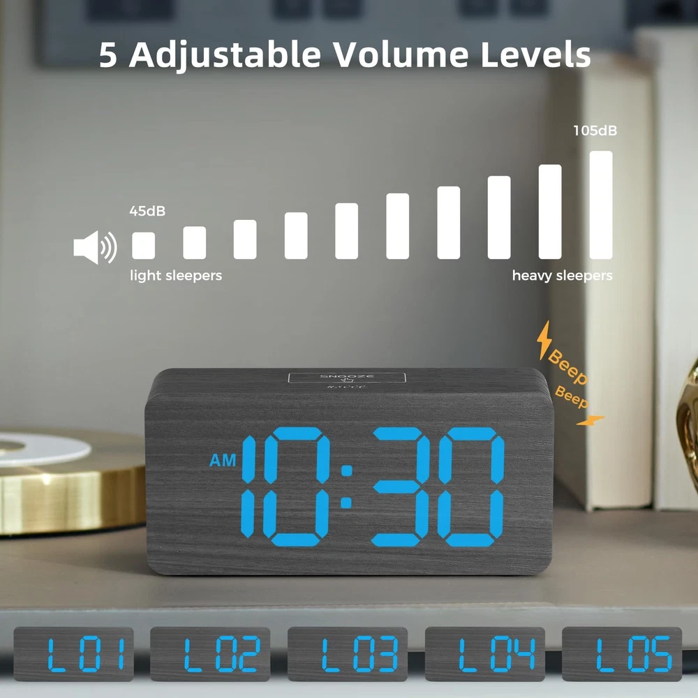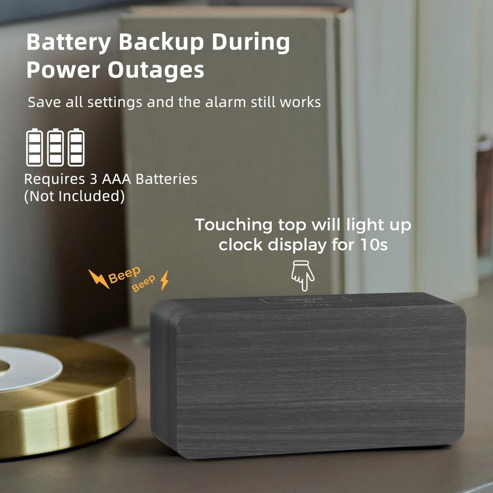 Wooden Digital Alarm Clock with Large Number This wooden digital alarm clock combines style and functionality, making it an essential addition to your home. Whether you're looking to enhance your decor or improve your daily routine, this clock is designed to meet your needs with ease and elegance. Elegant Wooden Clock for Home Decor This digital clock is perfect for placing on bedside tables, desks, shelves, and other home surfaces. Its minimalist and attractive wooden design adds an eco-friendly and distinctive touch to the decor of bedrooms, offices, and living rooms. It also makes a thoughtful and aesthetically pleasing gift for Christmas or birthdays, ideal for family, friends, and children. Large-Number Digital Alarm Clock This modern digital alarm clock boasts a 6.3-inch display with 1.8-inch large numbers, ensuring that the time is clearly visible even from a distance, perfect for those with visual impairments. It offers the flexibility to switch between 12-hour and 24-hour time formats, along with convenient DST adjustments. The clock is designed with intuitive controls and clearly labeled buttons, making it simple to set the time or alarms. User-friendly for all ages, from children to seniors, this clock is an accessible addition to any home. Adjustable Brightness Digital Alarm Clock Equipped with a 0-100% dimmer, this clock allows for seamless brightness control, ranging from a completely dark display to a brilliantly lit one. Ideal for preventing nighttime glare while maintaining daytime clarity, this feature accommodates the needs of those with light sensitivity or the elderly, providing a comfortable viewing experience at all hours. Convenient Dual Alarm Clock with Accessible Snooze Function Featuring a prominently sized Snooze button on top, this clock enables you to effortlessly extend your sleep by an additional 9 minutes, perfect for those who prefer not to fully wake up to turn off the alarm. It's simple to configure two distinct alarms, catering to family members with varying daily routines, ensuring a user-friendly experience for all. Electric-Powered Alarm Clock with USB Charging Capability This alarm clock runs on electricity through an included AC adapter, simply plug it into any standard wall outlet. It comes with a convenient USB charging port on the back, allowing you to power up your smartphone or other smart devices overnight while you rest. Battery Support for Uninterrupted Function Ensure reliability during power failures by backing up the clock with 3 AAA batteries (not included). When operating on battery power, all features function as usual, except for the USB charging port. The display illuminates for 8 seconds with each press of the 'SNOOZE' button or any buttons on the back, then dims to save energy, ensuring your clock remains operational without interruption. What You Get 1*Wooden Digital Alarm Clock 1*AC Power Adaptor 1*User Manual WOODEN DIGITAL CLOCK WITH LARGE NUMBERS: This wooden clock features bold, 1.8-inch LED numbers that are easy to read from across the room. Its natural wood finish complements any desk, shelf, table, or nightstand.(Note: The display stays lit only when plugged in) 0-100% CUSTOMIZABLE BRIGHTNESS: Easily adjust the display brightness from 0-100% to suit any setting–from bright daytime to a glare-free, night-friendly glow. The full-range dimmer makes it ideal for light-sensitive users and seniors. DUAL ALARMS WITH ADJUSTABLE VOLUME & EASY SNOOZE: Set two separate alarms with 5 volume options for light or heavy sleepers, perfect for different routines. An easy-access snooze provides an additional 9 minutes of rest. PLUG-IN ELECTRIC CLOCK WITH USB PORT: Powered by a reliable AC adapter, this clock ensures dependable timekeeping with a built-in USB port for convenient device charging on your nightstand, keeping your phone or other devices ready while you sleep. BATTERY BACKUP FOR POWER OUTAGES: Insert 3 AAA batteries (not included) to maintain clock settings and alarms during power outages, ensuring your schedule stays intact and you never miss an alarm - even in a power failure. USER-FRIENDLY CLOCK WITH MANUAL DST: Featuring clear, easy-to-use buttons, this clock is perfect for all ages–kids, adults, and seniors. Easily switch between 12/24-hour formats and use the manual DST function for seasonal changes, keeping you on schedule all year round. DESK CLOCK FOR HOME DÉCOR: With its natural and minimalist design, this wooden clock is a perfect decoration for bedrooms and offices. It's also ideal for placement on the TV stand in the living room, replacing the time display on the cable box. It makes a nice gift for family and friends.