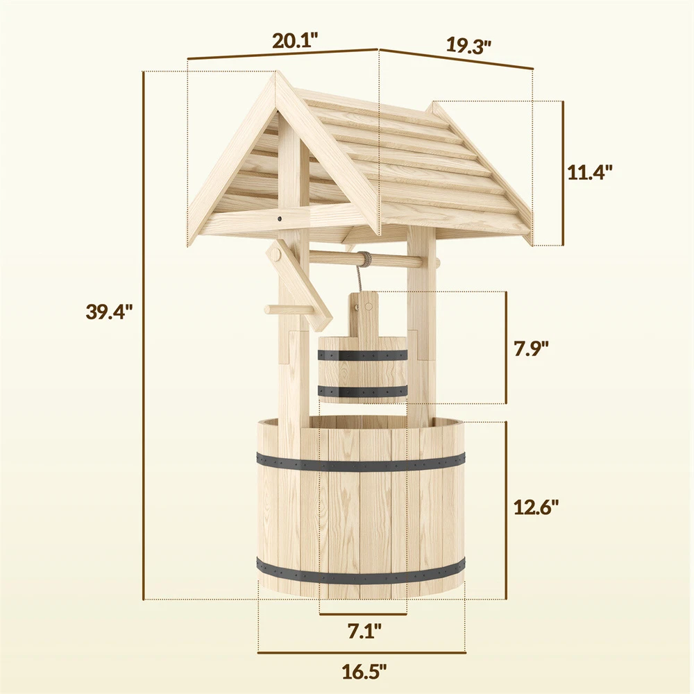 Features: - Rustic wood grain well enhances charming decoration for the garden - Spacious garden planter and a hanging bucket for multiple plants simultaneously - Solid fir wood structure ensures durability - Each with a predrilled hole for proper drainage, promoting plant - Adjustable string rope allows customizable bucket heights - Built-in shade roof plants from excessive sunlight - Assembly required Specification: - Color: Natural Wood - Overall Dimension: 20.1" L x 19.3" W x 39.4" H - Roof Size: 20.1" L x 19.3" W x 11.4" H - Well Planter Size: 16.5" Dia. x 12.6" H - Bucket Size: 7.1" Dia. x 7.9" H - Bucket Weight Capacity: 44 lbs. Package Includes: - 1 x Wooden Wishing Well - 1 x Manual