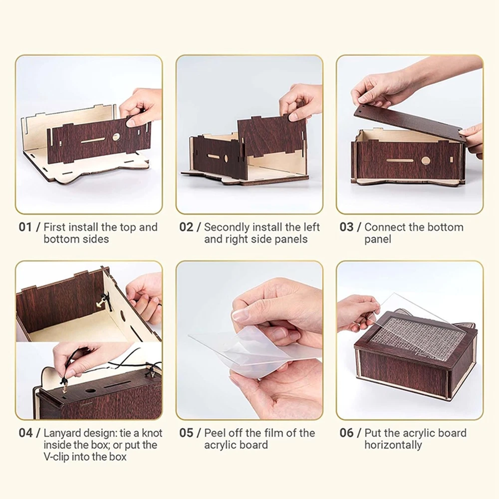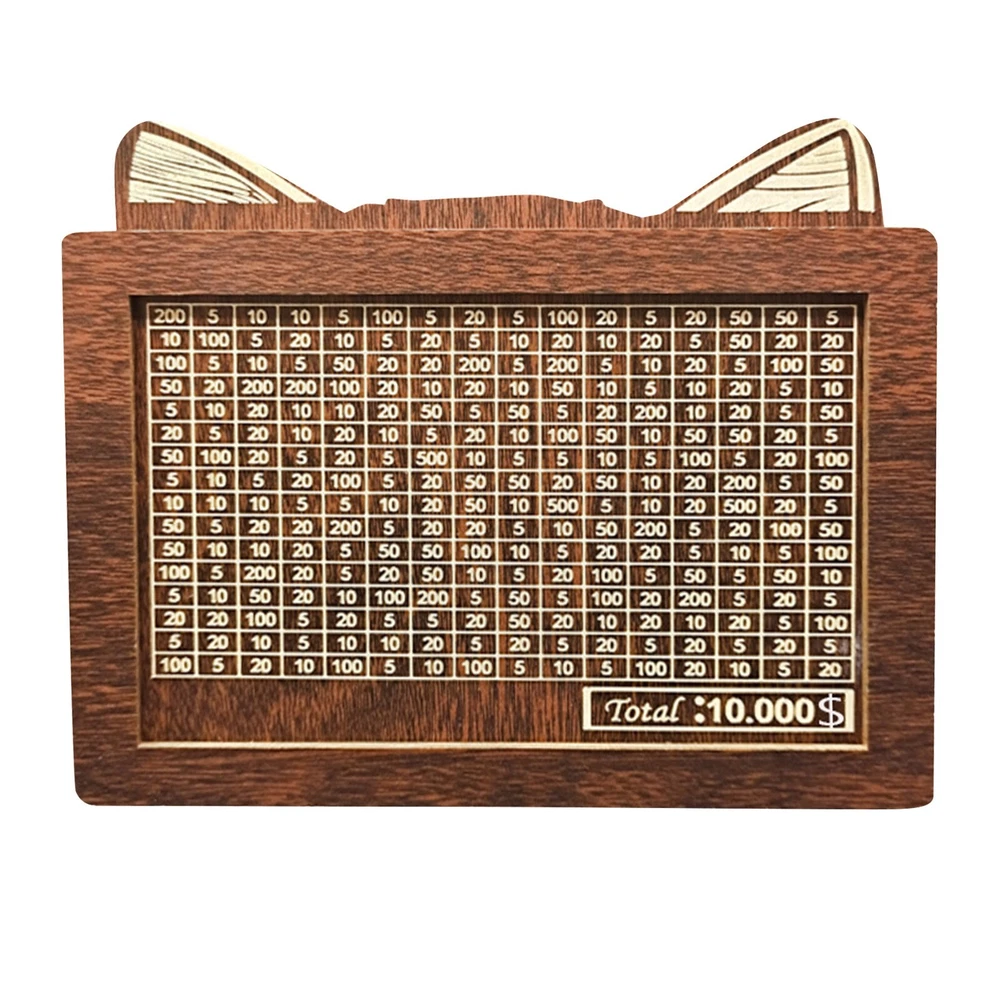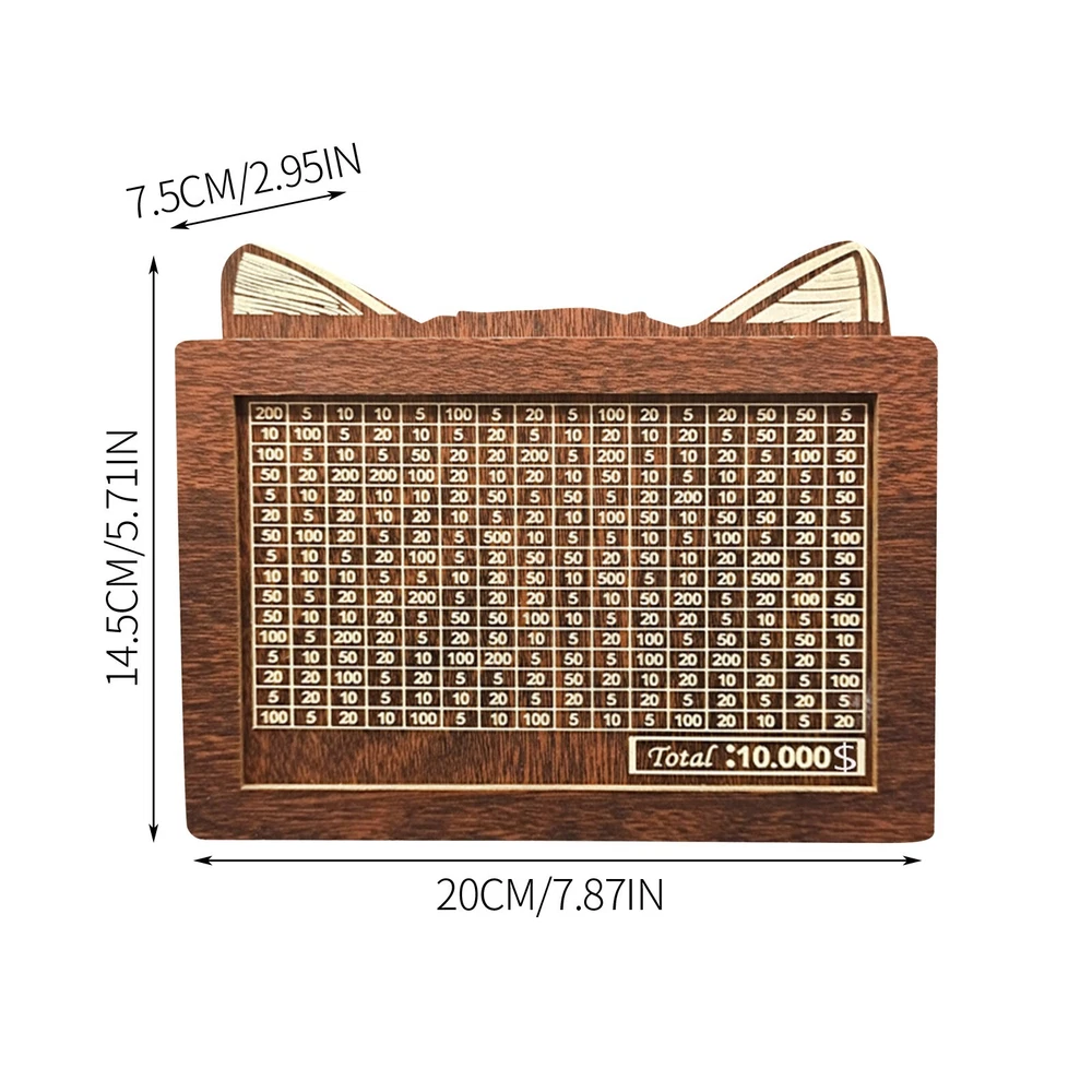 Savings Jar, Children's Wooden Savings Jar, Coin Savings Jar, Gift Toys For 8 To 13 Years Old, Reusable Savings Jar With A Storage Capacity Of 10000 About this product 10000 Challenge Savings Box: This wooden savings box features an integrated counting tool to track deposits, making it easy for children to learn how to money. It is an ideal gift for children and friends, like a Wealth management jar . Very suitable for saving money together for family, children, and then realizing these wishes. Easy to reuse storage box: The storage box can be assembled in minutes with just a few steps. It doesn't require tools. Full and easy to disassemble. Can be marked and reused. The slots on the box are an ideal choice for storing banknotes, allowing you to store more . By recording the amount you each time, make saving more interesting. It comes with an erasable marker pen, allowing you to cross out the corresponding number after each deposit, and a clear goal will you more than ever to achieve it. When all the numbers of the savings bank are crossed out, it achieves its goal. A way to encourage children to savings habits. This improved cat shaped Wealth management jar can be used as an important educational tool, but also add artistic and decorative colors to your home. With its beautiful appearance, this new cash box is perfect as a birthday gift for children. Whether it's a birthday, holiday, anniversary, or celebration, this Wealth management jar can be a special and meaningful gift. Our Wealth management jar is made of safe wood. The edges of the wood are smooth and the craftsmanship is exquisite. It can be kept at home or hung at home, make saving money easy. Can hold banknotes worth $10000. Size : 20 * 14.5 * 7.5cm/7.87 * 5.71 * 2.95in Includes : 1 * Wealth management jar