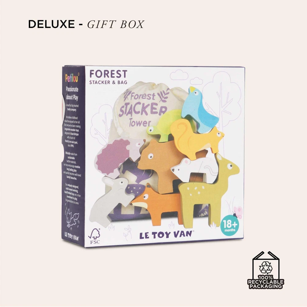 Product Description love the Wooden Petilou Forest Stacker & Bag Educational Balancing Activity Toy from !Our toys are designed to play to developing senses and are packed with layers of discovery for young, growing imaginations. The safety of your is our number priority. We rigorously test and regularly exceed toy safety standards. We only ever use safe, non-paint and work hard – from design to manufacture – to ensure kid safe edges on our toys, for safe play every day.Features:Hand painted, Suitable for toddlers and older children 12 months+, Made from durable, sustainable rubberwood, this allows long lasting fun, whilst caring for our planet. Contains: 9 wooden animals, Drawstring bag. has been proudly making imaginative wooden toys designed in London since 1955. Including local in their toy designing process and working with trusted suppliers for over 25 years, supporting them in ethical work practices. All multi-awarding winning toys are ethically made from sustainable, tactile Rubberwood and are uniquely designed and hand-finished.We care for our planet and believe wood is good! We use and replant a by-product of the rubber industry - Rubberwood, which used amongst over woods is recycled into our beautifully crafted toys. Set Contains: 1 x Bag 9 x Wooden animals CREATIVE EDUCATIONAL STACKING GAME - Perfect for the activity table, this educational stacking game develops hand eye coordination, dexterity skills and confidence. These ECO Friendly sustainable FSC wooden toys are forest friendly and easy stacking BEAUTIFULLY CONSTRUCTED - Classic style wooden toy. makes beautifully crafted toys like this delightful animal stacking toy based upon forest animals. Includes 9 individual animals and a handy fabric bag for travelling. Provides a great hands-on learning experience GREAT GIFT FOR TODDLERS or 2+ year olds. These early development & activity toys are ideal fine motor skills toys. Educational toys make perfect presents for girls or boys! Give the gift of learning with this wooden baby toy stacking 3d puzzle 9 PIECE PER SET - Being able to add and take away parts of this children’s toy encourages counting practice and assists in introducing and refining shape recognition, making it a perfect toy for children of varied ages SAFE, HIGH QUALITY AND ECO FRIENDLY - Decorated with water-based, chip-resistant non-paints and tested to the highest safety standards. Includes forest stacker wooden puzzle set with 9 wooden animals and a handy drawstring bag