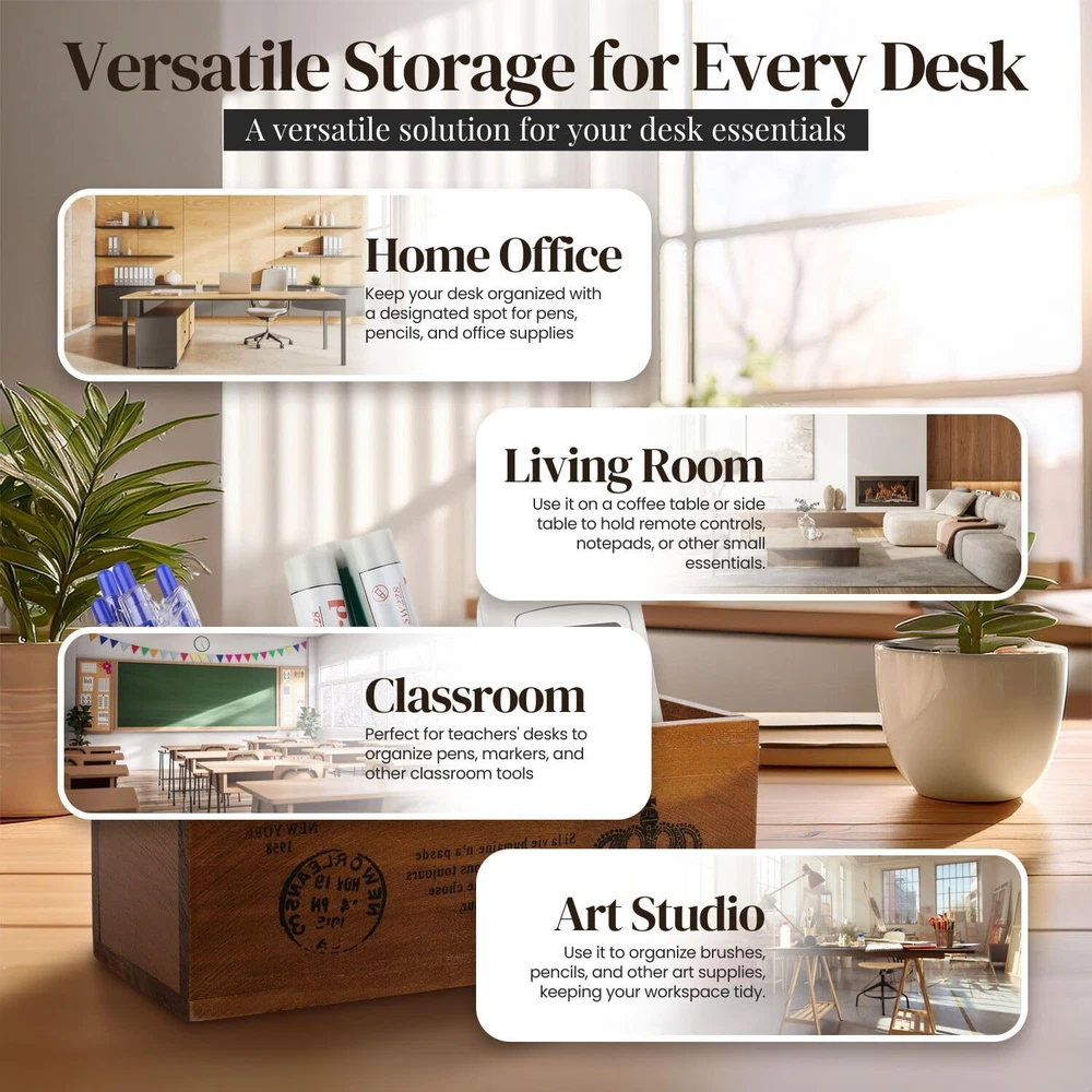 Say goodbye to the frustration of misplaced items with our multi-functional 3 compartment wooden storage organizer, designed to keep your workspace or living room tidy and clutter free. This versatile organizer has three spacious compartments and is perfect for storing pens, pencils, remotes and other essentials. Its luxurious rustic finish adds a touch of natural elegance, combining functionality and vintage aesthetics to create a soothing atmosphere in any room. Compact and easy to move, it fits perfectly on any desk, bedside table or center table, saving space while keeping your essentials close at hand. This organizer is stylish and practical, measuring 20 x 14 x 9.6 cm, making it the perfect addition to your home or office. Features: Dimensions: 20 x 14 x 9.7 cm. Package includes: 1 x Rustic Wooden Pencil Holder for Office - 3 Slots - Desk and Table Storage Organizer - Multifunctional Remote Control Holder for Home, School and Office Organize Your Space Efficiently - Say goodbye to the frustration of misplaced items. This multifunctional wooden pencil holder is perfect for organizing your pens, pencils, remotes and other accessories, keeping your workspace or living room tidy and clutter free VERSATILE 3 COMPARTMENT DESIGN - Our wooden pen holder for desk has three spacious compartments perfect for sorting your desk essentials and remote controls. It is not just a wooden pencil holder, it is a multifunctional basket that fits your needs RUSTIC VINTAGE APPEARANCE This rustic pen holder is made with a luxurious rustic finish. This wooden pen holder for desk adds a touch of natural elegance to any room. It combines functionality with classic design, creating a soothing and vintage atmosphere Space-saving solution: this wooden pen holder for desk is compact and easy to move; this organizer fits perfectly on your desk, bedside table or living room center table. Save space while making sure your essentials are always within reach PERFECT SIZE FOR ANY SPACE - Measuring 20 x 14 x 9.6 cm, this pencil organizer is compact but roomy enough to hold all the necessary items. Its natural wood design makes it a stylish addition to any decor.