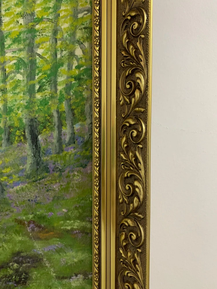 This stunning artwork by Reverend Kim Williams beautifully captures the tranquility of a woodland scene. The painting features a vibrant forest with a winding path and two figures resting on a stone bench, creating a charming and peaceful composition. The lush greenery and meticulous details bring the setting to life, evoking a sense of serenity and connection with nature. Measuring 58.5 cm in height and 68.5 cm in width, the artwork is set in an ornate gold-tone frame that compliments its timeless appeal. Perfect for art collectors or anyone looking to add a touch of countryside beauty and storytelling to their home. A fine example of Reverend Kim Williams' artistic talent and ability to portray the beauty of natural settings. We take great care to provide accurate descriptions, and we encourage you to thoroughly review the accompanying photos for a comprehensive understanding of the item's details. If you have any questions or need additional information, please don't hesitate to reach out to us.