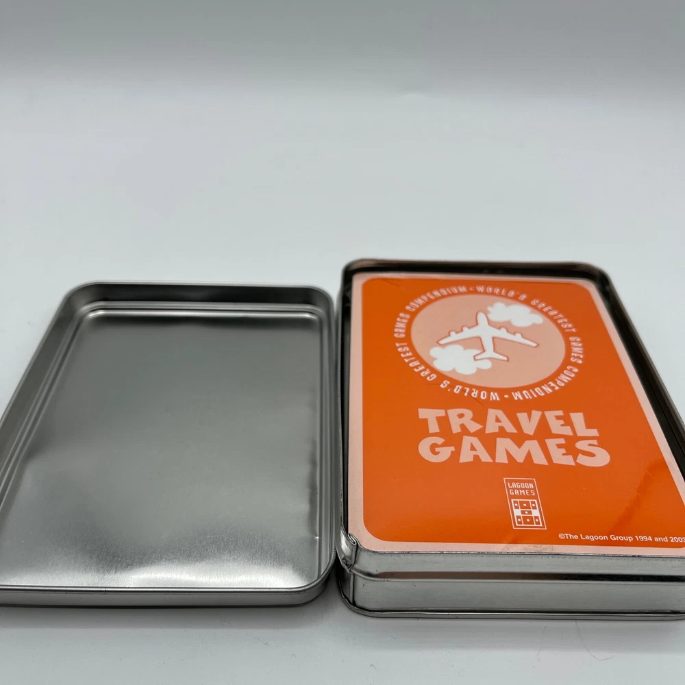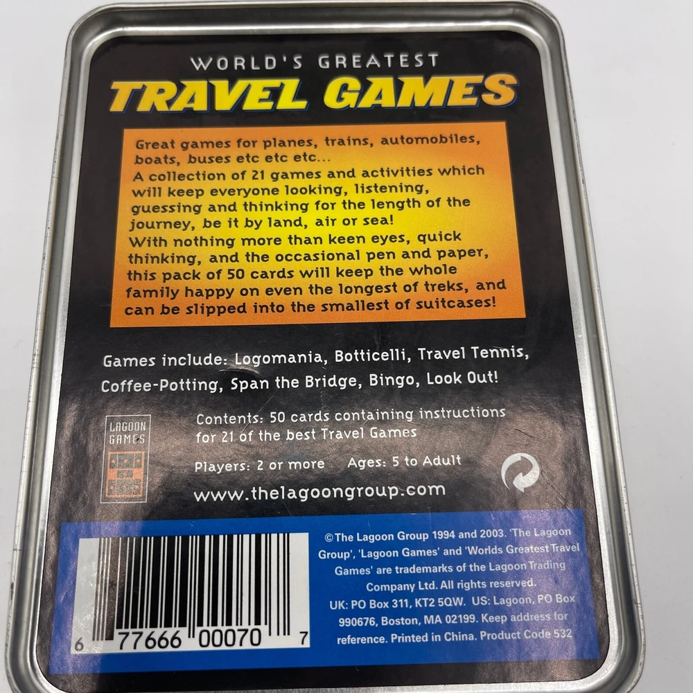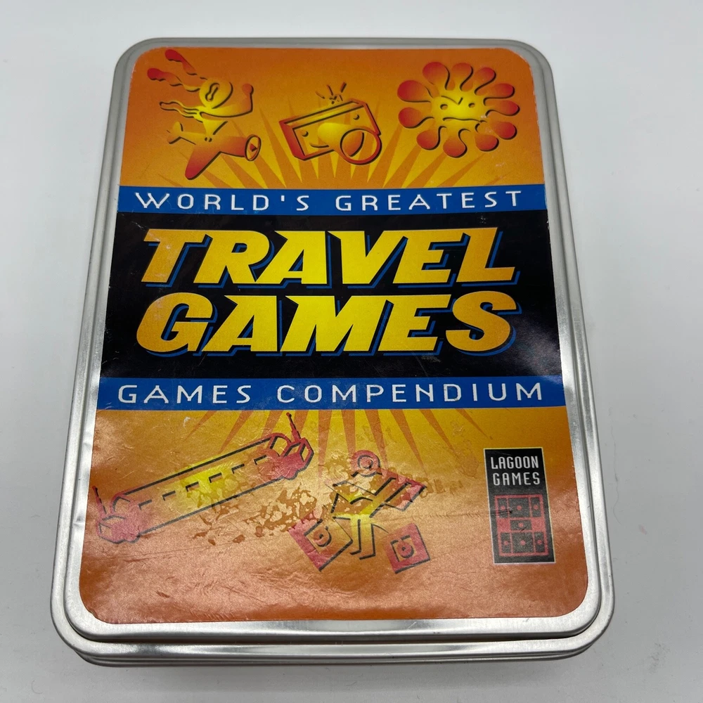 Worlds Greatest Travel Games 2003 Games Compendium Lagoon Games New Brand New. Cards are sealed. (Tin has dent in the top and some glue residue from the price sticker.) Details & Specifics: Year: 2003 Players: 2+ Ages: 5+ Games Included - Logomaina, Botticelli, Travel Tennis, Coffee-Potting, Span the Bridge, Bingo, Look Out and more. Contains 50 Cards containing instructions for 21 of the best Travel Games. Features: Collectors Tin See photos for further details & specifics We ship out 5 days a week. Purchases always shipped out the same or next business day.