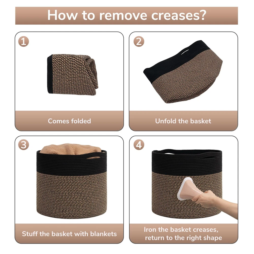 Attractive Organization Solution. There is nothing more useful for organizing your home than this handmade living room basket. When life gets messy, this bin is the perfect catch-all basket for blankets, clothes, sheets, shoes, towels, throw pillows or toys. Easily organize your interior space and make your home more cozy Stylish Home Decoration. The storage baskets for organizing are designed with two hidden handles on both sides, which make the basket portable and allow you to move it around your home with ease. With its elegant design, this towel basket is also an amazing home decor that fits anywhere in your home Large Size. This shoe basket measures 15.8 x 15.8 x 13.8 inches and is large enough to meet your daily needs, keeping your living room, bathroom, bedroom, laundry room and entryway neat and tidy Soft. This cotton rope basket is made of soft rope while being sturdy, which is perfect for home use, especially for children and pets. Different from the rattan or wicker storage basket, this large woven basket will not scratch your hands, clothes or floors and is suitable as Mother's Day, Christmas gifts for others Note. The toy organizers and storage bins are folded for shipping. It will turn back to its elegant shape quickly by filling it with towels and blankets, or ironing is a great idea to get rid of shipping creases. Also, you can fold it into a flat shape for easy storage when not in use