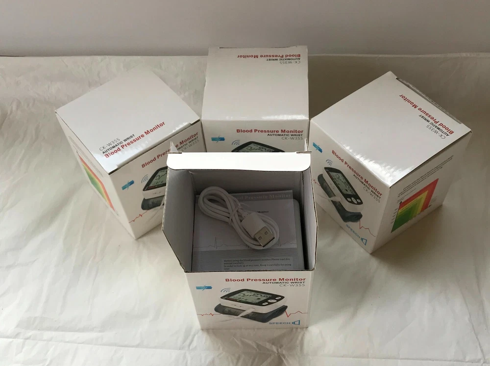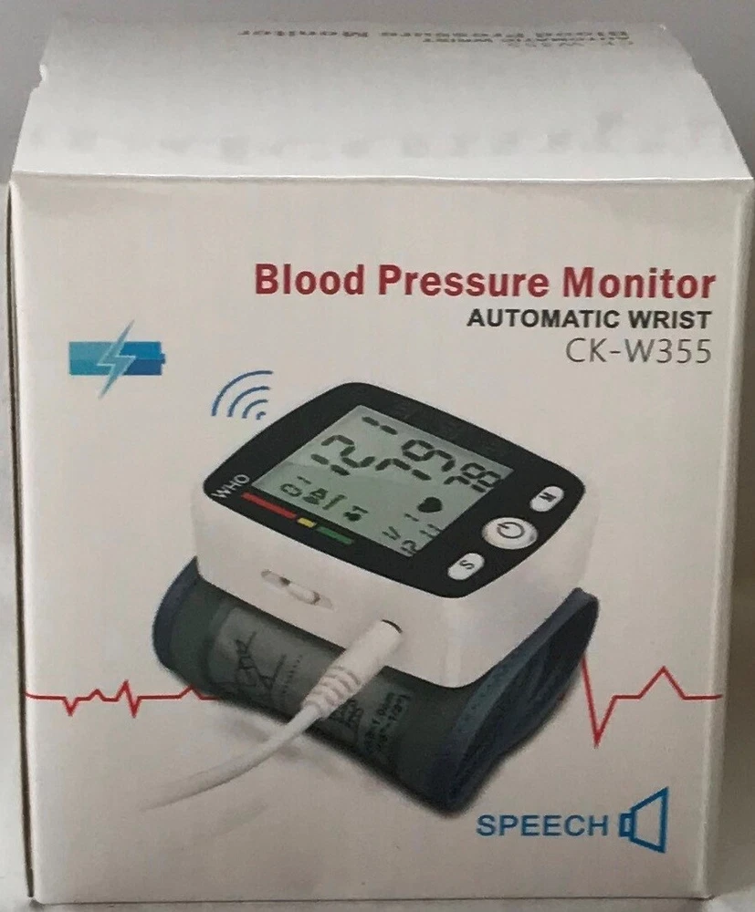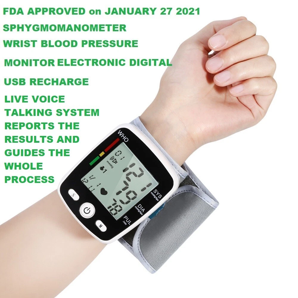 FDA Approved on January 27 2021 Wrist Blood Pressure Monitor Electronic Sphygmomanometer USB Recharge Model CK-W355 LIVE VOICE TALKING SYSTEM REPORTS THE RESULTS AND GUIDES THE WHOLE PROCESS No hassle of buying or replacing batteries !! Products Description Product Name Wrist blood pressure monitor Response Time About 60 seconds Memory 2 * 90 memory Display Model Digital LCD LCD Size 40*41mm (L W) Measurement Range Pressure Range?0 to 280 mmHg Pulse Range 40 to 199 beats/minute Accuracy Pressure ± 3mmHg (± 0.4KPa ) Pulse ± 5% Cuff size 13.5cm~19.5cm Package Size 98*98*108mm(L x W x H) Gross weight 260g Battery DC 3.7V 0.5A type Overview Quick Details Model Number: CK-W355 Power Source: Electricity Warranty: 3 years After-sale Service: Return in 30 days Power Supply Mode: USB recharge Material: plastic : Quality Certification: SGS Instrument classification: Class II Safety standard: GB/T18830-2009 Product name: Digital Blood Pressure Monitor Certificate: ISO13485 Display: LCD Digital Display Function: Blood Pressure Checking Memory: 2*90 Sets Measurement range: 0-280 MmHg LCD Size: 40*41mm Battery: Lithium Battery 3.7V Cuff Size: 13.5cm-19.5cm Gross weight: 260g