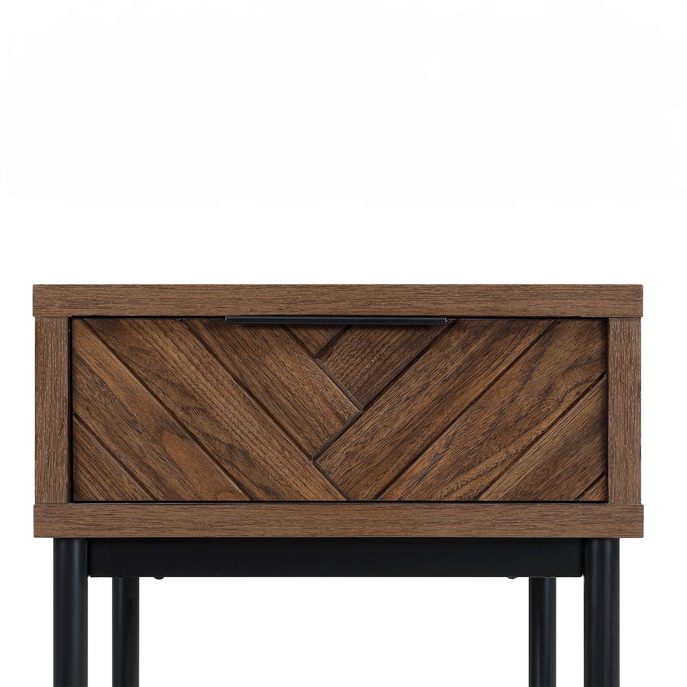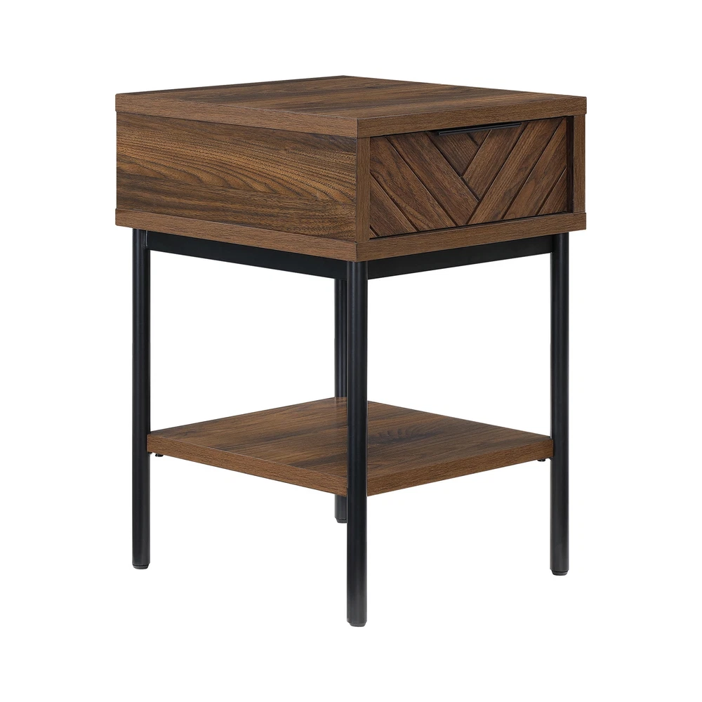 Elevate your living space with the Wyatt Geo End Table , where modern elegance meets craftsmanship. This charming side table is a versatile companion for your daily life. Imagine having your essentials within arm's reach, neatly stored away in the upper drawer. From remotes to keys, or even a cherished novel, this table keeps everything organized while adding a dash of style. The drawer boasts a contemporary herringbone pattern, enriching the table's texture and depth, making it a standout piece. The open shelf offers the perfect spot for your decorative pieces, greenery, or your favorite magazines, blending functionality with aesthetic appeal. Resting on sleek black metal legs, this side table presents a modern silhouette that complements its rich brown finish beautifully. The minimalist design adds a contemporary touch, and the quality engineering ensures stability and durability for years to come. Designed to harmonize with any room, the Wyatt Geo End Table pairs splendidly with the Wyatt TV Console, Coffee Table, or other items from the Better Homes and Gardens Wyatt Collection (sold separately). Whether it's set beside a cozy sofa or a comfy armchair, this side table is a chic and practical addition to your home. Its blend of form and function effortlessly enhances any decor, bringing a timeless charm and a touch of sophistication to your living space. Upper storage drawer for stowing remotes or other small accessories Large open lower shelf Spacious tabletop for conveniently placing remotes, books, or beverages Stylish herringbone pattern drawer fronts Soft-closing, ball-bearing drawer glides Sleek, modern finger pull drawer handles Black metal legs Walnut brown finish Pair with other items from the Wyatt Collection (Sold Separately) Assembly required Dimensions: 17 in x 18 in x 25.25 in (43.2 cm x 45.7 cm x 64.1 cm) Packaging Dimensions: 22.5 in x 20.375 in x 13.5 in Model# BH1425004710002