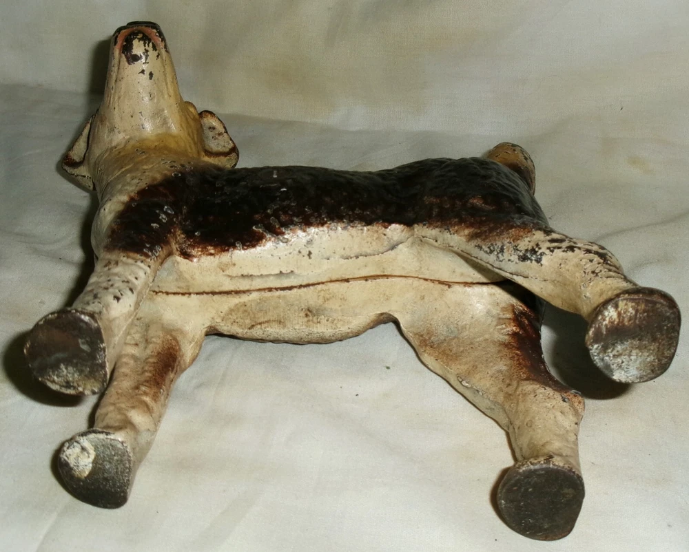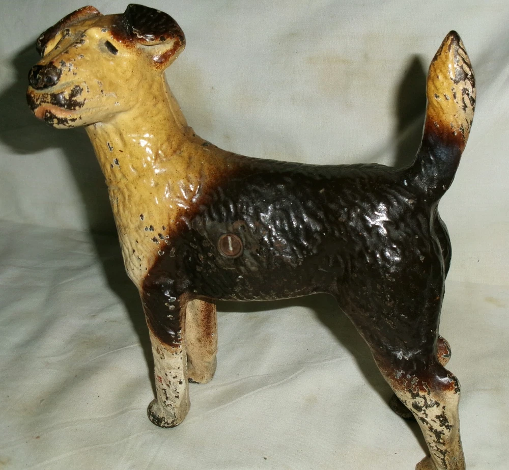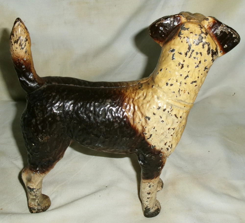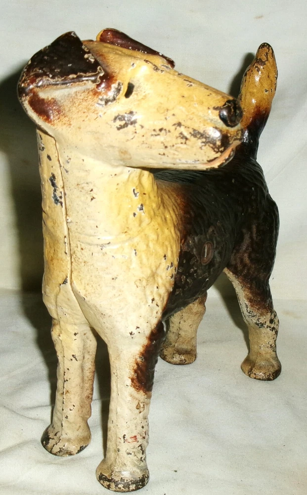 Background texture example *** BEING OFFERED IS THIS *** TRULY SPECTACULAR!!, *** XXX RARE!!, AND MUCH HARDER TO FIND!!, *** ANTIQUE AMERICAN HUBLEY DOORSTOP MANUFACTURED ( LANCASTER, PA ), *** "SCARCE LEFT FACING" LARGE AMERICANA CAST IRON WIRE HAIRED FOX TERRIER CAST IRON DOG DOORSTOP, WITH ORIGINAL AND FANTASTIC COLORFUL DARK BROWN & CREAM COLORED FACTORY PAINT ( XXX RARE!! )!! HE / SHE IS QUITE HEAVY, STURDY, THICK, STRONG, AND WELL MADE!! HE / SHE MEASURES A WONDERFUL HOME DOOR DOORSTOP DISPLAY SIZE: 9 " LONG, X 9 " HIGH, X 3 1/4 " FRONT TO BACK. HE / SHE WEIGHS A VERY HEFTY EIGHT POUNDS PRIOR TO PACKAGING!! HE / SHE HAS NO BREAKS OR STRUCTURAL DAMAGE!! HE / SHE HAS NORMAL ANTIQUE SURFACE PAINT WEAR AS SHOWN. HE / SHE IS A GREAT EARLY HUBLEY TOY COMPANY AMERICANA LEFT FACING DOG DOORSTOP CROSS COLLECTIBLE ARTISTIC ITEM AND WILL CONTINUE TO APPRECIATE IN VALUE!! THESE ANTIQUE HUBLEY "LEFT FACING" WIRE HAIRED FOX TERRIER DOOR DOORSTOPS ARE MUCH HARDER TO FIND IN TODAY'S DECORATIVE HUBLEY HOME DOORSTOP ARTS MARKET PLACE!! HE / SHE HAS NOT BEEN WASHED, CLEANED, OILED, POLISHED, OR WAXED. *** HE / SHE IS GUARANTEED 100 PLUS YEARS OLD ANTIQUE HUBLEY AND IS BEING SOLD AS FOUND / AS SHOWN. *** GOOD LUCK!!