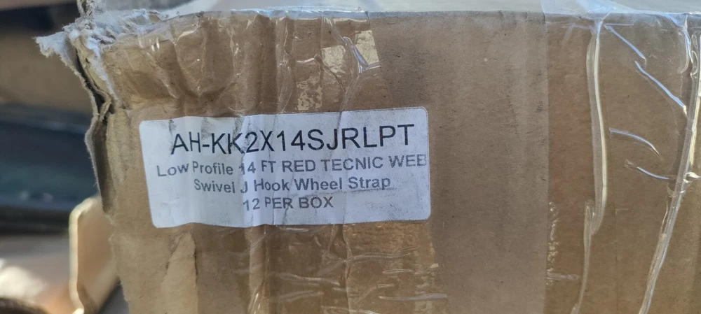 New 12 count box of straps. Never used, all but one have plastic binding still on. 2" x 14' Red TECNIC Webbing Replacement Wheel Lift Strap with Swivel-J Hooks BOX
