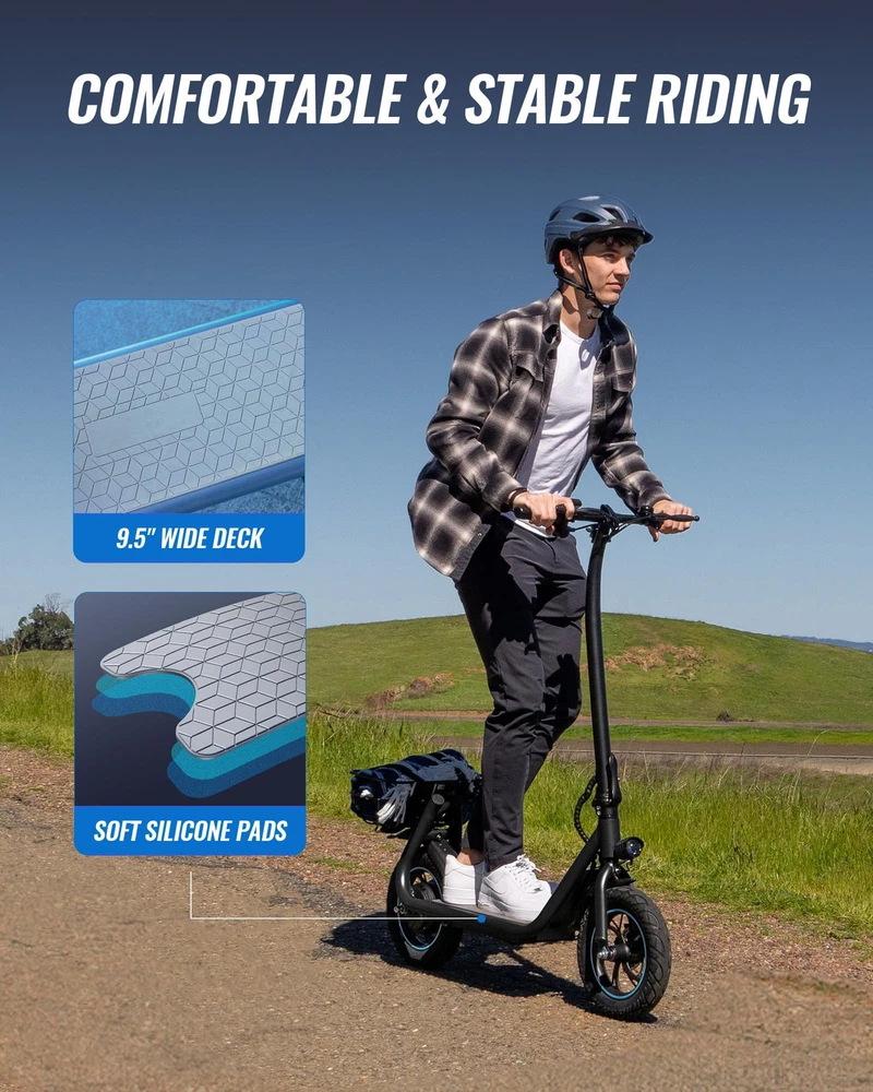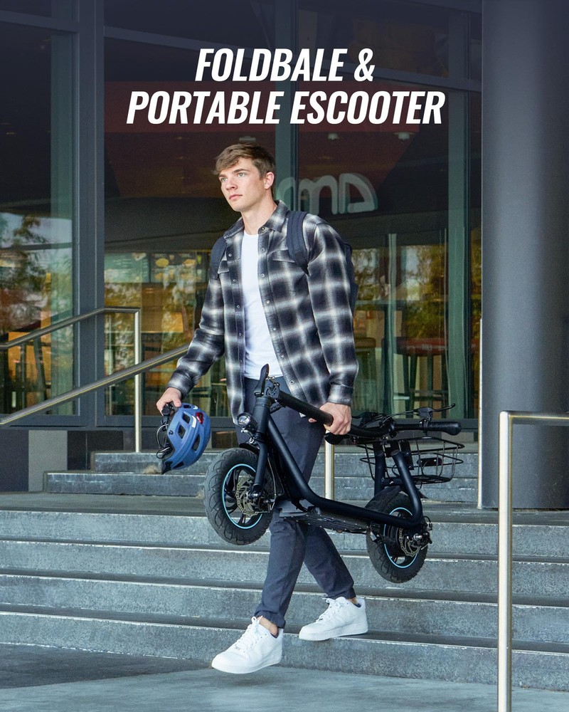 【Upgraded Electric Scooter】X2 implements the innovation of adult electric scooter with the addition of a removable yet sturdy basket equipped with extra long straps that allow you to easily carry anything you want. The X2 has a large console, folding mechanism, and has passed rigorous UL2272 testing. 【Powerful Motor & Long Battery Life】 The electric scooter for adult has a powerful 550W motor that easily climbs 15° slopes, and can travel 20 miles at 18.6mph on a 5-hour charge. The electric scooter has 3 speed modes with adjustable pole is suitable for drivers from 5 '3 "to 6' 1". Maximum load 220LBS. 【Comfortable & Stable Riding】 Equipped with sturdy 12-inch pneumatic tires, which can effectively absorb ground vibration, provide a smooth riding experience, and can adapt to a variety of uneven roads and terrains. The 9.5-inch wide deck provides enough room for your feet, even for a small pet, and the silicone pads on the deck effectively relieve foot fatigue, providing a softer standing environment, increased balance and comfort. 【Safe Riding】 Electric scooter adults use front and rear disc brakes to ensure timely and effective braking and improve your driving safety. Bright front and rear lights, along with a bell, alert pedestrians and make riding at night safer. 【Portable & Durable】 The X2 electric scooter's folding design makes it easy to store in your car, school or office and other compact spaces. Whether it's for work or school, shopping or a weekend getaway, it's got you covered.