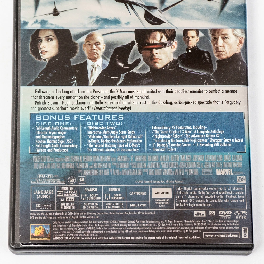 X2: X-Men United / X-Men 2 (Two-Disc Widescreen Edition) - DVD - VERY GOOD Get ready for thrilling action, high-stakes drama, and unforgettable mutant powers with X2: X-Men United , the acclaimed sequel that expands the X-Men universe with deeper storylines and intense battles. The X-Men face a new threat that brings allies and enemies together in a fight for survival, making this film a must-watch for superhero fans. This opened DVD is in very good condition, perfect for anyone looking to dive into one of Marvel's classic films. Why You’ll Love It: All-Star Cast : With returning favorites like Hugh Jackman as Wolverine, Patrick Stewart as Professor X, and Ian McKellen as Magneto, the cast delivers powerful performances that bring each character to life. High-Stakes Plot : As the X-Men join forces with unlikely allies to confront a common enemy, the film delivers both thrilling action and emotional depth. Spectacular Action Scenes : From Nightcrawler’s incredible White House attack to Wolverine’s intense battles, X2 raises the bar on superhero action sequences. Perfect for Marvel Fans : Widely regarded as one of the best entries in the X-Men series, X2 combines gripping storytelling with unforgettable characters, making it a must-have for any Marvel collection. Condition : This DVD is opened but in very good condition . The disc has been fully tested to ensure quality playback, and the original case shows only minimal signs of wear. An essential addition for fans of superhero films and action-packed adventures, X2: X-Men United promises excitement from start to finish. Feel free to reach out with any questions. Ships fast and securely for your next action-filled movie night!