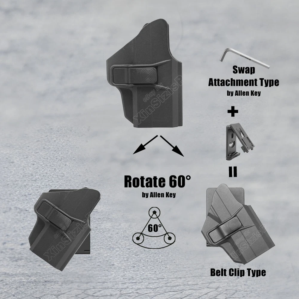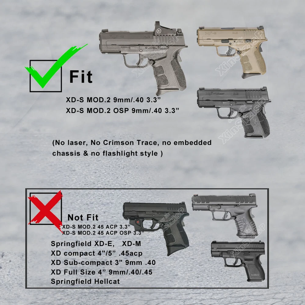 High Quality Military & Police Grade Polymer OWB Holster Specially Designed For Fast Draw During Duty Or Shooting Competition. Outside the Waistband Tactical Holster with belt clip attachment method Holster for Springfield Springfield XDS-9 3.3" 9mm Luger Springfield XDS-9 MOD.2 3.3" 9mm Luger Springfield XDS-9 MOD.2 OSP 3.3" 9mm Luger Springfield XDS-9 MOD.2 OSP 4" 9mm Luger Springfield XDS-40 3.3" .40 S&W Springfield XDS-40 MOD.2 3.3" .40 S&W Not fit Springfield XDS-45, XD Series (XD9, XD40, XD45), XD-M Series(9mm .40 .45) High Safety Level II Retention. It will automatically lock on the trigger when you put the weapon in, and makes a "click" sound to let you know that it is securely locked. Pull the weapon out quickly by pressing the button with your index finger. Excellent Design Made of military polymer material, easy to clean and maintain, so light to carry. Simple structure in the internal design. The protruding button makes it easier to touch and its skid proof stripe helps you recognize it through your sense of touch. Attachment 60 degrees tooth gear for omnidirectional rotation, feel free to wear on Web Belts within 2 inches and Duty Belts. Smooth backs are easier to slide into your belt, the back screws make it easier to remove and install accessories. Widely Used Daily concealed carry under your coat, and extreme temperature tolerance. Suitable for different places like military, courser, shooting coach, law enforcement agencies or personal protection use. Great for civilians and off duty officers. In the Package: · 1* Holster with Belt Clip Attachment · 1* Allen Key Shipping: Ships same day or next except Sundays and Holidays ! Free shipping! Ship by USPS First Class Package. 100% MONEY BACK GUARANTEE . any question please be free to contact with us .Thanks!
