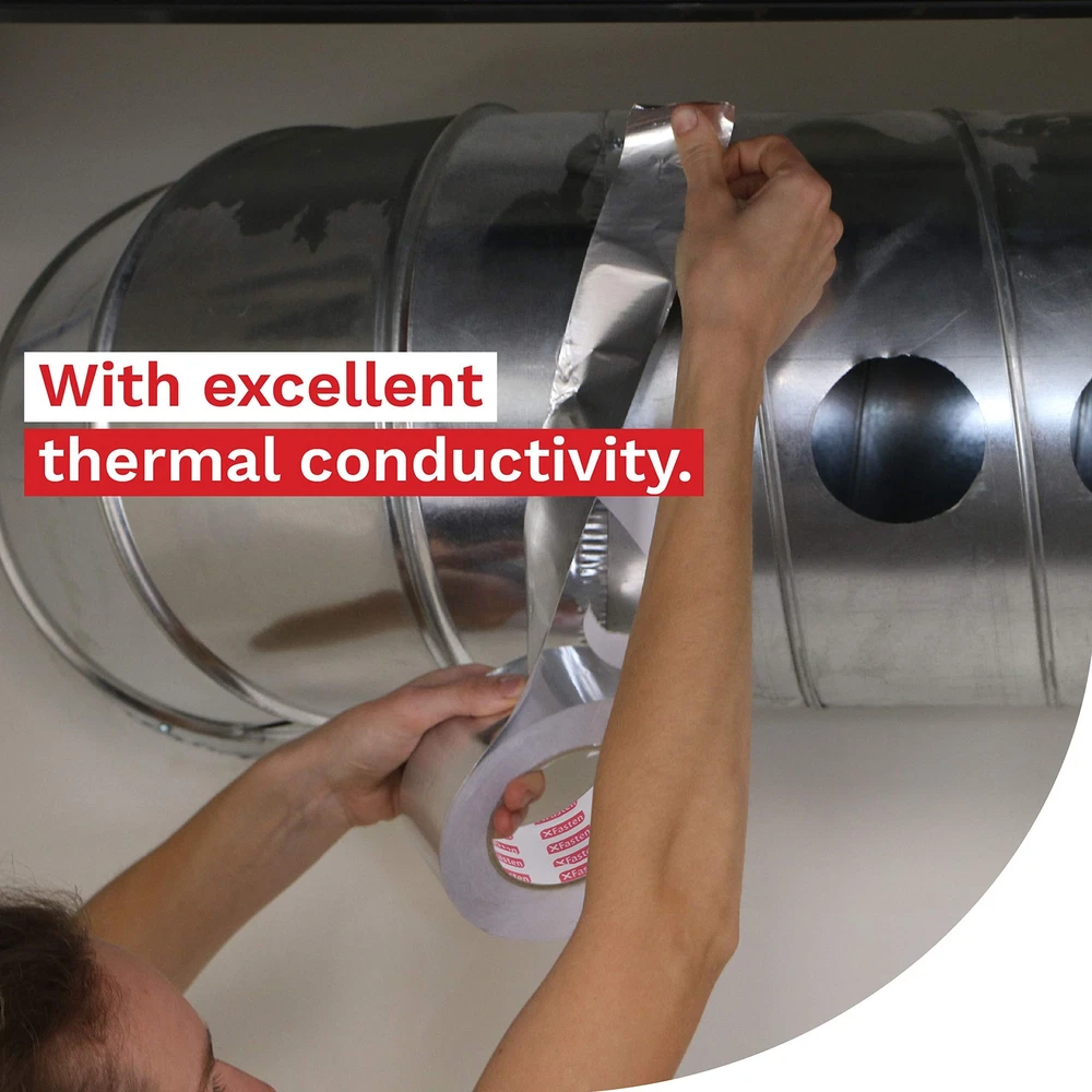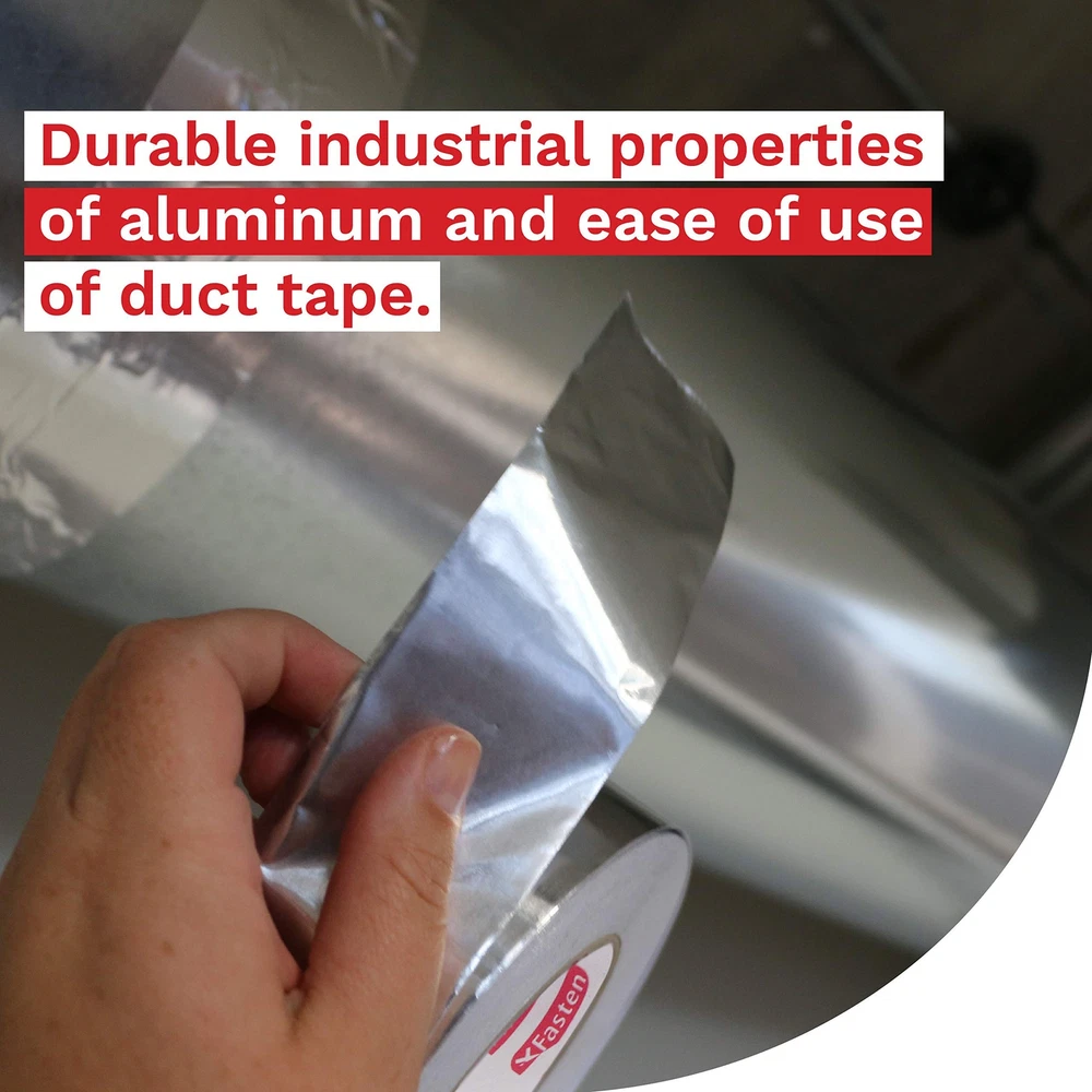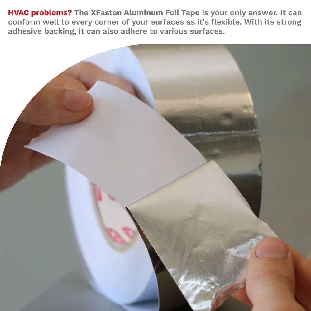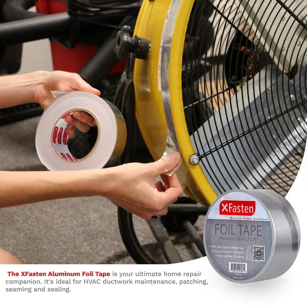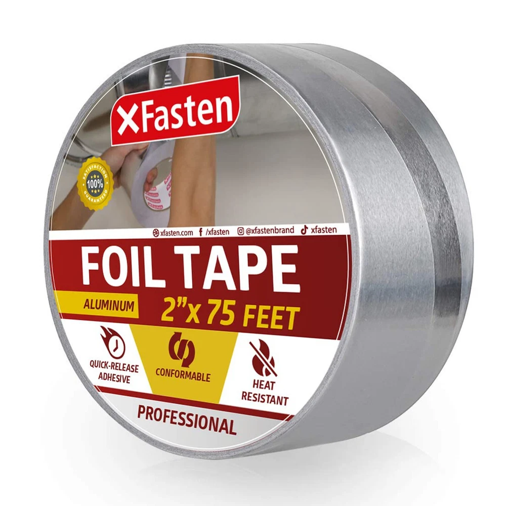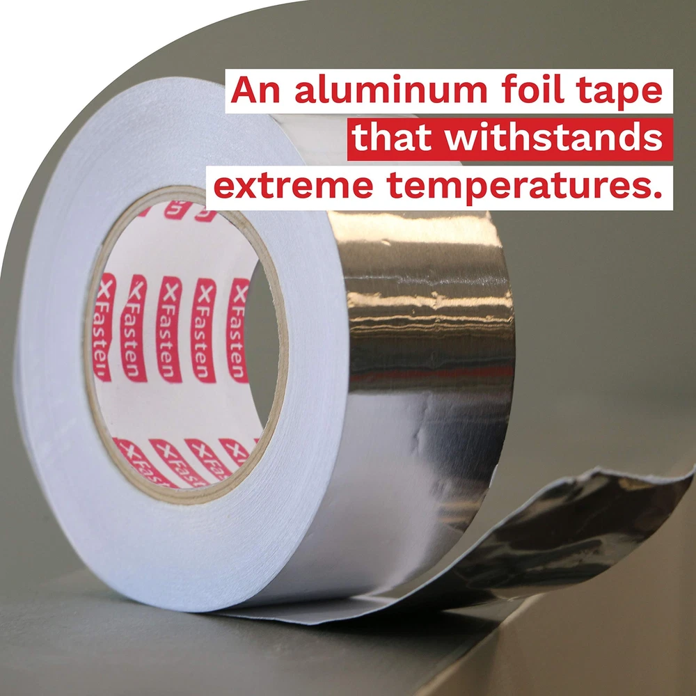 XFasten Aluminum Foil Reflective Duct Tape, 2 Inches x 75 Feet, 3.6 mil, High... Product Overview ABOUT THE XFASTEN ALUMINUM FOIL TAPE The XFasten Aluminum Foil Tape combines the durable industrial repair properties of aluminum and the ease of use of duct tapes. It has a butyl rubber acrylic adhesive that forms an airtight and water-resistant bond for both indoor and outdoor sealing, restoration, and HVAC applications. It also conforms well to irregular surfaces due to its flexible material build and it can adhere well to various smooth, textured, or rough surfaces thanks to its strong adhesive backing. Why Choose The XFasten Aluminum Foil Tape? Industrial-Grade Aluminum Foil Tape The XFasten Aluminum Foil Tape is equipped with high-heat capacity epoxy resin and quick-release silicone adhesive liner. It can withstand extreme humidity and temperature. This tape is ideal for the following uses: Sealing hot and chilly air ductsRepairing metal seamsInsulating aluminum duct pipes Excellent Flame Retardant & Vapor Barrier Every time you use the XFasten Aluminum Foil Tape, you won't have to worry about where to store it as it can be stored on any environment without degrading - making this aluminum duct tape ideal for window AC and heaters, vents, and ducting. Read more Compatible With Concrete Metal Ceramic Copper Read more Key Features High Coefficient Of Heat Transfer The XFasten Aluminum Foil Tape features a high coefficient of heat transfer. As such, it allows the tape to be an excellent thermal insulator. Compatible To Various Surfaces The XFasten Aluminum Foil Tape provides excellent adhesive bond on metals, plastics, copper, ceramic, and concrete. Conformable This tape is easy to install as it's conformable. Its pressure-sensitive adhesive enables it to fit on corrugated joints and irregular corners. Durable The heavy-duty performance of the XFasten Aluminum Foil Tape is ideal to combat flame, moisture, weather, corrosion, and rusting. This tape is built to last and meant to take a beating! Read more XFasten Aluminum Foil Tape, 1" x 55 Yards XFasten Aluminum Foil Tape, 2" x 55 Yards XFasten Aluminum Foil Tape. 2" x 55 Yards (3-Pack) Item Weight 2.02 Pounds 1.35 Pounds 4.19 Pounds Material Type Fire Retardant Aluminum Foil Tape Fire Retardant Aluminum Foil Tape Fire Retardant Aluminum Foil Tape Color Silver Silver Silver Features Industrial-grade Aluminum Reflective Foil Tape equipped with high-heat capacity adhesive. Withstands extreme humidity and temperature from -25C to 190C (-13F to 374F). Residue-free and quick-release adhesive liner enables the AVERAGE AMERICAN with LITTLE TO NO EXPERIENCE in repair to produce PROFESSIONAL-GRADE sealing, both in looks and functionality. Increases temperature efficiency, making this dryer foil tape ideal for insulation, AC-units, ducts and vents. Heavy-duty against flame, moisture, weather, corrosion and rusting. This adhesive aluminum tape provides excellent bond on metals, plastics, copper, ceramic and concrete. Conformable and pressure sensitive adhesive enables it to fit on corrugated joints and irregular corners. This Metallic Furnace Duct Tape for HVAC and duct work is ideal for sealing hot and chilly air ducts, repairing seams and insulating duct pipes. Excellent vapor and temperature barrier. Details Product Dimensions : 4.33 x 4.33 x 2 inches; 9.6 Ounces Date First Available : August 5, 2019 Manufacturer : XFasten Best Sellers Rank: #18,827 in Industrial & Scientific (See Top 100 in Industrial & Scientific) #207 in Duct Tape #207 in Duct Tape Customer Reviews: 4.6 out of 5 stars 308 ratings Quality Products Have peace of mind knowing that your order will arrive original factory sealed packaging. That means that you'll have the full force of the manufacturer's warranty to protect your purchase. Fast and Free Shipping You're already purchasing the item. Why pay additional for shipping, especially slow shipping? We get your order shipped out and delivered to your doorstep as quickly as possible. Commitment We are committed to making sure that you leave this transaction satisfied. That means having access to real people that get your questions and concerns answered quickly. Give us a shot and we will make sure that you will look to us again!