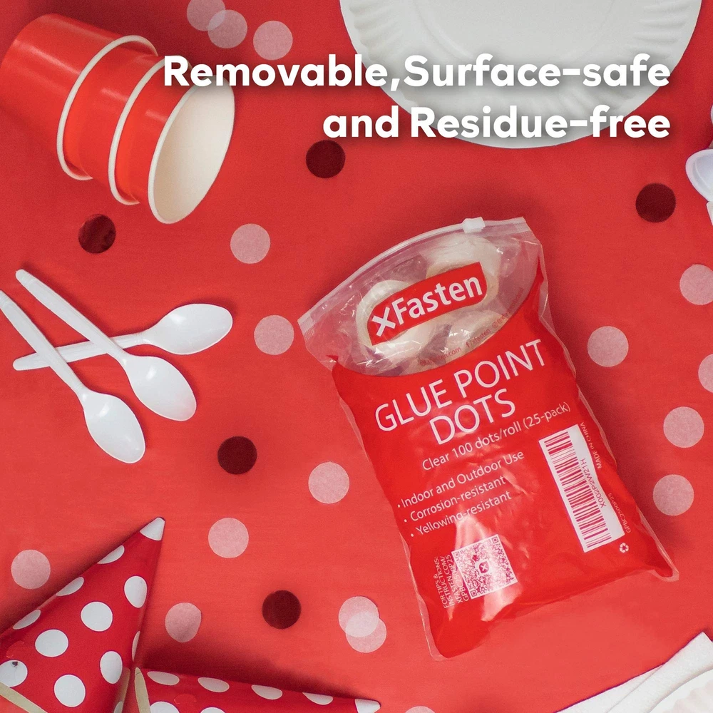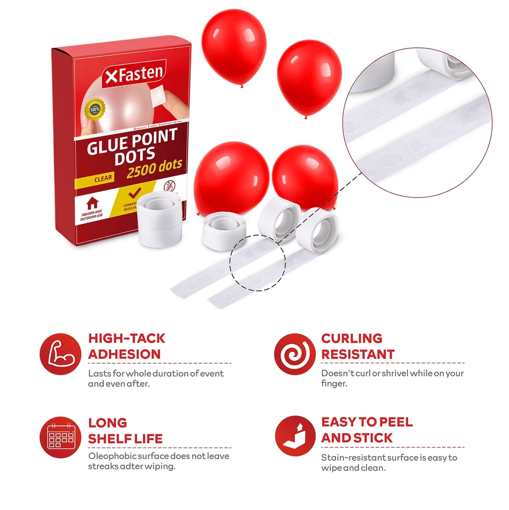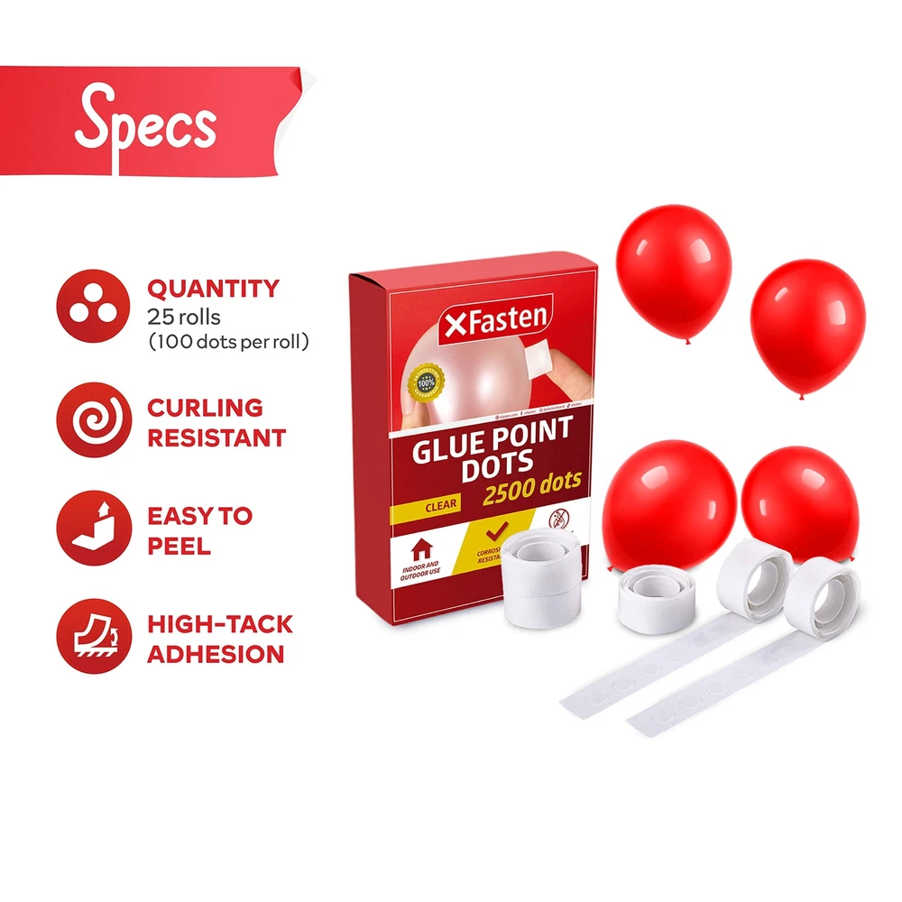 XFasten Balloon Glue Point Dots Clear, Removable, 2500 Pcs (25 Rolls), Balloo... Product Overview Read more HOW TO APPLY STEP 1 Cut glue dots individually. Be careful not to touch the adhesive side too much. STEP 2 With your finger touching the adhesive liner, stick the glue dot on the balloon. STEP 3 Next, carefully peel off the adhesive liner. STEP 4 Stick the balloon/s on a clean, dry surface. Read more XFasten Double Sided Tape XFasten Double Sided Tape XFasten Double Sided Tape (Easy Tear) XFasten Adhesive Roller XFasten Adhesive Roller XFasten Reusable Nano Tape Size 1.5" x 15 Yards 1.5" x 30 Yards 2" x 30 Yards 0.3" x 360" 0.3" x 360" 0.6" x 10 Foot & 1.5" x 10 Foot Uses Ideal for sealing, repairing, and other mounting applications Ideal for sealing, repairing, and other mounting applications Ideal for sealing, repairing, and other mounting applications Ideal for scrapbooking, photos, and school projects Ideal for scrapbooking, photos, and school projects Ideal for mounting tools, picture frames, photos, posters, decors, and other objects Double Sided ✓ ✓ ✓ ✓ ✓ ✓ Color White Clear White Clear Clear Clear Quantity Single Roll Single Roll Single Roll 4 Rollers 8 Rollers 2 Rolls Features MAKE BIRTHDAY PARTIES SPECIAL. As kids, we have once all dreamt of flying before, more or less us being flown in the sky by a bunch of balloons. This might be the reason why balloons in parties touch that kid inside use every time we see these decors on parties. Step up parties and create the best balloon arch column arrangement with the XFasten Balloon Glue Point Dots! Perfect for weddings, birthdays, Halloween, and other special occasions. SUPERIOR ADHESION. Other clear balloon arch tapes fall off after just an hour, but the XFasten double-sided glue point dots isnt just any other adhesive. Using our proprietary silicone adhesive blend, our balloon tape strips tackiness will last for the whole duration of the event and even after, until needed to be removed. Sticks well to glass, cement, concrete, plastic and cardboard. EASY TO PEEL AND STICK. Many balloon sticky adhesive point dot tapes are too thin that they stick to your hand or are hard to remove from the roll. The XFasten transparent balloon arch tape is equipped with a quick-release adhesive liner allowing for easy peeling. It will not curl or shrivel while on your finger and can be transferred easily to the surface. LIFESAVER FOR PROJECTS. Do you need to stick several decors on the wall? These scrapbooking glue point dot tape can also be used for scrapbooking or hanging decors, flowers, balloons, rosettes, and other light decors on the wall so that you wont need to cut individual strips of double-sided tape! Details Product Dimensions: 6.69 x 9.84 x 1.97 inches Item Weight: 8.5 ounces Manufacturer: XFasten Quality Products Have peace of mind knowing that your order will arrive original factory sealed packaging. That means that you'll have the full force of the manufacturer's warranty to protect your purchase. Fast and Free Shipping You're already purchasing the item. Why pay additional for shipping, especially slow shipping? We get your order shipped out and delivered to your doorstep as quickly as possible. Commitment We are committed to making sure that you leave this transaction satisfied. That means having access to real people that get your questions and concerns answered quickly. Give us a shot and we will make sure that you will look to us again!