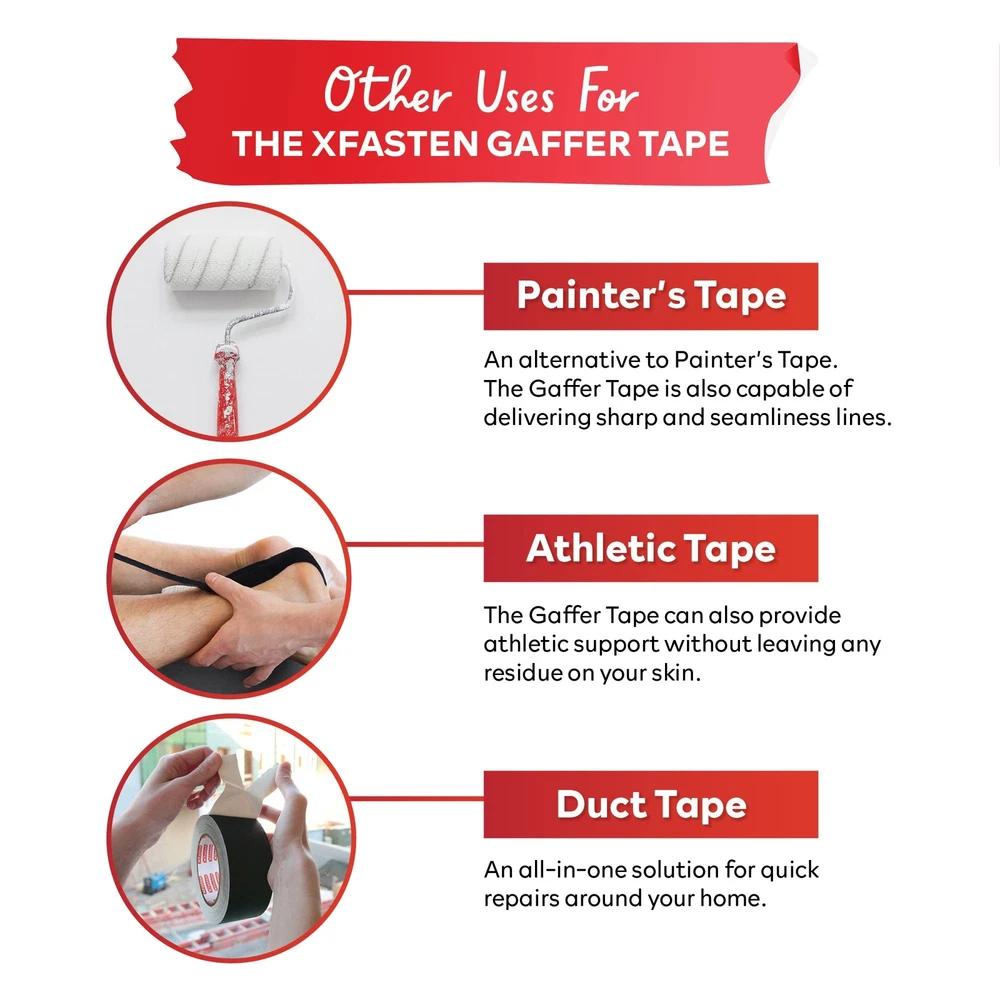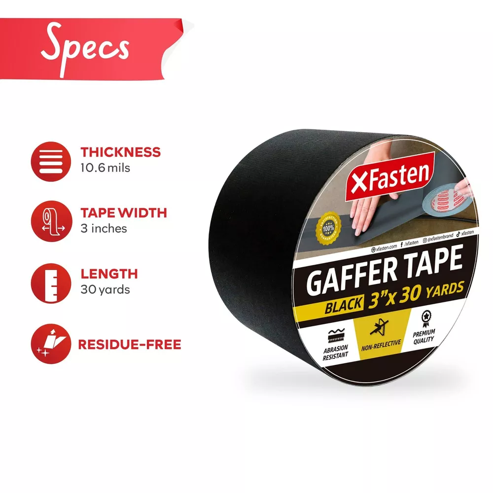 XFasten Black Gaffers Tape 3 Inch X 30 Yards, Pro Black Gaff Tape for Photogr... Product Overview Size: 3 Inches x 30 Yards Color: Black Read more Read more XFasten Gaffer Tape XFasten Gaffer Tape XFasten Gaffer Tape XFasten Gaffer Tape XFasten Gaffer Tape XFasten Gaffer Tape Size 2" x 30 Yards 2" x 60 Yards 2" x 30 Yards 3" x 30 Yards 2" x 30 Yards 2" x 30 Yards Color Black Black White White Yellow Red Material 95% Cotton, 5% Rayon 95% Cotton, 5% Rayon 95% Cotton, 5% Rayon 95% Cotton, 5% Rayon 95% Cotton, 5% Rayon 95% Cotton, 5% Rayon Uses TV, Theater, Studio, Automotive, Photography, Music, and other professional needs TV, Theater, Studio, Automotive, Photography, Music, and other professional needs TV, Theater, Studio, Automotive, Photography, Music, and other professional needs TV, Theater, Studio, Automotive, Photography, Music, and other professional needs TV, Theater, Studio, Automotive, Photography, Music, and other professional needs TV, Theater, Studio, Automotive, Photography, Music, and other professional needs XFasten Gaffer Tape XFasten Gaffer Tape Pro XFasten Flourescent Gaffer Tape ATack Gaffer Tape Pro Size 2" x 30 Yards 2" x 30 Yards 1" X 18 Foot 2" x 30 Yards Color Blue Black Neon Green, Orange, Pink, Yellow, and Blue Black Material 95% Cotton, 5% Rayon Stealth Reinforced Textile Backing and Acid-Free Silicone Adhesive Cotton Fabric Stealth Reinforced Textile Backing and Acid-Free Silicone Adhesive Uses TV, Theater, Studio, Automotive, Photography, Music, and other professional needs TV, Theater, Studio, Automotive, Photography, Music, and other professional needs Ideal for decorating walls and floors for parties TV, Theater, Studio, Automotive, Photography, Music, and other professional needs Features MULTIPURPOSE BLACK GAFFERS TAPE. Aside from being a gaffer tape that most photographers, filmmakers, event organizers, and production managers seek, it can also be handy for painters, athletes, and DIYers. NO SCISSORS NEEDED. The XFasten gaffer tape can be torn by hand, so you dont have to prepare a box cutter or a pair of scissors. Its easy to cut into smaller threads if needed. NON-REFLECTIVE MATTE FINISH. This pro gaffers tape 3 inch perfectly hides stage markings and other cables in the shadows. It wont intrude on the filming and wont ruin the shots. NO RESIDUE TAPE, SURFACE-SAFE. This black gaff tape is surface-safe and will not leave any messy adhesive residue when removed. Its perfect for temporary spaces for shoots, demonstrations, and others. STRONG ADHESION. The XFasten black gaffers tape 3 inch sticks well to any surface. This black tape has a strong rubber adhesive backing and wont break up easily when fastened to irregular surfaces. PERFECT FOR INDOOR AND OUTDOOR SETTINGS. This black tape is not sensitive to what type of surface you will adhere to, and it wont unstick even if its rained on. It is compatible with plastic, vinyl, wood, metal, cement, leather, and glass. MOVABLE GAFFERS TAPE. Although this gaffer tape is known for its adhesive strength, it can also be easily moved when needed. You dont have to worry about peeling off the wall or floor paints when doing so. HELP WITH CORD MANAGEMENT. Manage your electrical cords on set or at home using the XFasten floor tape for electrical cords. It flawlessly ties and sticks your cable mess in the place, so its not distracting to see. USE IT FOR LABELING PROJECTS. Aside from serving its purpose as a floor marker in photography and film shoots, you can also use this pro gaff tape as a masking tape for other projects, such as labeling. You can easily write on its cloth material. WATER-RESISTANT GAFFING TAPE. This gaff tape is not easily penetrated by water, so its safe to use in locations that might be affected by moisture or rain showers. Details Is Discontinued By Manufacturer : No Product Dimensions : 4.92 x 4.92 x 2.99 inches; 14.1 Ounces Item model number : GTB330 Date First Available : March 27, 2017 Manufacturer : XFasten Best Sellers Rank: #7,630 in Industrial & Scientific (See Top 100 in Industrial & Scientific) #17 in Gaffer Tape #17 in Gaffer Tape Customer Reviews: 4.4 out of 5 stars 2,484 ratings Quality Products Have peace of mind knowing that your order will arrive original factory sealed packaging. That means that you'll have the full force of the manufacturer's warranty to protect your purchase. Fast and Free Shipping You're already purchasing the item. Why pay additional for shipping, especially slow shipping? We get your order shipped out and delivered to your doorstep as quickly as possible. Commitment We are committed to making sure that you leave this transaction satisfied. That means having access to real people that get your questions and concerns answered quickly. Give us a shot and we will make sure that you will look to us again!