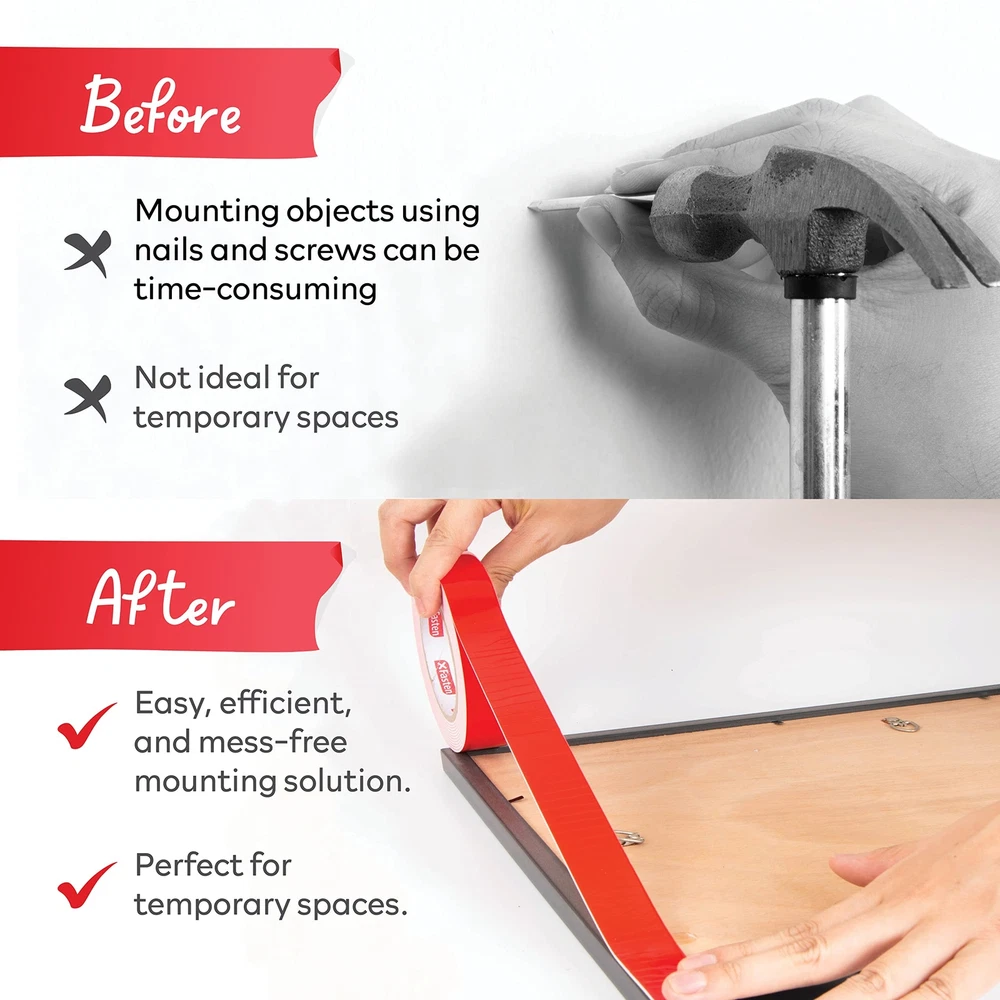 XFasten Double Sided Tape Foam Mounting Tape, 3/4-Inch x 350-Inch Product Overview ABOUT THE XFASTEN DOUBLE-SIDED FOAM MOUNTING TAPE The XFasten Double Sided Foam Mounting Tape is an efficient exterior and interior mounting tape that can mount objects up to 3 pounds together per square inch of tape in a long term basis. It works on both even and uneven surfaces. Where it shines is on exterior use where it performs better compared to other leading brands on textured, rough, and uneven surfaces. Read more COMPATIBLE WITH TEXTURED DRYWALL CONCRETE WOOD CARTON Read more WHERE CAN YOU USE THE XFASTEN DOUBLE-SIDED ACRYLIC MOUNTING TAPE? Perfect for layering on greeting cards, DIYs and other arts and crafts projects. It adds an extra dimension to greeting cards, taking your art into a whole new level.Mounting photos and poster on the wall. Mounting bathroom accessories and home decors. Mounting light objects such as nameplates and exterior signage on bricks, concrete and other rough surfaces. Can be used as a noise cancellation device in between doors to prevent loud banging noise when the door is closed. OTHER USEFUL FEATURES Residue-Free Strong Adhesion High Durability High Weight Holding Capacity Read more KEY FEATURES PERFECT SOLUTION TO MOUNT OBJECTS ON WALLS The XFasten Double-Sided Foam Mounting Tape is a versatile replacement for bolts and screws on even and uneven surfaces for interior or exterior use. WORKS ON VARIOUS SURFACES With its unparalleled versatility, the XFasten Double-Sided Foam Mounting Tape fares well on uneven, irregular or highly textured surfaces such as cement, brick and concrete.. IDEAL FOR CRAFTERS If you love arts and crafts, the XFasten Double-Sided Foam Mounting Tape is for you. It works well for layering rubber stamp projects, cards, invitations and other arts and crafts projects. EASY TO INSTALL The XFasten Double-Sided Foam Mounting Tape is an instant and mess-free tape due to its easy-to-peel backing and high sheer resistant adhesive. Read more XFasten Double-Sided Acrylic Mounting Tape, 1" x 450" XFasten Double-Sided Foam Mounting Tape, 1" x 150" XFasten Double-Sided Foam Mounting Tape, 1/2" x 36 Yards XFasten Double-Sided Mounting Dots 1" (Pack of 80) XFasten Double-Sided Mounting Squares 1 " (Pack of 80) XFasten Double-Sided Tape, 1.5" x 15 Yards Color Clear White White White White White Material Type Acrylic Adhesive Compressible and Conformable Urethane Foam Compressible and Conformable Urethane Foam Compressible Foam Material Compressible Foam Material Poly-carbonate Film Tape Item Weight 10.4 ounces 1.6 ounces 4 ounces 0.8 ounces 0.64 ounces 0.8 ounces Features Versatile replacement for bolts and screws on even and uneven surfaces for interior or exterior use. Ideal for mounting accessories, photos, paintings, frames and decors in the kitchen or bathroom. Works well for layering rubber stamp projects, cards, invitations and other arts and crafts projects. Fares well on uneven, irregular or highly textured surfaces such as cement, brick and concrete. Instant and mess-free bond due to its easy-to-peel backing and high sheer resistant adhesive. Details Manufacturer: XFasten Brand: XFasten Item Weight: 1.76 ounces Product Dimensions: 350 x 0.75 x 0.75 inches Item model number: OP-6163 Is Discontinued By Manufacturer: No Material Type: Foam,Rubber Number of Items: 1 Manufacturer Part Number: FMT350 Quality Products Have peace of mind knowing that your order will arrive original factory sealed packaging. That means that you'll have the full force of the manufacturer's warranty to protect your purchase. Fast and Free Shipping You're already purchasing the item. Why pay additional for shipping, especially slow shipping? We get your order shipped out and delivered to your doorstep as quickly as possible. Commitment We are committed to making sure that you leave this transaction satisfied. That means having access to real people that get your questions and concerns answered quickly. Give us a shot and we will make sure that you will look to us again!