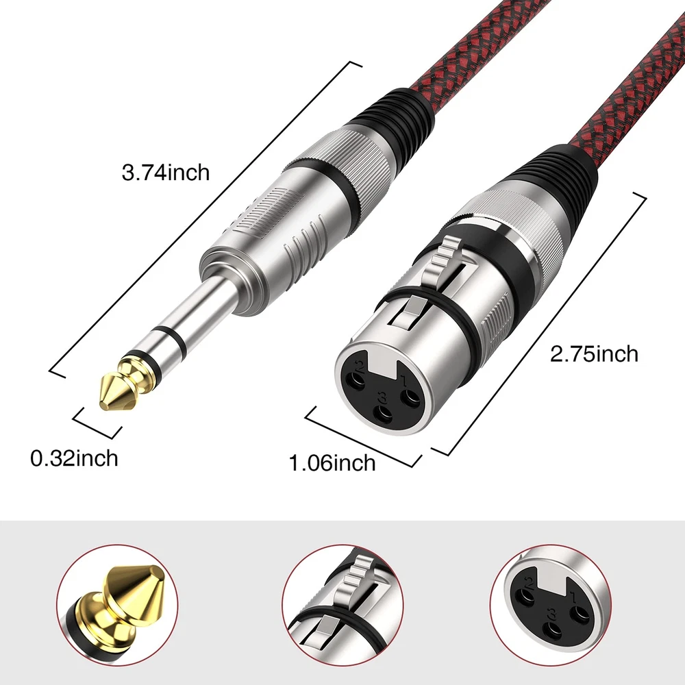 【Service Support】If there are any issues with 1/4 inch TRS to XLR female cable, we will provide after-sales service support. It is suitable for dynamic microphones, 48v condenser microphones (needs to be used with phantom power),not for 5v condenser microphone. 【HI-FI Stereo Audio】This nylon braided XLR female to 1/4 inch cable has a premium oxygen-free copper which conductor is made of 20 AWG single - stranded 6N copper. Providing both superior cable performance and reliable connectivity. And It is also provide high quality audio & stable audio transmission. No signal loss, no delay / noise / static / burst / hum. 【Triple Shielded Design】The balanced microphone cable is built in triple shielded, it is highly resistant with EMI/RFI interference. * 2 different color, red and blue combination. 6.35mm TRS connector has a 24k gold-plated. 99.3% copper braided spiral-wound shielded. 【Premium Structure】Our 6.35mm TRS to XLR female cable has a heavy duty nylon braided, high quality nylon braided jacket with 15,000+ bend lifespan. Tested it plugging and unplugging 9,000+. Flexible and durable. XLR connector is made of alloy which is very heavy duty. Anti against corrosion and oxidation. 【Wide Compatibility】This premium XLR microphone cable is widely compatible with microphones, mixer, audio sound consoles, power amplifier, powered speaker and more.