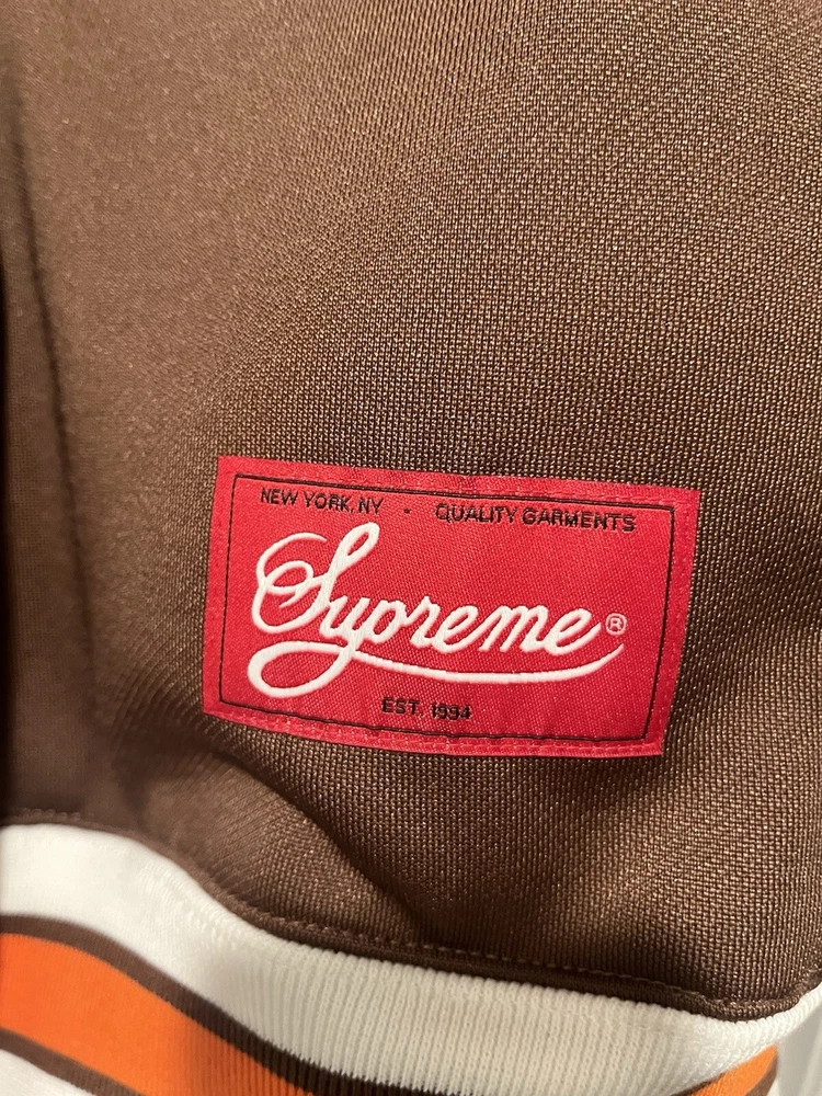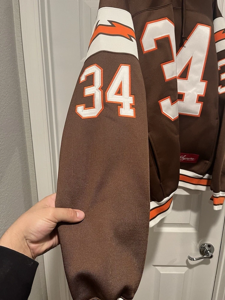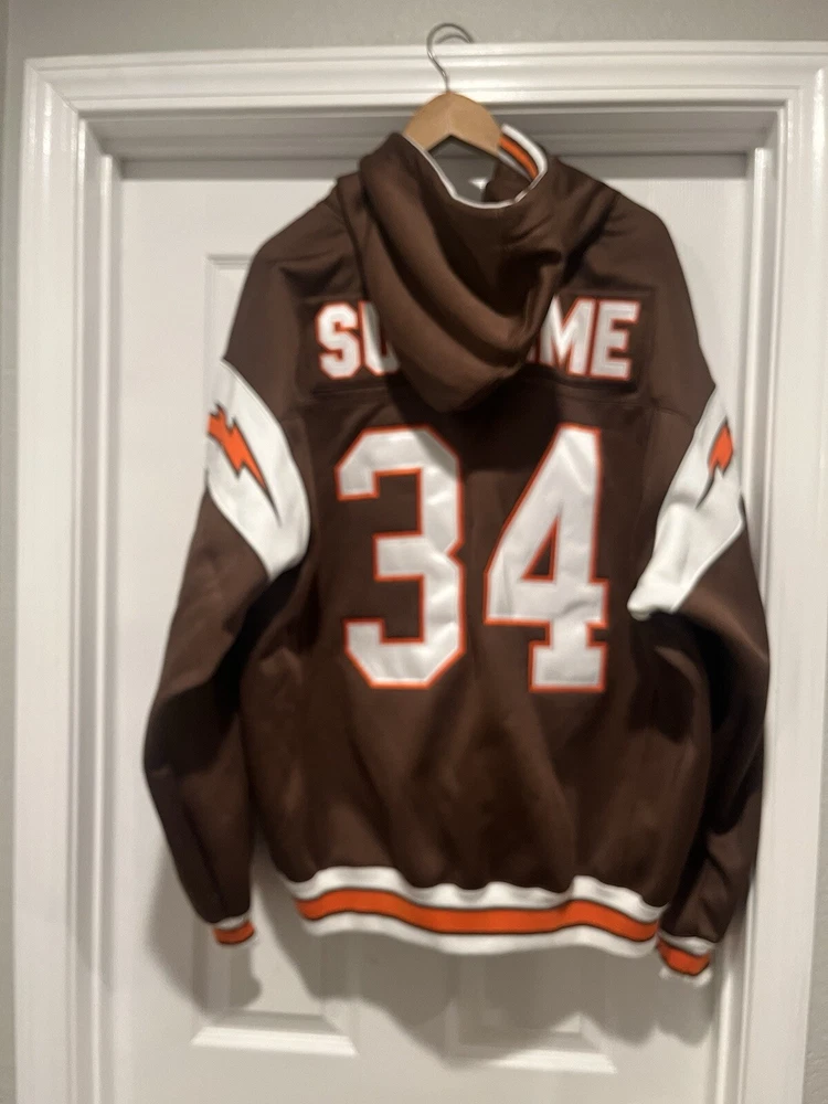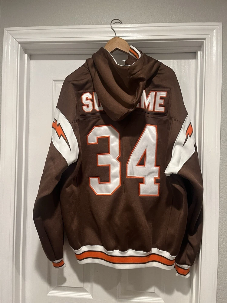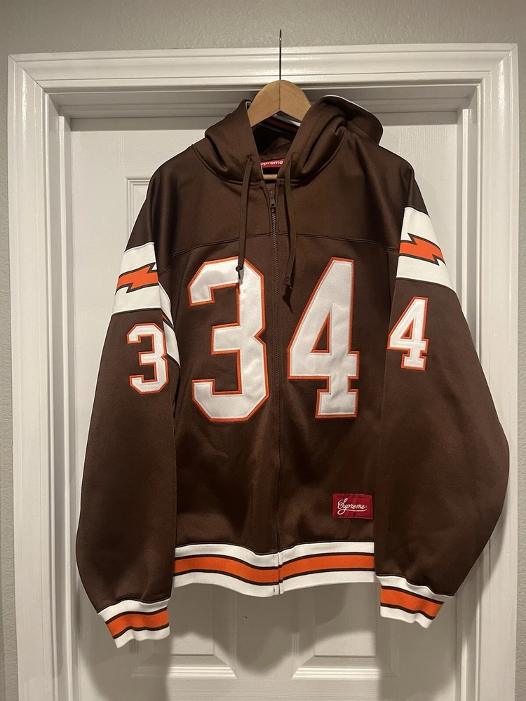 Elevate your streetwear game with this Supreme Football Zip Up Hooded Sweatshirt in Brown. This hoodie is perfect for any football enthusiast who wants to show off their love for the game in style. It features a full zip closure and a hood for added warmth and comfort. Made by Supreme, a leading brand in the fashion industry, this hoodie is available in sizes Small and Medium. It is crafted from high-quality materials and designed to last. Whether you're going to a game or just hanging out with friends, this hoodie is sure to make a statement.