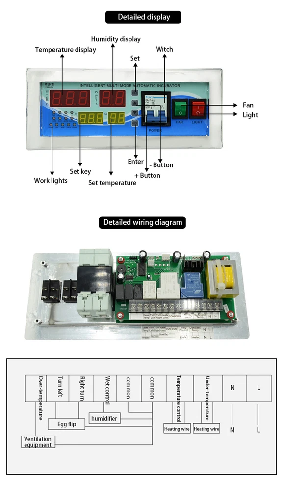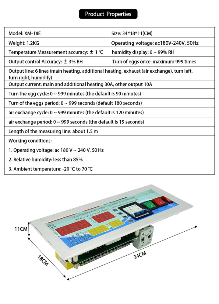 Product Description XM-18E Digital Automatic Multifunction Humidity Temperature Incubator Controller Description: 100% new high quality. The new generation of intelligent temperature and humidity insulation controller is an all-intelligent microcomputer control system designed and developed for the incubation industry, using the latest microelectronic technology and new components. It uses microcomputer chip to have strong anti-interference and high stability; temperature sensor uses high-precision sensor, high temperature acquisition accuracy and wide temperature range It uses a high-performance humidity sensor with high precision to ensure stability and reliability. It has four user-friendly display screen designs, including two screens that display the temperature and humidity of the incubator. The other two screens show the egg rotation time and hatching date, and press the button to display the preset temperature and humidity. User-defined six hatching modes, chicken, duck, goose, pigeon and chimpanzee are available. Main Specifications: 1. Temperature display range: 0~99.9°C 2. Temperature measurement accuracy: ±0.1 °C 3. Humidity display range: 0~99% RH 4. Control release accuracy: ±3% RH 5. Output line: 6 lines (primary heating, auxiliary heating, exhaust (ventilation), left turn, right turn, humidification) 6. Output current: main and auxiliary heating 30A, other output 10A 7.Egg rotation times: up to 999 times 8. Rotation period: 0~999 minutes (default 90 minutes) 9.Egg rotation period: 0~999 seconds (default 180 seconds) 10. Air exchange cycle: 0~999 minutes (default 120 minutes) 11. Air exchange period: 0~999 seconds (default 15 seconds) 12. Measuring line length: about 1.5 meters Working conditions: 1. Working voltage: AC 1V~240V, 50HZ 2. Relative humidity: less than 85% 3. Ambient temperature: -10 ° C ~ 60 ° C Package Included: 1 incubator controller 1 temperature sensor 1 humidity sensor 1 x operation manual About Us We are the trustworthy supplier. If you have any issues , please don't hesite to contact us via ebay message before opening any case or returns or leave any negative feedback . Please believe in us . We must offer our best service to you at any situation .We also believe both of us could solve any problem friendly .Thanks in advance. Payment 1.We accept PayPal only. 2.All major credit cards are accepted through secure payment processor PayPal. 3.Payment must be received within 4 business days of auction closing. 4.We ship to your eBay or Paypal address. Please make sure your eBay and Paypal address is correct before you pay. Shipping 1.We ship to your eBay or Paypal address. Please make sure your eBay and Paypal address is correct before you pay. 2.We arrange the shipment within our promised handling date. 3.Delivery time depends on destination and other factors. 4.International buyers please note: a.Import duties, taxes and charges are not included in the item price or shipping charges. These charges are buyer's responsibility. We will try our best to reduce the risk of the custom duties. b.Please check with your country's customs office to determine what these additional costs will be prior to buying. Returns Please contact us by ebay message before you want to return the item .We must help you out in the first time. Contact Us If you have any problem or puzzle , please feel free to contact us via ebay message at will , we must help you out in the first time . powered by