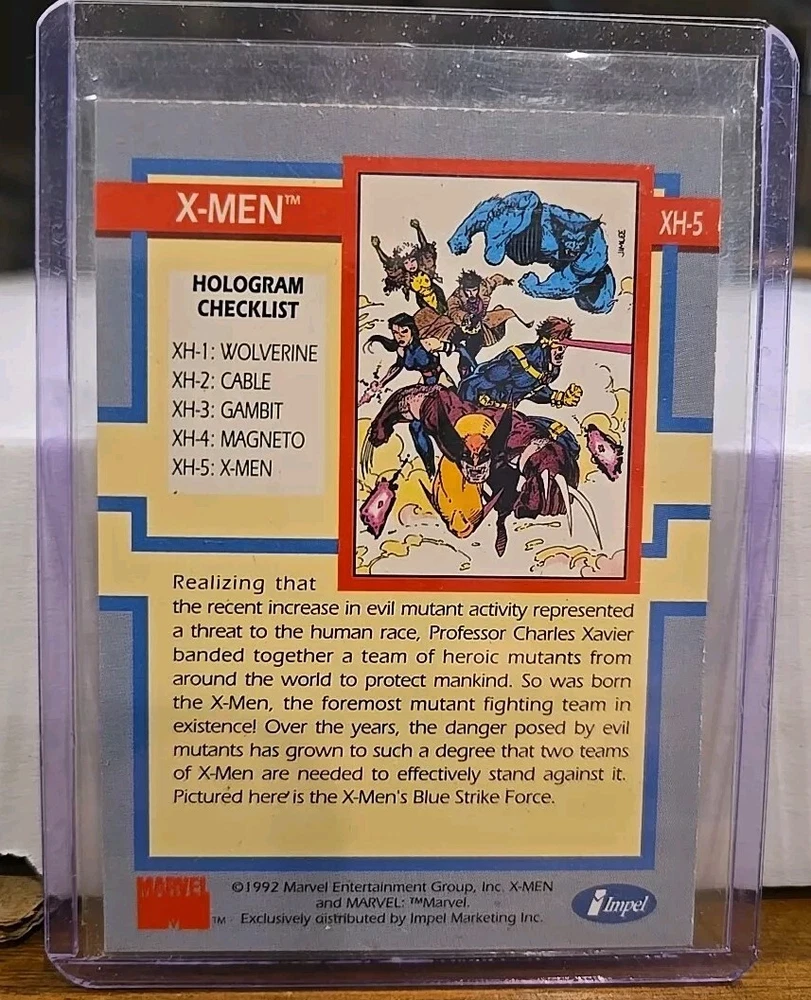 This X-Men Team trading card from 1992 is a must-have for any collector of non-sport trading cards. Featuring a hologram insert, this card is part of the Series 1 set from Impel and features some of the most iconic X-Men characters including Cable, Magneto, Wolverine, and Gambit. The card is in standard size and is in English language. The card is from the X-Men franchise and is numbered XH-5. It was manufactured by Impel in 1992. This trading card is a great addition to any collection and is perfect for fans of the X-Men.