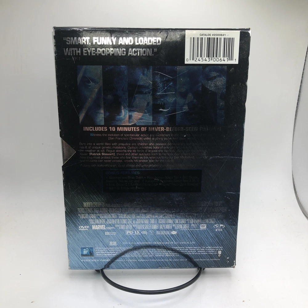 Rating: PG-13 gtin13: 0024543006411 Seller Notes: “Please see photos. All USED Movies will have some minor scratches and blemishes on cases.” Actor: Patrick Stewart, Hugh Jackman, Ian McKellen UPC: 0024543006411 Genre: Sci-Fi & Fantasy Edition: Sensormatic Country/Region of Manufacture: United States Format: DVD Movie/TV Title: X-Men Type: Movie Region Code: DVD: 1 (US, Canada...) Release Year: 2000 Director: Bryan Singer Franchise: X-Men Case Type: Tall/DVD Case Language: English