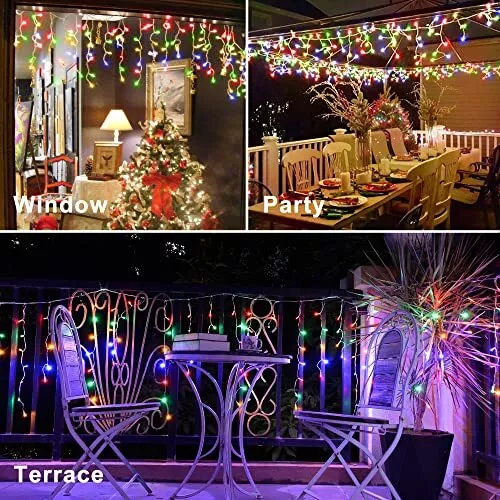 XURISEN 640 Xmas LED for Christmas Decoration Multicolor Christmas Decoration Ice Lights: These Ice String Lights are 66ft long with 120 drops, and they feature 640 quality crystal clear led lights.You can connect extra 66ft long strip for larger decorating projects too.HANGING FROM ROOF LINES, PORCHES FENCES AND RAILINGS,IT WILL INSTANTLY TRANSFORM YOUR DECORATED SPACE INTO FUN, RELAXING, COZY AND FESTIVE. 8 Lighting Modes: You can choose from 8 different lighting modes (Combination, In Waves, Sequential, Slo-glo, Chasing/Flash, Slow Fade, Twinkle/Flash, and Steady On.) for an extra festive display.CUSTOMIZE YOUR OWN MOOD LIGHTING,MAKING THE HOLIDAYS SPECIAL THIS YEAR WITH SOME BRIGHT LIGHTS AND COLORFUL CHEER. Timer and Memory Function: The outdoor Christmas lights built in timer function:6 hours on 18 hours off.Memory function can recover from the previous setting mode when you restart. Plug the led outdoor christmas lights into an outdoor timer, preferably one that automatically turns on when it gets dark out. UL Listed For Outdoor: XURISEN brand Christmas fairy string lights are IP44 waterproof and built to stand up against harsh environmental elements while maintaining safe connections.NOVEL AND CLASSIC DESIGN,IT’S PERFECT FOR DECORATING CHRISTMAS,NEW YEAR,ANNIVERSARY, BIRTHDAY ,VALENTINE'S DAY, WEDDING,ETC. High-End Christmas lights: The 8 modes are carefully designed to provide a variety of choices while greatly reducing energy consumption. The timer function precisely controls the time of use, realising the efficient use of energy and contributing to sustainable development.