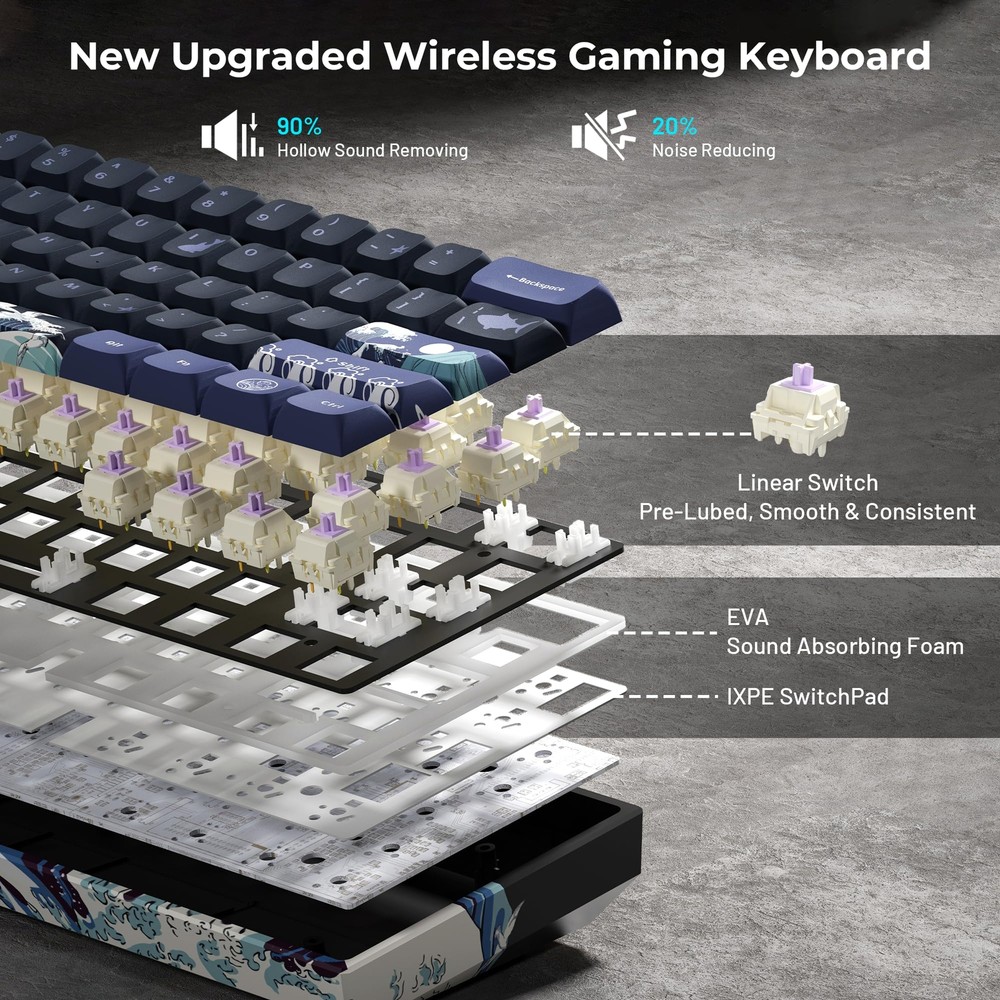 【Upgrades & Highlights】The custom keyboard supports hot-swap, providing more possibilities for customization. Comes with EVA sound absorbing foam and IXPE switch pad, which effectively reduces the hollow sound and provides more consistent typing feel. 【Great Wave Off Kanagawa Ergonomic Keyboard】This 60 percent keyboard is with unique Xvx Profile PBT keycap and themed shell, showing the coral sea pattern in 360 degrees, which have excellent touch experience and long serving time.The colorful design can bring a more pleasant mood to games or work. 【Triple Mode Connection Mini Keyboard】M61 PRO wireless keyboard supports bluetooth, 2.4 GHz and usb-c wired connection, including Bluetooth 5.0, 2.4GHz wireless mode, and USB C wired mode. This Bluetooth keyboard can connect up to 5 devices at the same time and is easily switched with the FN+ key combination. 【Compact 60% Keyboard】This 60% gaming keyboard has the perfect size and fits easily into most bags and backpacks. Additionally,this keboard can be used at anytime and anywhere, fits well with all environment, such as business, travel, gaming, office, home, school use and so forth. It is the best choice for gamers, employees and freelancers without doubt. 【Colorful Illuminated Keyboard】The keyboard itself provides with 19 RGB backlight modes,9 colors selection and 4 brightness levels for you to adjust,which can enhance your gameplay atmosphere and immersion at its maximum.19 RGB backlight modes allow you to work or play games in the dark. Of course, if you want to save electricity,turning off the lights is an available choice. 【Pro Software Customizable Keyboard】Using the certain software to design your own models and effects. Macros with different key bindings and shortcuts can greatly improve your work efficiency. ('Music Syncing' mode enables rhythmic lighting patterns from music played).