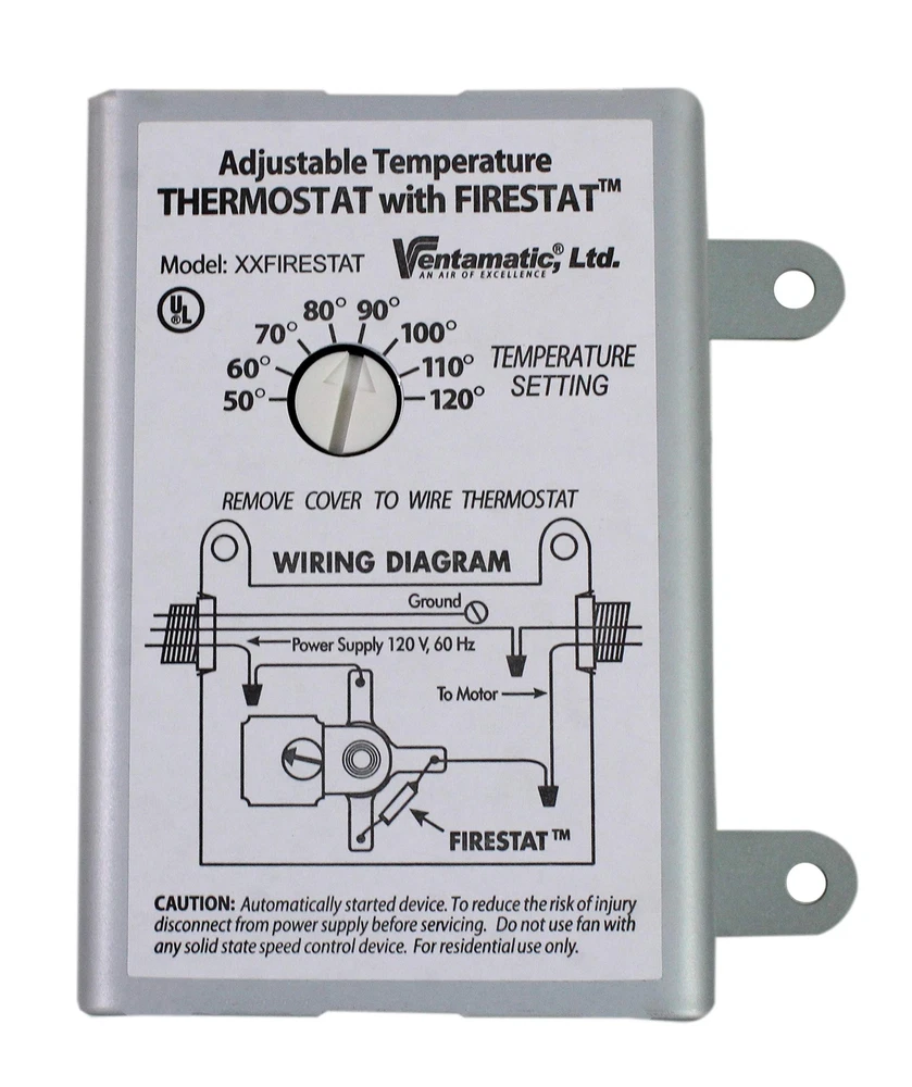 XXFIRESTAT 10-Amp Adjustable Programmable Thermostat with Firestat for Power Attic Ventilators, Replacement Thermostat , White FIRESTAT THERMOSTAT: The Firestat Thermostat controls power attic ventilators. The Firestat Temperature Range is 183°F at which point it cuts off the appliance. ADJUSTABLE THERMOSTAT: The Thermostat is adjustable by the use with a simple screw driver adjustment. It has adjustable bi-metallic switch. ENERGY EFFICIENT POWER ATTIC VENTILATOR: It provides energy-efficient operation of power attic ventilators and the temperature ranges from 50°F to 120°F. REPLACEMENT THERMOSTAT: This Replacement Thermostat controls power attic ventilators to promote the equalization of temperatures inside and outside your attic. Firestat safety feature shuts fan off at 183F Controls up to three units, not to exceed 10 amps. PROGRAMMABLE THERMOSTAT : This thermostat provides 10 years of . It is of opening size 4.8 x 2.5 x 4.8 inches Product Description Specification: • Overall Dimension: 4.8 x 2.5 x 4.8 inches • Item Weight: 1 pound • Size: 10 • Color: White • Power Source: Corded-electric • Temperature: 50°F to 120°F • Voltage: 120 volt • : 10 Years This Replacement Thermostat controls power attic ventilators to promote the equalization of temperatures inside and outside your attic. Temperature Range F 183, Accessory Type Ventilation accessory. Firestat safety feature shuts fan off at 183F Controls up to three units, not to exceed 10 amps. It provides energy-efficient operation of power attic ventilators Temperature range from 50 degrees to 120 degrees Fahrenheit Temperature is fan On/Off 10-Amp adjustable thermostat Adjustable bi-metallic switch Product Description This Replacement Thermostat controls power attic ventilators to promote the equalization of temperatures inside and outside your attic. Temperature Range F 183, Accessory Type Ventilation accessory. Firestat safety feature shuts fan off at 183F Controls up to three units, not to exceed 10 amps. From the Manufacturer 10-Amp automatic adjustable thermostat with Firestat. For the energy efficient control of roof or gable power attic ventilators. Temperature range from 50 to 120 Degree Fahrenheit. From the Manufacturer 10-Amp automatic adjustable thermostat with Firestat. For the energy efficient control of roof or gable power attic ventilators. Temperature range from 50 to 120 Degree Fahrenheit. Shipping We offer FREE shipping on all orders! We ship within Three business days of payment, usually sooner. We use a selection of shipping services such as UPS, FedEx, USPS etc. We only ship to the lower 48 states, no APO/FPO addresses or PO Boxes allowed. Local pickups and combined shipping options are not provided at this time. Return You can return a product for up to 30 days from the date you purchased it. Any product you return must be in the same condition you received it and in the original packaging. Please keep the receipt. Payment We accept payment by any of the following methods: PayPal Please pay as soon as possible after winning an auction, as that will allow us to post your item to you sooner! Feedback Customer satisfaction is very important to us. If you have any problem with your order, please contact us and we will do our best to make you satisfied. Contact Us If you have any queries, please contact us via ebay. We usually respond within 24 hours on weekdays. Please visit our eBay store to check out other items for sale! Thank you for shopping at our store.