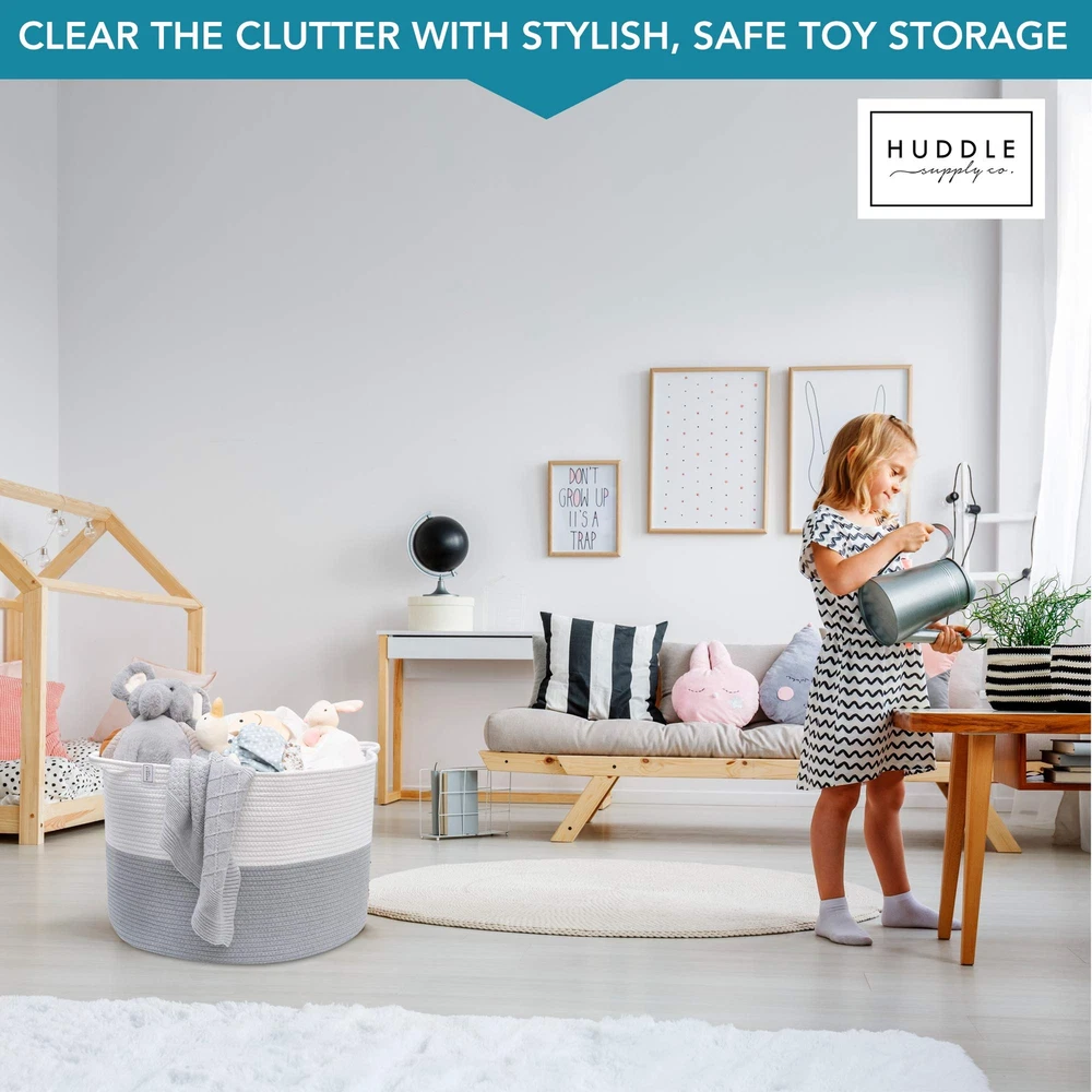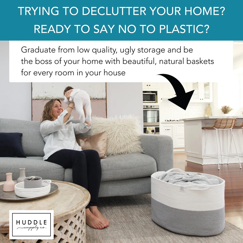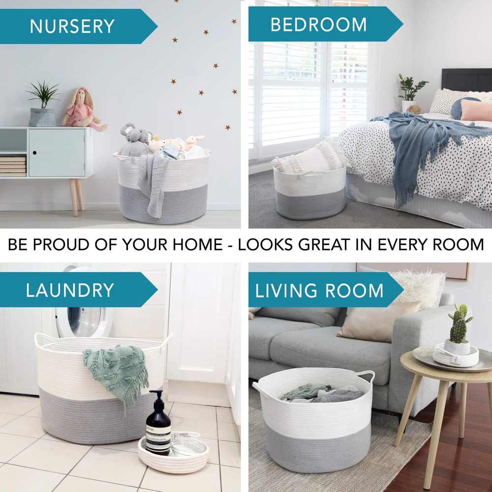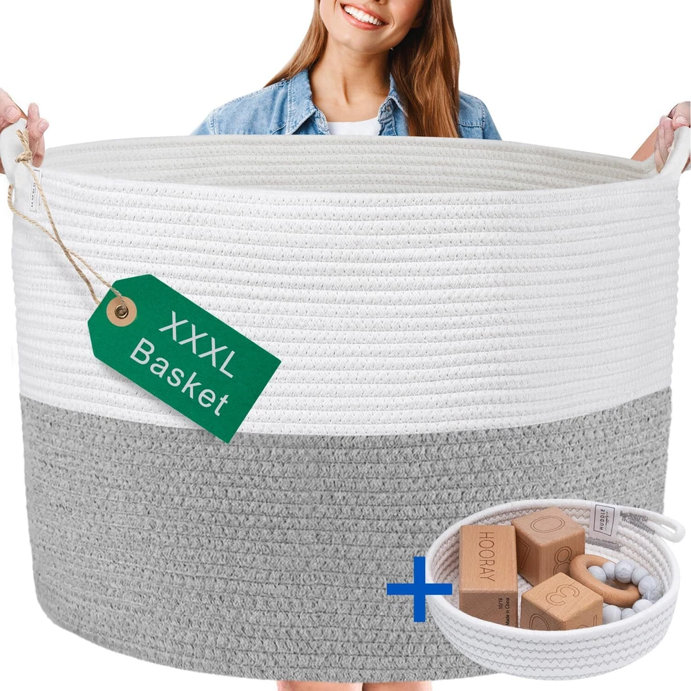 XXXL WASHABLE Blanket Basket Large 2PCs Blanket Storage Living Room - XXX Large Basket for Storing Blankets Toy Basket + Small Basket | Basket for Blankets (Grey and White) XXX Large size: 22 inch x 22 inch x 14 inches which makes the perfect blanket basket, toy basket, throw basket, cushion basket and much more No More Lost Keys, Remotes, Phones: For a short time we're sending a bonus small woven storage basket which is perfect for decor and small item storage Get a Big Basket You Love: other large storage baskets unravel, collapse and omit toxins - Huddle's large baskets for storage use denser cotton ropes so they hold their shape, and last a lifetime Machine Washable: Yes really! Finally give clutter a home your whole family can use - throw your extra large storage basket in the wash to refresh! How awesome The Big Basket Your Friends Will All Want: Your stylish woven rope baskets with handles have so many uses - basket for blankets (blanket holder), towel basket, toy baskets storage kids, rope laundry basket, pillow basket, throw blanket basket, shoe basket Organize with Style: Designed to complement any space and transform messy chaos into chic order, this XXX-Large blanket basket is a classy solution for keeping your home neat and tidy Invest in the Best: Made from 100% cotton, our thick rope baskets for storage offer superior durability and shape retention for dependable and sturdy organization that will stand the test of time Elevate Everyday Tasks: Our large laundry basket is where laundry meets luxury, bringing together practicality and elegance, infusing a touch of sophistication into mundane household chores From Our Family to Yours: At Huddle Supply Co, we are a small family business that understands the needs of family living and crafts every product with love and dedication to transform your living space into an orderly oasis Refresh, Don't Replace: These round baskets for organizing are machine washable for effortless care and long-term use, bringing functional design to your home and making maintenance a breeze Shipping We offer FREE shipping on all orders! We use a selection of shipping services such as UPS, FedEx, USPS etc. We only ship to the lower 48 states, no APO/FPO addresses or PO Boxes allowed. Local pickups and combined shipping options are not provided at this time. Return You can return a product for up to 30 days from the date you purchased it. Any product you return must be in the same condition you received it and in the original packaging. Please keep the receipt. Payment We accept payment by any of the following methods: PayPal Please pay as soon as possible after winning an auction, as that will allow us to post your item to you sooner! Feedback Customer satisfaction is very important to us. If you have any problem with your order, please contact us and we will do our best to make you satisfied. Contact Us If you have any queries, please contact us via ebay. We usually respond within 24 hours on weekdays. Please visit our eBay store to check out other items for sale! Thank you for shopping at our store.