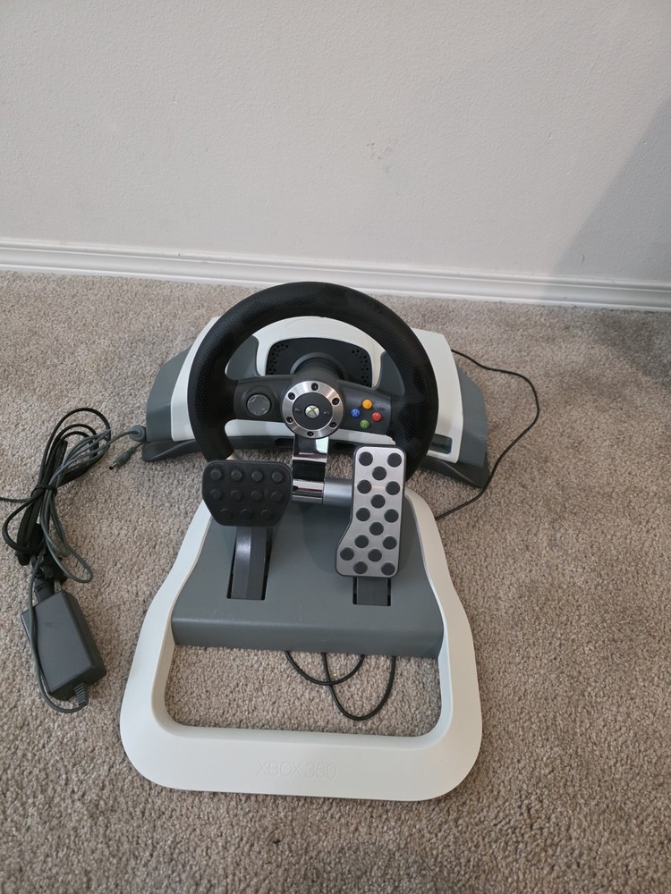 The Microsoft Xbox 360 Wireless Racing Steering Wheel with Pedals is a white plastic accessory designed for the Microsoft Xbox 360 console. It allows for single-player racing games and features wireless connectivity within a 5-10m range. The steering wheel includes a set of pedals and is compatible with various racing games. This officially licensed Microsoft product is ideal for enhancing your racing gaming experience with realistic steering control.
