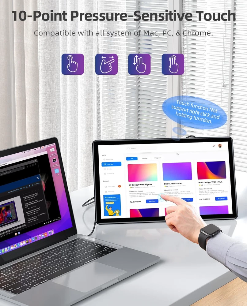 2024 Innovative Adjustable Kickstand: The First monitor achieving freeswitching between landscape and portrait mode in 0-110°adjustable viewing angle, fits your different working requirements perfectly; All ports integrated on the mini kickstand, makes all cables invisible automatically and connections more stable; Before using the monitor, please download and read the User Guide below 10-point Capacitive Touchscreen Monitor: with all system of PC, & Chrome; Adopted G+FF technology, support much more precise and sensitive touch, no extra driver needed, just connect the USB cable to your device to achieve the touch; NOTE: To realize the touch function, there must be a USB C to A or USB C to C cable connected to the USB C port on the monitor to your device directly; The touch function does not support right-click and long-press to activate the option operation Full-featured Port Only for : Built in Standard HDMI port that plug-in test over 5000 times and more 2000 times than mini HDMI port; USB 3.0 port that can connect to keyboard or directly and without any more adapter; Type C port that support usb-c cable to display & power First Portable Screen with 2000:1 Contrast Ratio: The 2000:1 high contrast ratio of the hardware will make the screen have better "shading performance", allowing you to see more dark and bright details, but will not overburden the bright parts; It is roughly equivalent to a natural HDR effect of "non-brightness and non-coding"; 100% sRGB High Color Gamut deliver you brighter, crisper, and more natural colors Entertainment Upgraded with Colorful Flowing Atmosphere Lights: First portable monitor built in Ambient Light and it has 10 working mode: Vivid, Colorful, White, Purple, Blue, Cyan, Green, Yellow, Orange, Red, put you in the world of gaming e-sports; Low-power Mode has also been added to this monitor, just choose what you need; We provide 3-year service and 24-hour ; Please rest assured that any issues will be promptly resolved within 8 hours