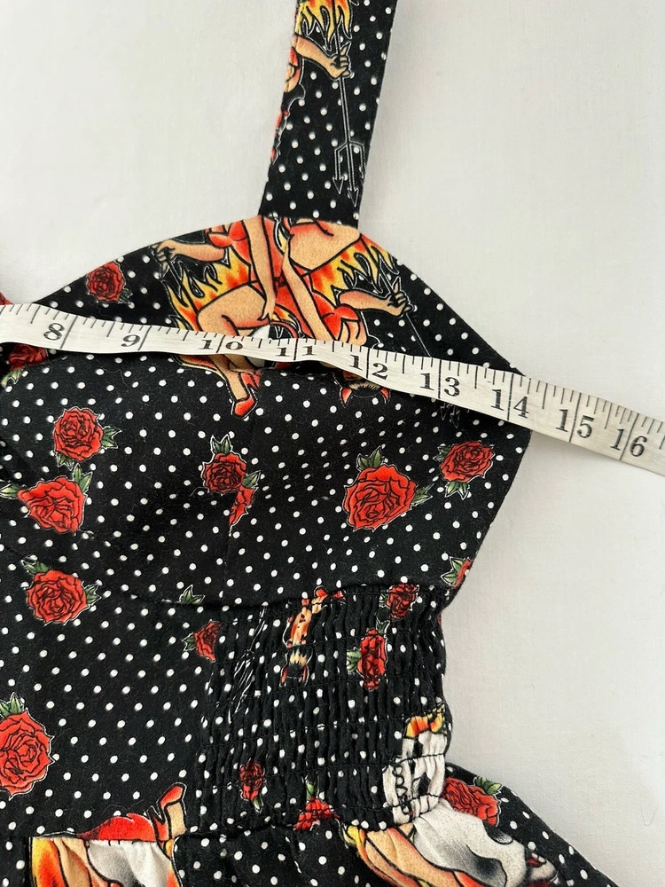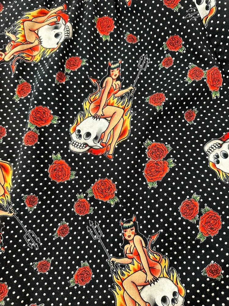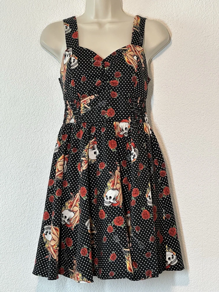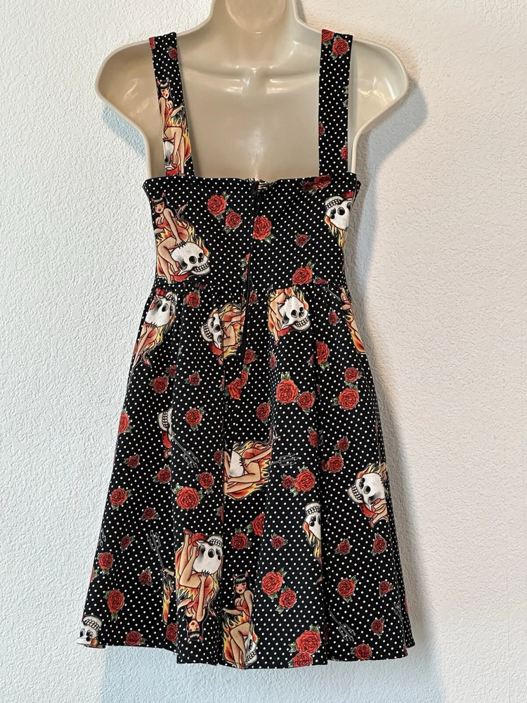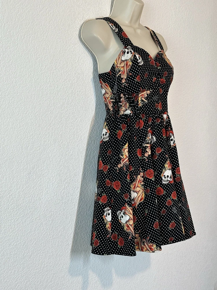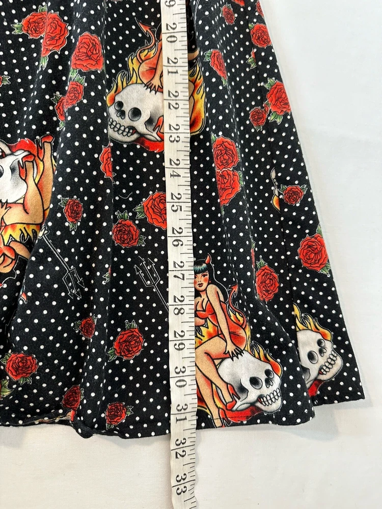 Y2K Hot Topic Red and Black Skulls Roses Swing Dress Goth Pin Up Size Medium Good Condition. SEE PICTURES & MEASUREMENTS