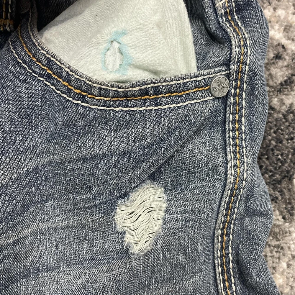 • Great condition, just a small hole in left pocket + missing button on back right pocket (pictured last and item discounted). Distressing on front is manufactured & intentional by designer • Waist: 32" Inseam: 32", Leg Opening: 9" • Items shipped everyday Monday through Saturday. Feel free to message if you have additional questions.