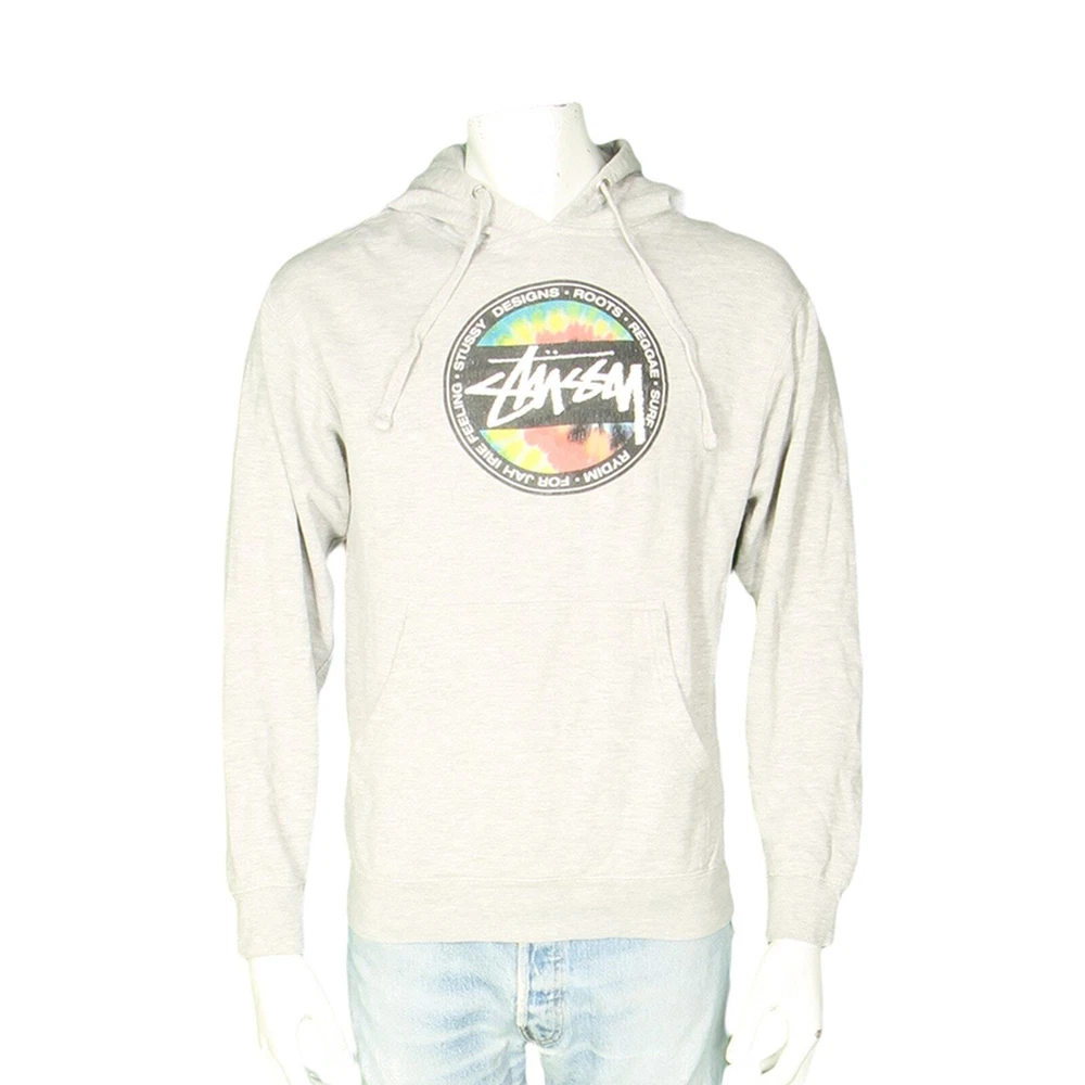 Y2K Stussy Designs Roots Reggae Surf Rydim For Jah Irie Feeling Skateboard Heathered Gray Hoodie Sweatshirt S material: 80% cotton 20% polyester made in China color: heathered gray condition: small hole and a stain on one of the sleeves, the print has cracks, moderate amount of wear size on tag: S mannequin is 6' 2" and a size medium length (from the front on either side of the collar down to the bottom edge): 25 armpit to armpit: 20 shoulder: 19.5 sleeve length: 22 all measurements are in inches and taken with the garment laying flat any major defect will be mentioned and/or photographed 16106 6j8g6 7g5d2